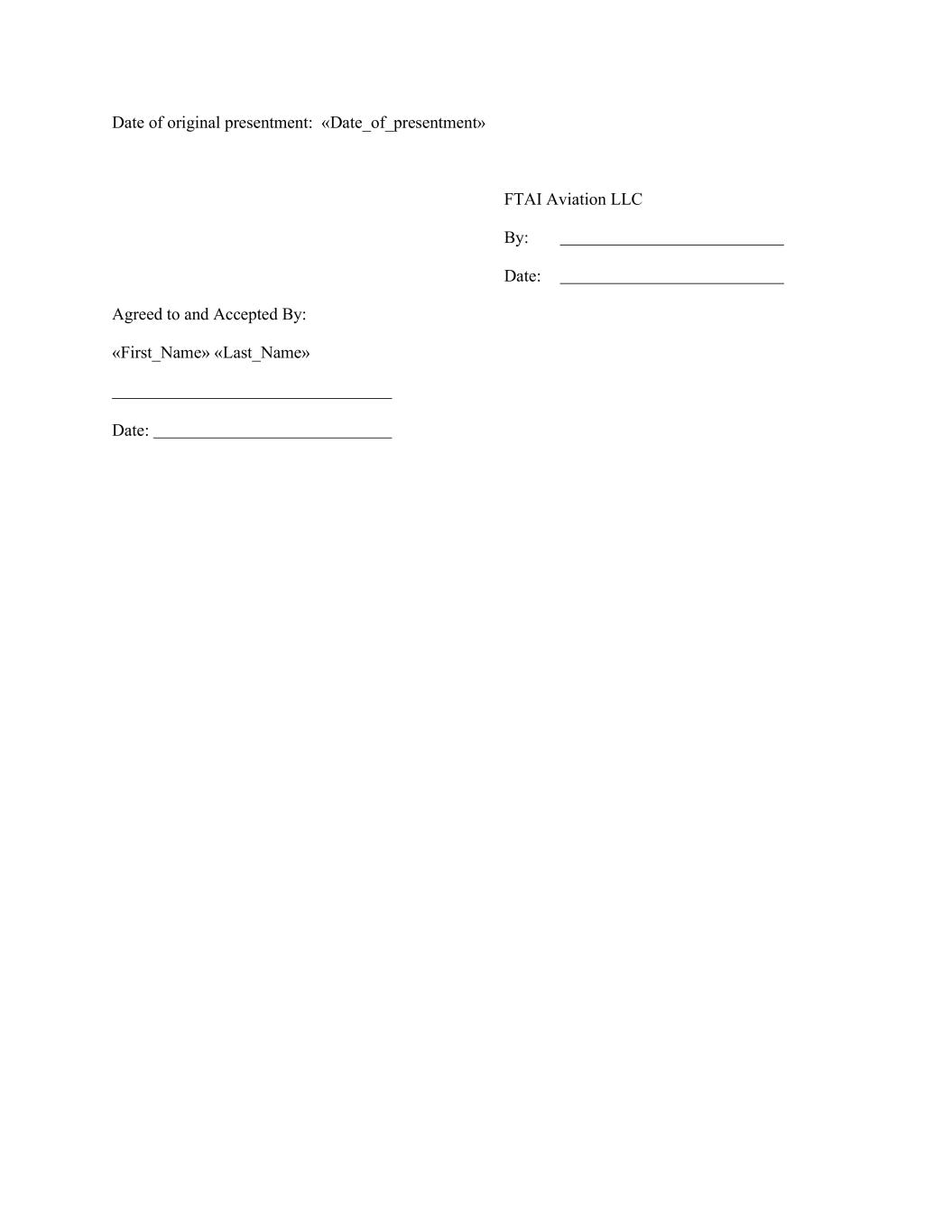 原始呈现日期:« date _ of _ presentment » FTAI Aviation LLC由:日期:同意并接受者:« first _ name » « last _ name »日期: