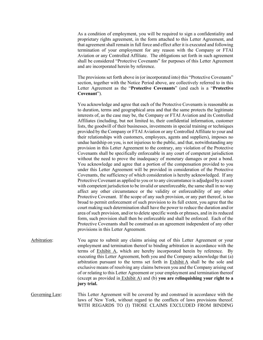 作为受雇的条件,您将被要求签署一份保密和所有权协议,其形式为本信函协议所附,该协议在该协议签署后以及在您因任何原因与公司或FTAI Aviation或任何受控关联公司终止雇佣后仍完全有效。就本信函协议而言,此类协议中规定的义务应被视为“保护性契约”,并通过引用并入本文。本“保护性盟约”一节中(或纳入)的上述规定,连同上述通知期限,在本函协议中统称为“保护性盟约”(每一项均为“保护性盟约”)。您承认并同意,每项保护性契约在期限、条款和地理区域方面均属合理,并且同样保护公司或FTAI Aviation及其受控关联公司(视情况而定)的合法利益(包括但不限于其机密信息、客户名单、其业务的商誉、对公司或FTAI Aviation或您的任何受控关联公司提供的特殊培训或技术的投资以及他们与客户、员工、代理和供应商的关系),不会对您造成不必要的困难,也不会损害公众,并且尽管本信函协议中有任何相反的规定,任何违反保护性契约的行为均应在任何有管辖权的法院具体强制执行,而无需证明金钱损害赔偿不足或过押保证金。贵公司承认并同意,根据本函件协议向贵公司提供的补偿的一部分将作为保护性契约的对价提供,对价的充分性特此确认。如任何适用于你或任何情况的保护性盟约被有管辖权的法院裁定为无效或不可执行,则该等盟约绝不影响任何其他情况或任何其他保护性盟约的有效性或可执行性。如果任何此类规定或其任何部分的范围过于宽泛,无法允许充分执行此类规定,则你同意作出此类裁定的法院有权缩短此类规定的期限和/或区域,和/或删除特定的词语或短语,并且在其缩减形式中,此类规定随后应可强制执行并应予以执行。每一项保护性契约均应被解释为独立于本信函协议中任何其他条款的协议。仲裁:您同意根据附件 A的条款将因本信函协议或您的受雇及其终止而引起的任何索赔提交具有约束力的仲裁,这些条款在此通过引用并入本文。通过执行本信函协议,贵公司和本公司均确认(a)根据附件 A中规定的条款进行仲裁应是解决贵公司与本公司之间因本信函协议或您受雇于该协议或终止该协议而引起或与之有关的任何索赔的唯一和排他性方式(除附件 A中规定的情况外),以及(b)您正在放弃您接受陪审团审判的权利。准据法:本信函协议将由纽约州法律涵盖并根据其解释,而不考虑其法律冲突条款。关于(i)那些被排除在具有约束力之外的索赔