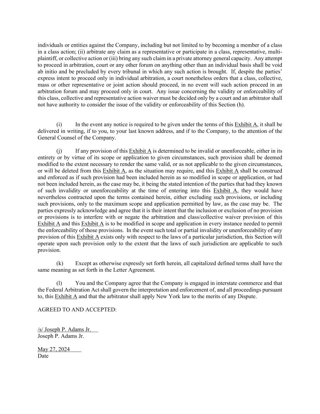 针对公司的个人或实体,包括但不限于成为集体诉讼中的集体成员;(ii)作为代表仲裁任何索赔或参与集体、代表、多原告或集体诉讼,或(iii)以私人总检察长身份提出任何此类索赔。任何试图以个人以外的任何理由在仲裁、法院或任何其他法院进行诉讼的行为,应从一开始就无效,并由提起任何此类诉讼的每个法庭予以排除。如果尽管当事人明确表示只打算在个别仲裁中进行,但法院仍然命令集体、集体、集体或其他代表或联合诉讼应进行,则在任何情况下,这种诉讼都不会在仲裁法院中进行,只能在法院进行。任何有关这类、集体和代表诉讼放弃的有效性或可执行性的问题必须仅由法院裁决,仲裁员无权审议本节(h)的有效性或可执行性问题。(i)如根据本附件 A的条款须发出任何通知,则该通知须以书面送达(如送达予阁下)至阁下最后为人所知的地址,如送达予公司,则须送交公司总法律顾问注意。(j)如果本附件 A的任何规定被确定为全部无效或不可执行,或因其范围或适用于特定情况而被确定为无效或不可执行,则该规定应被视为在必要的范围内进行了必要的修改,以使同一规定有效,或不适用于特定的情况,或将视情况需要从本附件 A中删除,而本附件 A应被解释和强制执行,如同该规定已在范围或适用上如此修改而列入本文,或未列入本文,视情况而定,如果各方当事人在订立本附件 A时知道此类无效或不可执行,则他们本应根据此处包含的条款订立合同,要么排除此类规定,要么仅包括此类规定,仅限于法律(视情况而定)允许的最大范围和适用。各方当事人明确承认并同意,其意图是,没有任何条款或规定的列入或排除是为了干扰或否定本附件 A和本附件 A的仲裁和集体/集体放弃条款,在允许这些条款的可执行性所需的每一种情况下,都应在范围和适用上进行修改。如果本附件 A的任何规定完全或部分无效或不可执行仅存在于特定司法管辖区的法律中,则本节将仅在该司法管辖区的法律适用于该规定的范围内对该规定施行。(k)除本文另有明确规定外,所有大写的定义术语应具有与信函协议中规定的相同含义。(l)您和公司同意,公司从事州际商业,本附件 A的解释和强制执行以及依据该A进行的所有程序均由《联邦仲裁法》管辖,并且仲裁员应对任何争议的是非曲直适用纽约法律。同意并接受:/s/Joseph P. Adams Jr.Joseph P. Adams Jr. 2024年5月27日