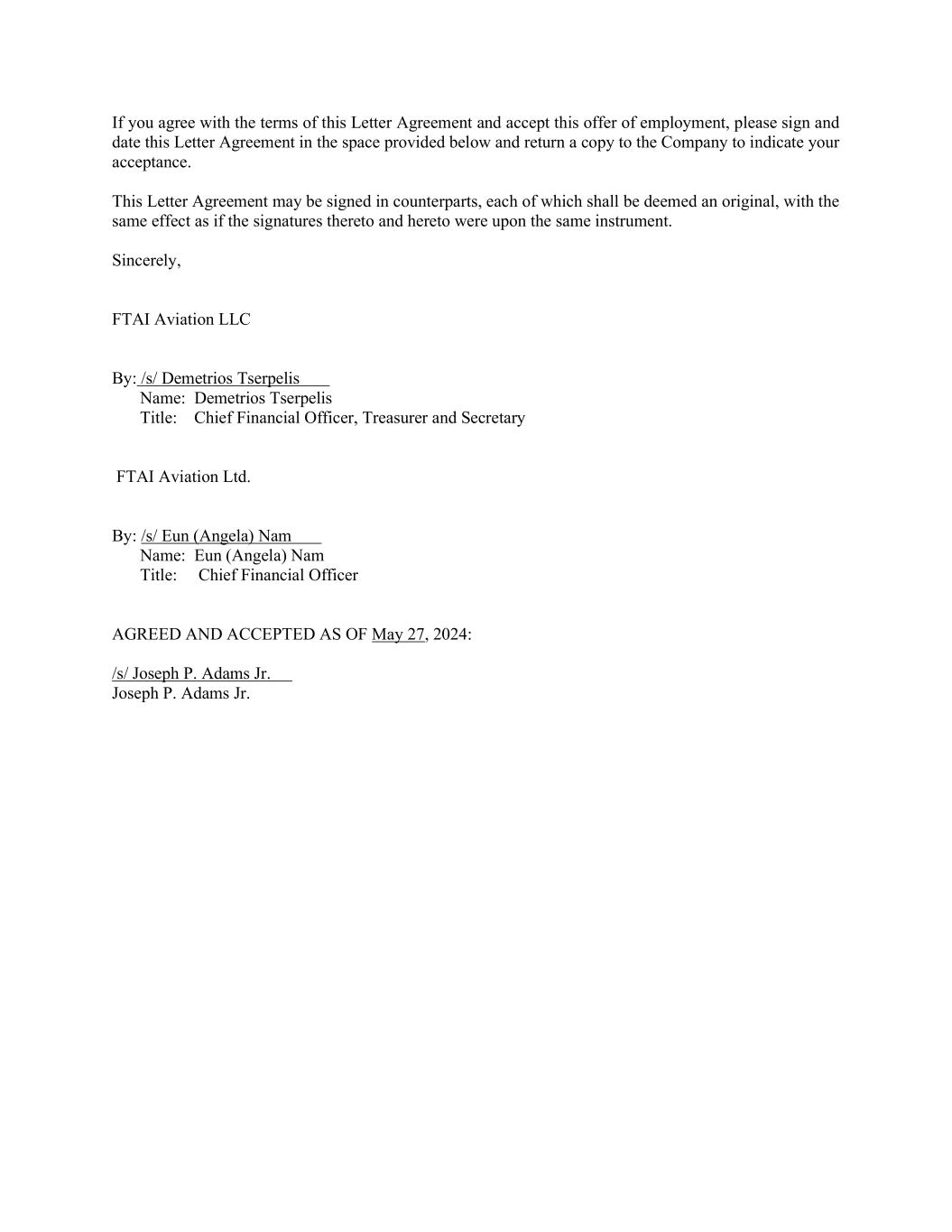 如果您同意本信函协议的条款并接受本聘用,请在下面提供的空格中签署本信函协议并注明日期,并将副本退还公司以表明您接受。本函件协议可在对应方签署,每份协议应视为正本,其效力与其与本协议的签署在同一文书上相同。此致,FTAI Aviation LLC by:/s/demetrios tserpelis姓名:demetrios tserpelis职务:首席财务官、司库兼秘书Ftai Aviation Ltd.TERM2 by:/s/eun(Angela)nam姓名:eun(Angela)nam职务:首席财务官同意并接受截至2024年5月27日:/s/e.j.j.j.j.j.j.j.j.j.j.j.j.j.j.j.j.j.j.j.j.j.j.j.j.j.j.j.j.5