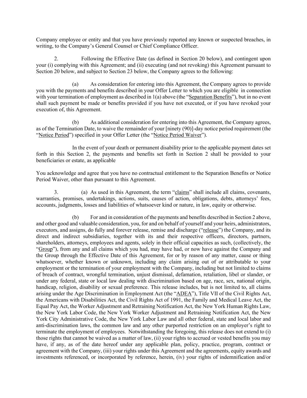 公司员工或实体,并且您之前已向公司总法律顾问或首席合规官书面报告了任何已知或疑似违规行为。2.在生效日期(定义见下文第20条)之后,并视贵方(i)遵守本协议而定;及(ii)根据下文第20条执行(而非撤销)本协议,并在符合下文第23条的情况下,本公司同意以下事项:(a)作为订立本协议的代价,本公司同意向贵方提供与上述1(a)所述的终止雇用有关的贵方要约函中所述的付款和福利(“离职福利”),但在任何情况下,如果您未执行或已撤销您对本协议的执行,则不得支付此类款项或提供利益。(b)作为订立本协议的额外代价,公司同意,自终止日期起,豁免贵方在要约函件中指明的余下的[九十(90)]天通知期规定(“通知期”)(“通知期豁免”)。如果你在本条第2款规定的适用付款日期之前死亡或永久残疾,第2款规定的付款和福利应提供给你的受益人或遗产,如适用,你承认并同意,除根据本协议外,你没有合同规定的离职福利或通知期豁免的权利。3.(a)本协议中使用的“索赔”一词应包括所有索赔、契约、保证、承诺、承诺、诉讼、诉讼、诉讼因由、义务、债务、律师费、账目、判决、损失和法律、权益或其他方面的任何种类或性质的责任。(b)为并为考虑上文第2节所述的付款和利益,以及其他良好和有价值的对价,你方代表并代表你本人和你的继承人、管理人、遗嘱执行人和受让人,完全和永久地解除、免除和解除(“解除”)公司及其直接和间接子公司及其各自的高级职员、董事、合伙人、股东、律师、雇员和代理人(统称“集团”),从你所拥有的任何和所有索赔中,可能已经拥有,或现已于本协议生效日期前,因任何已知或未知的事项、因由或事由对公司及集团提出控告,包括因你受雇或终止你在公司受雇而产生或可归因的任何申索,包括但不限于违反合约、错误解雇、不公正解雇、诽谤、报复、诽谤或诽谤的申索,或根据任何联邦、州或地方法律处理基于年龄、种族、性别、国籍、残疾、宗教、残疾或性偏好的歧视。本新闻稿包括但不限于根据《就业年龄歧视法案》(“ADEA”)、《民权法案》第七章、《美国残疾人法案》、1991年《民权法案》、《家庭和病假法案》、《同工同酬法》、《工人调整和再培训通知法》、《纽约人权法》、《纽约劳工法》、《纽约工人调整和再培训通知法》、《纽约市行政法》、《纽约劳工法》以及所有其他联邦、州和地方劳工和反歧视法律提出的所有索赔,普通法和任何其他据称对雇主终止雇用雇员的权利的限制。尽管有上述规定,本解除并不延伸至(i)作为法律事项不能放弃的权利,(ii)截至本协议日期,根据与公司的任何适用计划、政策、实践、计划、合同或协议,您可能拥有的应计或既得利益(如有)的权利,(iii)您在本协议下的权利以及引用或通过引用并入本文的协议、股权奖励和投资,(iv)您的赔偿权利和/或