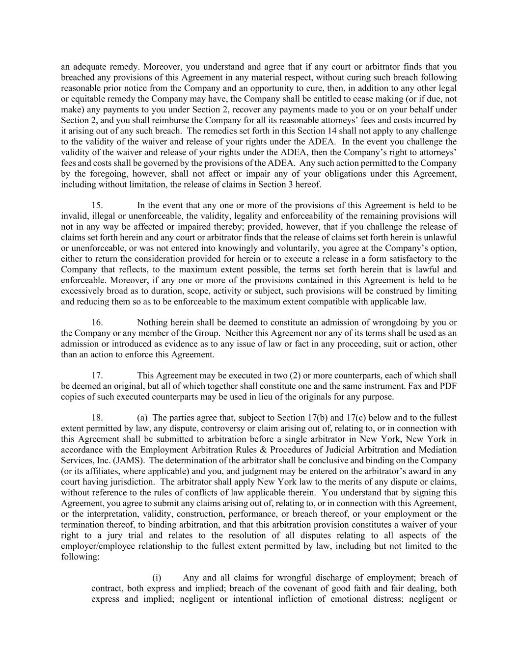 适当的补救措施。此外,你方理解并同意,如果任何法院或仲裁员认定你在任何重大方面违反了本协议的任何条款,但在公司发出合理的事先通知并获得补救机会后仍未纠正此类违约行为,那么,除了公司可能拥有的任何其他法律或衡平法补救措施外,公司将有权停止根据第2条向你方支付(或如果到期,则不支付)任何款项,收回根据第2条向你方或代你方支付的任何款项,并且您应向公司偿还其因任何此类违约行为而产生的所有合理的律师费和费用。第14节中规定的补救措施不适用于对根据ADEA放弃和释放您的权利的有效性提出的任何质疑。如果您对ADEA项下您的权利的放弃和解除的有效性提出质疑,那么公司的律师费和费用权利将受ADEA条款的管辖。然而,上述允许公司采取的任何此类行动不应影响或损害贵公司在本协议下的任何义务,包括但不限于解除本协议第3节中的索赔。15.如果本协议的任何一项或多项条款被认定为无效、非法或不可执行,则其余条款的有效性、合法性和可执行性不会因此而受到任何影响或损害;但前提是,如果您对此处所述索赔的解除提出质疑,并且任何法院或仲裁员发现此处所述索赔的解除是非法的或不可执行的,或者不是在知情和自愿的情况下达成的,您同意公司的选择,要么返还此处规定的对价,要么以公司满意的形式执行一项免责声明,该声明最大限度地反映了此处规定的合法且可执行的条款。此外,如果本协议所载的任何一项或多项规定被认为在期限、范围、活动或主体方面过于宽泛,则将通过限制和减少这些规定来解释这些规定,以便在与适用法律相适应的最大限度内可强制执行。16.本文中的任何内容均不应被视为构成承认贵公司或本公司或本集团任何成员的不当行为。除强制执行本协议的行动外,本协议或其任何条款均不得用作对任何程序、诉讼或诉讼中的任何法律或事实问题的承认或引入作为证据。17.本协议可由两(2)个或更多的对应方签署,每一方应被视为正本,但所有这些共同构成一份同一文书。此类被执行对应方的传真和PDF副本可用于任何目的以代替原件。18.(a)双方同意,在符合下文第17(b)和17(c)条的规定下,并在法律允许的最大范围内,由本协议引起、与本协议有关或与本协议有关的任何争议、争议或索赔,应根据《司法仲裁和调解服务公司(JAMS)的就业仲裁规则和程序》提交纽约州纽约市的单一仲裁员进行仲裁。仲裁员的裁定应是决定性的,对公司(或其关联公司,如适用)和你们具有约束力,可在任何有管辖权的法院就仲裁员的裁决作出判决。仲裁员应对任何争议或索赔的是非曲直适用纽约法律,而无需参考其中适用的法律冲突规则。您了解签署本协议,即表示您同意将因本协议引起、与本协议有关或与本协议有关的任何索赔,或对本协议的解释、有效性、解释、履行、或违反本协议,或您的受雇或终止本协议,提交具有约束力的仲裁,并且本仲裁条款构成您放弃陪审团审判的权利,并涉及在法律允许的最大范围内解决与雇主/雇员关系的所有方面有关的所有争议,包括但不限于以下各项:(i)任何及所有错误解除雇用的申索;明示及默示的违反合约;明示及默示的违反诚信及公平交易之契约;疏忽或故意造成情绪困扰;疏忽或