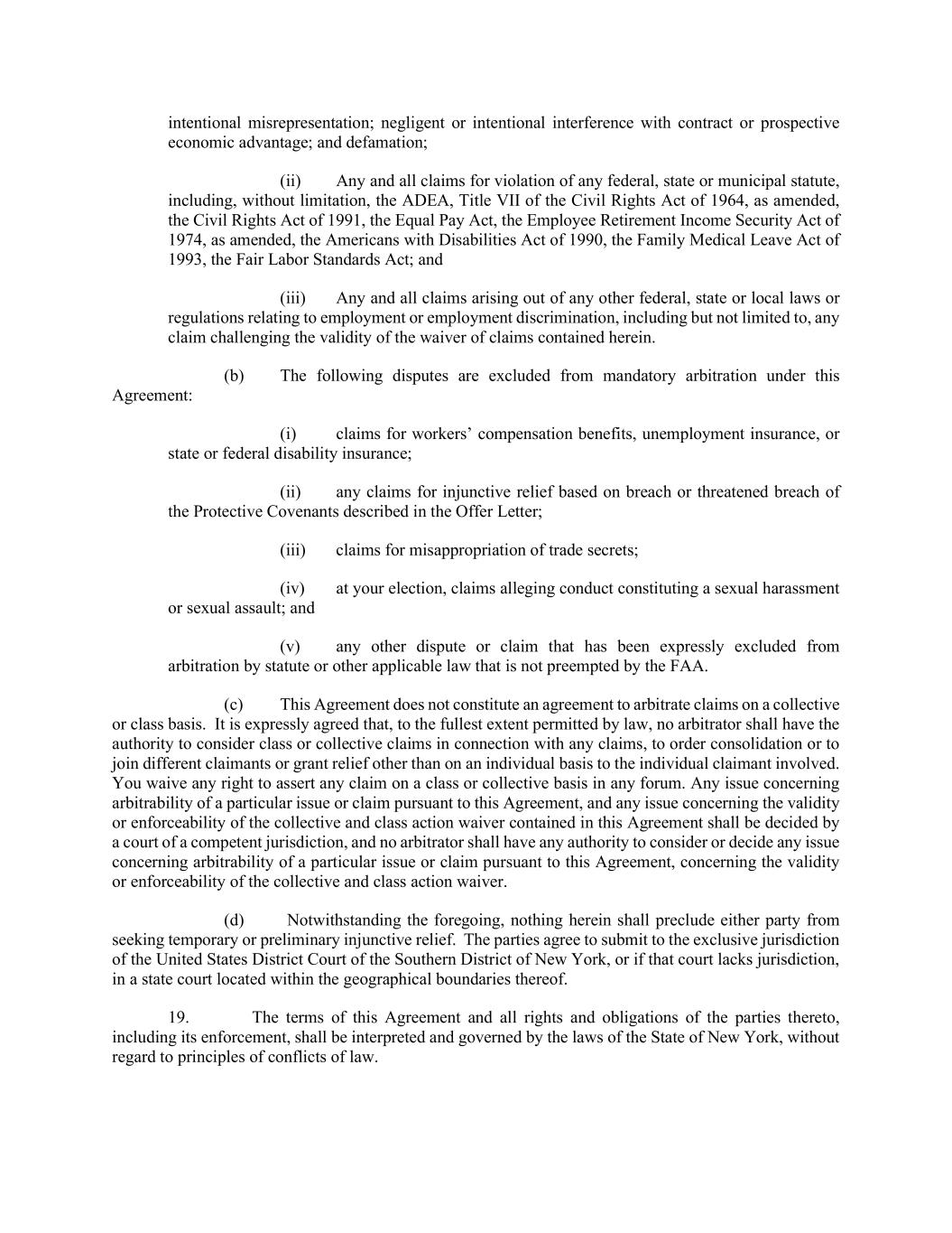 故意虚假陈述;疏忽或故意干扰合同或预期经济优势;以及诽谤;(ii)任何和所有违反任何联邦、州或市法规的索赔,包括但不限于经修订的1964年《民权法案》第七章ADEA、1991年《民权法案》、《同工同酬法案》、经修订的1974年《雇员退休收入保障法》、1990年《美国残疾人法案》、1993年《家庭病假法案》、《公平劳动标准法》;(iii)任何和所有因任何其他联邦、与就业或就业歧视有关的州或地方法律或法规,包括但不限于对此处包含的放弃索赔的有效性提出质疑的任何索赔。(b)以下争议被排除在本协议规定的强制性仲裁之外:(i)对工人赔偿福利、失业保险或州或联邦残疾保险的索赔;(ii)任何基于违反或威胁违反要约函中描述的保护性契约的禁令救济索赔;(iii)对盗用商业秘密的索赔;(iv)在你的选择下,声称行为构成性骚扰或性侵犯的索赔;以及(v)任何其他已被法规或其他适用法律明确排除在仲裁之外但未被FAA优先考虑的争议或索赔。(c)本协议不构成在集体或集体基础上仲裁债权的协议。明确同意,在法律允许的最大范围内,任何仲裁员均无权考虑与任何索赔有关的集体或集体索赔、下令合并或加入不同的索赔人或给予所涉个人索赔人非个别基础的救济。您放弃在任何论坛以集体或集体方式主张任何索赔的任何权利。根据本协议涉及特定问题或索赔的可仲裁性的任何问题,以及涉及本协议所载集体和集体诉讼放弃的有效性或可执行性的任何问题,均应由有权管辖的法院作出裁决,任何仲裁员均无权考虑或决定根据本协议涉及特定问题或索赔的可仲裁性的任何问题,涉及集体和集体诉讼放弃的有效性或可执行性。(d)尽管有上述规定,本文中的任何规定均不妨碍任何一方寻求临时或初步禁令救济。双方同意服从纽约南区美国地区法院的专属管辖权,或者如果该法院缺乏管辖权,则在位于其地理边界内的州法院。19.本协定的条款及其各方的所有权利和义务,包括其执行,应由纽约州的法律解释和管辖,而不考虑法律冲突的原则。