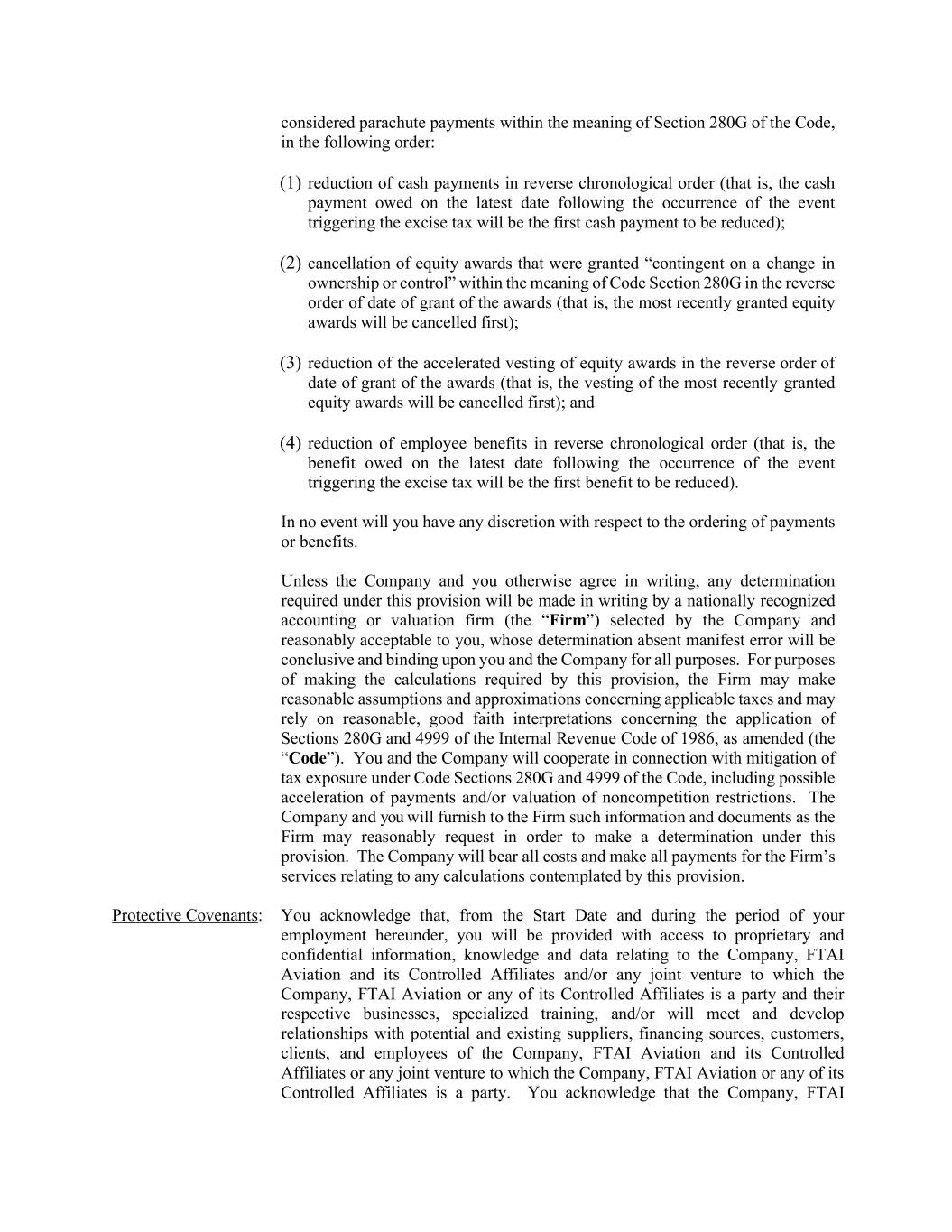 按照以下顺序考虑《守则》第280G条含义内的降落伞付款:(1)按时间倒序减少现金付款(即在触发消费税的事件发生后的最晚日期所欠的现金付款将是第一笔减少的现金付款);(2)取消根据《守则》第280G条含义内按授予日期倒序排列的“取决于所有权或控制权的变化”而授予的股权奖励(即最近授予的股权奖励优先取消);(3)按奖励授予日期的倒序减少股权奖励的加速归属(即先取消最近授予的股权奖励的归属);(4)按时间倒序减少员工福利(即触发消费税事件发生后的最晚日期所欠福利将是首先减少的福利)。在任何情况下,您都不会对付款或福利的排序有任何酌处权。除非本公司与贵公司另有书面约定,否则本条文所要求的任何确定将由本公司选定并为贵公司合理接受的国家认可的会计或估价事务所(“事务所”)以书面作出,其确定不存在明显错误将是决定性的,并对贵公司和本公司具有所有目的的约束力。为进行本条规定所要求的计算,公司可就适用的税项作出合理的假设和近似值,并可依赖关于适用经修订的1986年《国内税收法典》(“法典”)第280G和4999节的合理、善意的解释。贵公司和公司将就根据《守则》第280G和4999节减轻税务风险进行合作,包括可能的加速付款和/或评估不竞争限制。本公司和你们将向本公司提供本公司可能合理要求的信息和文件,以便根据本条款作出决定。公司将承担与本规定所设想的任何计算有关的所有费用并支付公司服务的所有款项。保护契约:您承认,自开始工作之日起以及在您根据本协议受雇期间,您将可以访问与公司、FTAI Aviation及其控制的关联公司和/或公司、FTAI Aviation或其任何控制的关联公司为一方的任何合资企业及其各自的业务、专业培训和/或将与潜在的和现有的供应商、融资来源、客户、客户和公司员工会面并发展关系的专有和机密信息、知识和数据,FTAI Aviation及其控制的关联公司或公司、FTAI Aviation或其控制的关联公司为其任何一方的任何合营企业。您确认公司、FTAI