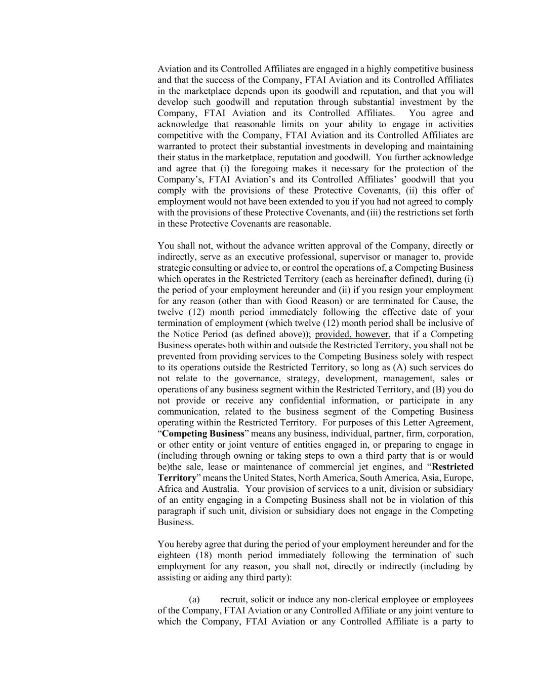 Aviation及其控股关联公司从事的业务竞争激烈,公司、FTAI Aviation及其控股关联公司在市场上的成功取决于其商誉和声誉,并且贵公司将通过公司、FTAI Aviation及其控股关联公司的重大投资来发展此类商誉和声誉。您同意并承认对您从事与公司具有竞争性的活动的能力设置合理限制,FTAI Aviation及其控制的关联公司有正当理由保护其在发展和维持其市场地位、声誉和商誉方面的重大投资。您进一步承认并同意,(i)由于上述规定,为保护公司、FTAI Aviation及其受控关联公司的商誉,有必要由您遵守这些保护性契约的规定,(ii)如果您未同意遵守这些保护性契约的规定,则本聘用要约将不会扩展至您,以及(iii)这些保护性契约中规定的限制是合理的。未经公司事先书面批准,你方不得直接或间接担任执行专业人员、主管或经理,向在受限制区域(每一项定义如下)经营的竞争业务提供战略咨询或建议,或控制其运营,在(i)你根据本协议受雇期间和(ii)如果你因任何原因(非有充分理由)辞职或因故被解雇,紧接贵公司终止雇用生效日期后的十二(12)个月期间(其中十二(12)个月期间应包括通知期间(如上文所定义));但条件是,如果竞争业务同时在受限区域内外经营,则不应阻止贵公司仅就其在受限区域外的经营向竞争业务提供服务,只要(a)该等服务与受限区域内任何业务分部的治理、战略、发展、管理、销售或经营无关,及(b)你方并无提供或接收任何与在受限制区域内经营的竞争业务的业务分部有关的机密资料,或参与任何通讯。就本函件协议而言,“竞争业务”是指从事或准备从事(包括通过拥有或采取步骤拥有第三方,即现在或将要拥有)商用喷气发动机的销售、租赁或维护的任何企业、个人、合伙人、公司、公司或其他实体或实体的合资企业,“受限地区”是指美国、北美、南美、亚洲、欧洲、非洲和澳大利亚。你向从事竞争业务的单位、分部、子公司提供服务,该单位、分部、子公司不从事竞争业务的,不违反本款规定。您在此同意,在您根据本协议受雇期间以及在紧接因任何原因终止该等雇佣后的十八(18)个月期间内,您不得直接或间接(包括通过协助或帮助任何第三方):(a)招聘、招揽或诱导任何非文职雇员或公司员工、FTAI Aviation或任何受控关联公司或公司、FTAI Aviation或任何受控关联公司作为一方的任何合资企业