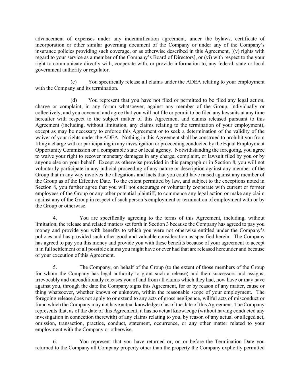 根据任何赔偿协议、根据公司的章程、公司注册证书或其他类似的管理文件或根据提供此类保险的任何公司保险单,或如本协议中另有说明,[(v)与您作为公司董事会成员的服务有关的权利],或(vi)与任何联邦、州或地方政府当局或监管机构直接沟通、合作或向其提供信息的权利,垫付费用。(c)你具体解除根据ADEA提出的与你受雇于公司及其终止有关的所有索赔。(d)阁下声明,阁下并无在任何法院针对集团任何成员个别或集体提出或获准提出任何法律诉讼、控罪或控诉,而阁下立约及同意,阁下将不会在以后任何时间就本协议的标的及根据本协议解除的申索(包括但不限于与终止雇用有关的任何申索)提出或获准提出任何诉讼,除非为强制执行本协议或寻求确定根据ADEA放弃您的权利的有效性而可能需要。本协议中的任何内容均不得解释为禁止您向平等就业机会委员会或类似的州或地方机构提出指控或参与任何调查或程序。尽管有上述规定,您同意放弃在您或其他任何人代表您提起的任何指控、投诉或诉讼中追讨金钱损失的权利。除本段或第8节另有规定外,你将不会自愿参与任何性质或种类的针对集团任何成员的司法程序,而该司法程序以任何方式涉及你在生效日期本可对集团任何成员提出的指控和事实。在法律许可的范围内,除第8条所述的例外情况外,你方进一步同意,你方不会鼓励或自愿与集团现任或前任雇员或任何其他潜在原告合作,就该人受雇或终止受雇于集团或由集团或以其他方式向集团任何一方提起任何法律诉讼或提出任何索赔。4.贵公司特别同意本协议的条款,包括但不限于第3节中规定的解除和相关事项,因为公司已同意向贵公司支付款项并向贵公司提供根据公司政策您在其他情况下无权享有的福利,并已提供本协议中规定的其他良好和有价值的对价。公司已同意向您支付这笔款项并向您提供这些利益,因为您同意接受这笔款项,以完全解决您可能拥有或曾经拥有的根据本协议解除的所有可能索赔,并且由于您执行本协议。5.本公司代表本集团(在本公司拥有法律授权授予该等豁免的集团成员的范围内)及其继任者和受让人,在本公司签署本协议之日之前,不可撤销地和无条件地解除你对他们对你的所有索赔,以及他们对你的所有索赔,在你受雇的合理范围内,出于或出于任何已知或未知的事项、原因或事情。上述解除不适用于或延伸至公司截至本协议日期可能并不实际知悉的任何重大过失、故意不当行为或欺诈行为。本公司声明,截至本协议日期,由于任何实际或指称的作为、不作为、交易、实践、行为、陈述、发生,或与你受雇于本公司或其他方面有关的任何其他事项,本公司并不实际知悉(未进行任何与此有关的调查)任何与你有关的索赔。6.你代表你已退回或于终止日期当日或之前退回公司除公司明令允许的财产以外的所有公司财产
