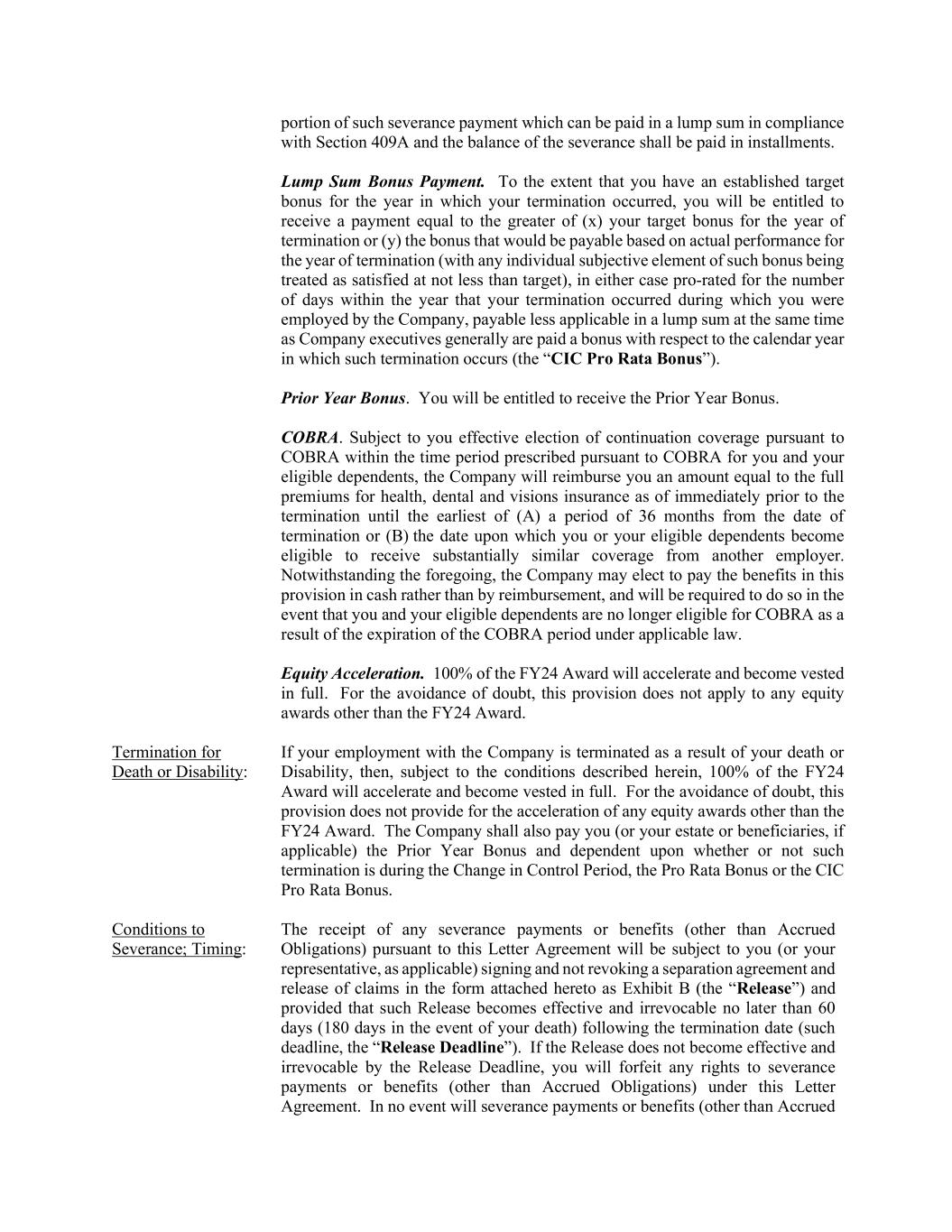 根据第409A条可一次性支付的该等遣散费的一部分以及遣散费的余额应分期支付。一次性奖金支付。如果您在终止雇用发生的年度有既定目标奖金,您将有权获得一笔款项,金额等于(x)您在终止雇用年度的目标奖金或(y)根据终止雇用年度的实际表现应支付的奖金中的较大者(该奖金的任何个人主观因素均被视为在不低于目标的情况下得到满足),在任何一种情况下,均按您受雇于公司的终止雇用发生的年度内的天数按比例分配,与公司高管同时一次性支付较少适用的款项,通常会获得与此类终止发生的日历年度相关的奖金(“中投按比例奖金”)。上一年度奖金。您将有权获得上一年的奖金。眼镜蛇。在您根据COBRA为您和您的合格受养人规定的期限内有效选择根据COBRA提供的延续保险的前提下,公司将向您偿还一笔金额,该金额等于截至终止前的健康、牙科和视力保险的全部保费,直至(a)自终止之日起36个月期间或(b)您或您的合格受养人有资格从另一雇主获得基本相似的保险之日中最早的日期。尽管有上述规定,公司可选择以现金支付本条款中的福利,而不是以报销方式支付,如果您和您的合格受抚养人因适用法律规定的COBRA期限届满而不再有资格获得COBRA,公司将被要求这样做。股权加速。24财年奖励的100%将加速并成为全部归属。为免生疑问,这一规定不适用于除24财年奖励之外的任何股权奖励。因死亡或残疾而终止:如果您因死亡或残疾而终止与公司的雇佣关系,那么,在符合本文所述条件的情况下,24财年奖励的100%将加速并成为全部归属。为免生疑问,这条规定并未规定加速除24财年奖励之外的任何股权奖励。公司还应向您(或您的遗产或受益人,如适用)支付上一年度奖金,并取决于该终止是否在控制权变更期间、按比例奖金或中投按比例奖金。遣散费的条件;时间安排:根据本信函协议收到任何遣散费或福利(应计债务除外)将取决于您(或您的代表,如适用)签署而不是撤销分居协议和作为附件 B所附表格的索赔解除(“解除”),前提是该解除不迟于终止日期(该期限,“解除期限”)之后的60天(如果您去世,则为180天)内生效且不可撤销。如果解除协议未在解除协议截止日期前生效且不可撤销,您将丧失本信函协议项下的任何遣散费或福利(应计债务除外)的权利。在任何情况下都不会支付遣散费或福利(除应计