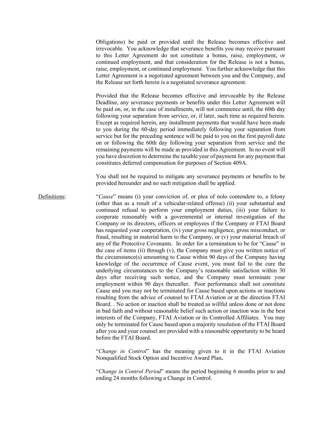 义务)支付或提供,直至解除生效且不可撤销。您承认,您根据本信函协议可能获得的遣散费不构成奖金、加薪、就业或继续就业,并且释放的对价不是奖金、加薪、就业或继续就业。贵公司进一步确认,本信函协议为贵公司与本公司之间的协商协议,本协议所载的解除协议为协商的遣散协议。但在解除合约生效及于解除合约截止日期前不可撤销,本函件协议项下的任何遣散费或福利将于你离职后的第60天开始支付,或在分期付款的情况下,将不会开始支付,或如较后,则在本合约所规定的时间开始支付。除本协议要求外,本应在你离职后的60天期间内支付给你但前一句话的任何分期付款将在你离职后的第60天或之后的第一个发薪日支付给你,其余款项将按本协议的规定支付。在任何情况下,就第409A条而言,对于构成递延补偿的任何付款,您都不会有酌处权确定付款的纳税年度。您将不会被要求减轻根据本协议提供的任何遣散费或福利,也不会适用此类减轻。定义:“原因”是指(i)您对重罪的定罪或nolo抗辩(与车辆相关的犯罪除外)(ii)您严重且持续地拒绝履行您的雇佣职责,(iii)如果公司或FTAI董事会要求您的合作,您未能合理配合对公司或其董事、高级职员或雇员的政府或内部调查,(iv)您的重大过失、严重不当行为或欺诈,导致对公司造成重大损害,或(v)您严重违反任何保护性契诺。为了使终止是因为第(ii)至(v)项的情况下的“原因”,公司必须在公司知悉原因事件发生的90天内向你发出构成原因的情况的书面通知,你必须在收到此种通知后30天内未能将基础情况纠正到公司合理满意的程度,公司必须在其后90天内终止你的雇用。表现不佳不应构成原因,您不得因法律顾问向FTAI Aviation提供建议而导致的作为或不作为或在FTAI董事会的指示而被终止合同。。任何作为或不作为均不得视为故意,除非出于恶意或无合理理由相信该等作为或不作为符合公司、FTAI Aviation或其控制的关联公司的最佳利益。在向您和您的律师提供在FTAI董事会上发表意见的合理机会后,您只能根据FTAI董事会的多数决议因故被解雇。“控制权变更”具有《FTAI Aviation非合格股票期权与激励授予计划》中赋予的含义。“控制权变更期间”是指控制权变更前6个月开始、后24个月结束的期间。