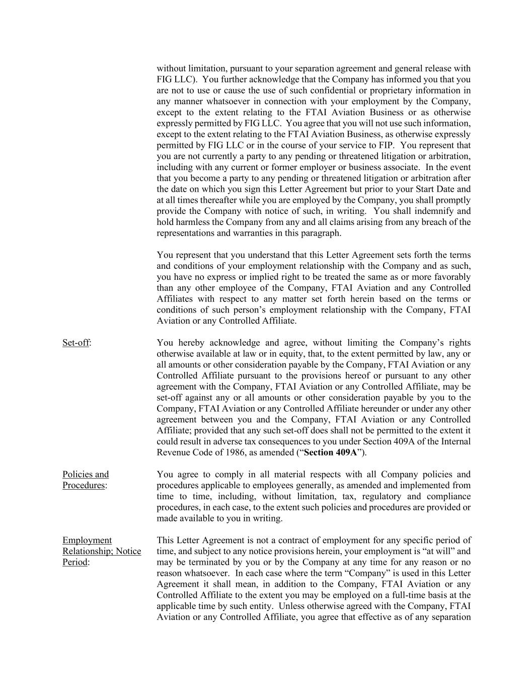 不受限制,根据您与FIG LLC的分居协议和一般释放)。您进一步确认,公司已通知您,除与FTAI Aviation业务有关的范围或FIG LLC另有明确许可外,您不得以任何方式使用或导致使用此类机密或专有信息与您受雇于公司有关。您同意您将不会使用此类信息,除非与FIG LLC另有明确许可或在您向FIP提供服务的过程中使用与FTAI Aviation业务相关的信息。您声明您目前不是任何未决或威胁诉讼或仲裁的一方,包括与任何现任或前任雇主或商业伙伴的诉讼或仲裁。如果在您签署本信函协议之日之后但在您的开始日期之前以及此后在您受雇于公司期间的所有时间,您成为任何未决或威胁诉讼或仲裁的一方,您应立即以书面形式向公司提供此类通知。您应就任何违反本段中的陈述和保证而引起的任何和所有索赔向公司作出赔偿并使其免受损害。你方代表理解,本信函协议载列了您与公司的雇佣关系的条款和条件,因此,您没有明示或暗示的权利根据公司任何其他员工、FTAI Aviation和任何受控关联公司与公司、FTAI Aviation或任何受控关联公司的雇佣关系的条款或条件,就此处所述的任何事项获得与公司任何其他员工相同或更优惠的待遇。抵销:您在此承认并同意,在不限制公司在法律上或权益上以其他方式享有的权利的情况下,在法律允许的范围内,公司、FTAI Aviation或任何受控关联公司根据本协议的规定或根据与公司、FTAI Aviation或任何受控关联公司的任何其他协议应付的任何或所有金额或其他对价,可与您根据本协议或根据贵公司与公司之间的任何其他协议向公司、FTAI Aviation或任何受控关联公司应付的任何或所有金额或其他对价相抵销,FTAI Aviation或任何受控关联公司;但前提是,根据经修订的1986年《国内税收法》第409A条(“第409A条”),任何此类抵消在可能对您造成不利税务后果的范围内均不被允许。政策和程序:您同意在所有重大方面遵守不时修订和实施的适用于员工的所有公司政策和程序,包括但不限于税务、监管和合规程序,在每种情况下,只要此类政策和程序以书面形式提供或提供给您。雇佣关系;通知期限:本函件协议不是任何特定期限的雇佣合同,受制于本协议的任何通知条款,您的雇佣是“随意”的,可能随时被您或公司以任何理由或无任何理由终止。在本信函协议中使用“公司”一词的每一种情况下,它应指除公司外,FTAI Aviation或任何受控关联公司,只要您在适用时间可能被该实体全职雇用。除非与公司、FTAI Aviation或任何受控关联公司另有约定,否则您同意自任何分居