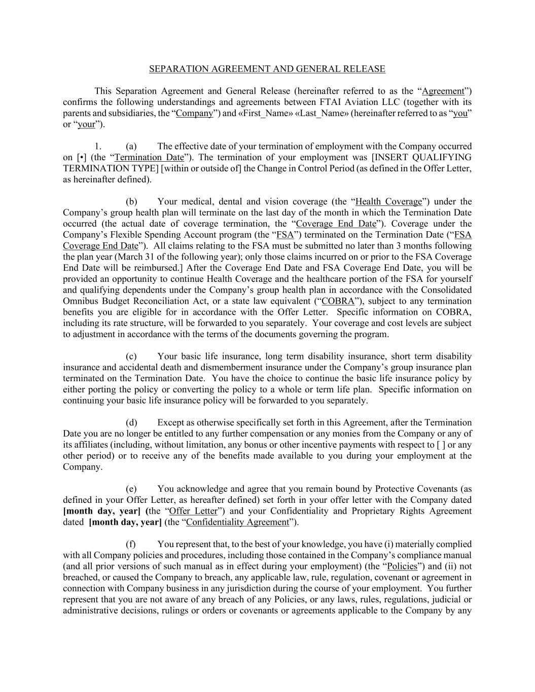 分离协议及一般发布本分离协议及一般发布(以下简称“协议”)确认FTAI Aviation LLC(连同其母公司和子公司,“公司”)与“First _ Name”“Last _ Name”(以下简称“您”或“您的”)之间的以下谅解和协议。1.(a)你终止与公司的雇佣关系的生效日期发生在[ • ](“终止日期”)。你的雇佣终止是[插入合格终止类型] [在]控制期变更(定义见招股书,定义见下文)之内或之外。(b)公司团体健康计划项下的您的医疗、牙科和视力保险(“健康保险”)将于终止日期发生月份的最后一天(保险终止的实际日期,“保险终止日期”)终止。公司灵活支出账户计划(“FSA”)的覆盖范围在终止日期(“FSA覆盖结束日期”)终止。所有与FSA有关的索赔必须不迟于计划年度后3个月(次年3月31日)提交;只有在FSA承保范围结束日期或之前发生的索赔才会得到补偿。]在承保范围结束日期和FSA承保范围结束日期之后,您将有机会根据《综合综合预算调节法案》或州法律同等条款(“COBRA”)为您自己和符合条件的受抚养人继续健康保险和FSA的医疗保健部分,受限于您根据要约函有资格获得的任何解雇福利。有关COBRA的具体信息,包括其费率结构,将另行转发给您。您的承保范围和费用水平将根据管理该计划的文件条款进行调整。(c)本公司团体保险计划项下的基本人寿保险、长期伤残保险、短期伤残保险及意外身故及肢解保险于终止日终止。您可以选择通过移植保单或将保单转换为整体或定期人寿计划来延续基本寿险保单。续保基本人身保险保单的具体信息将另行转发给您。(d)除本协议另有具体规定外,在终止日期后,您不再有权从公司或其任何关联公司获得任何进一步的补偿或任何款项(包括但不限于与[ ]或任何其他期间有关的任何奖金或其他奖励付款),或获得您在受雇于公司期间可获得的任何福利。(e)你方承认并同意,你方仍受贵方与公司日期为[月日、年]的要约函件(“要约函”)及贵方日期为[月日、年]的保密及专有权协议(“保密协议”)所载的保护性契诺(定义见贵方的要约函件,定义如下)的约束。(f)你方声明,据你所知,你已(i)实质上遵守公司所有政策及程序,包括公司合规手册(以及在你受雇期间有效的该等手册的所有先前版本)(“政策”)所载的政策及程序,以及(ii)在你受雇期间未违反或导致公司违反与任何司法管辖区的公司业务有关的任何适用法律、规则、条例、契诺或协议。你进一步声明,你并不知悉任何违反任何政策、或任何法律、规则、条例、司法或行政决定、裁定或命令或适用于公司的契诺或协议的情况