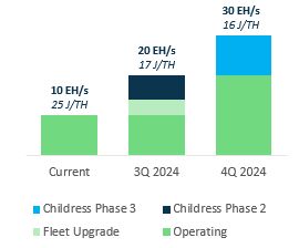 将安装的容量包括比特大陆T21和S21 Pro矿机购买和矿机购买选项。获得保障的额外S21 Pro矿工也将用于升级现有车队。关于行使矿商购买选择权的最终决定将在2024年期间做出,同时考虑到市场和资金状况。