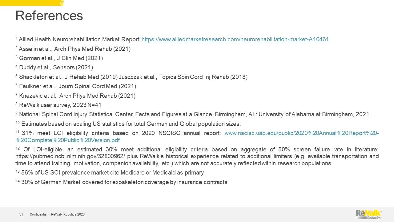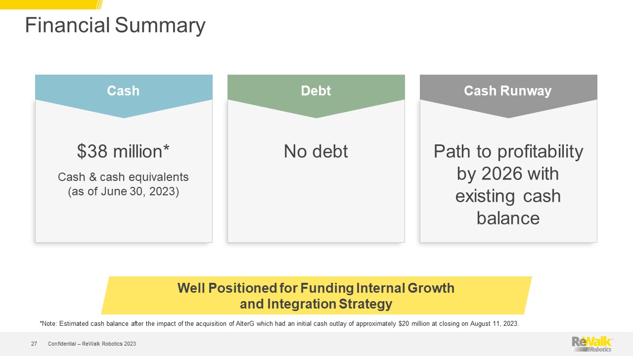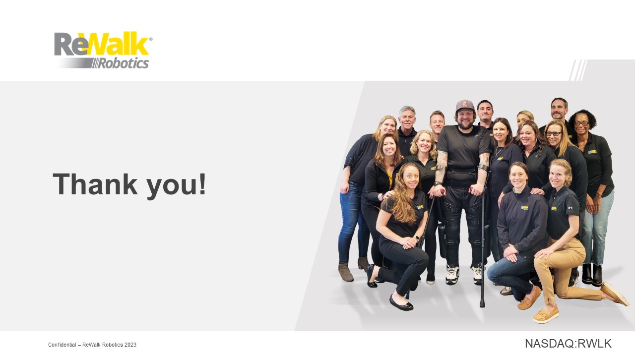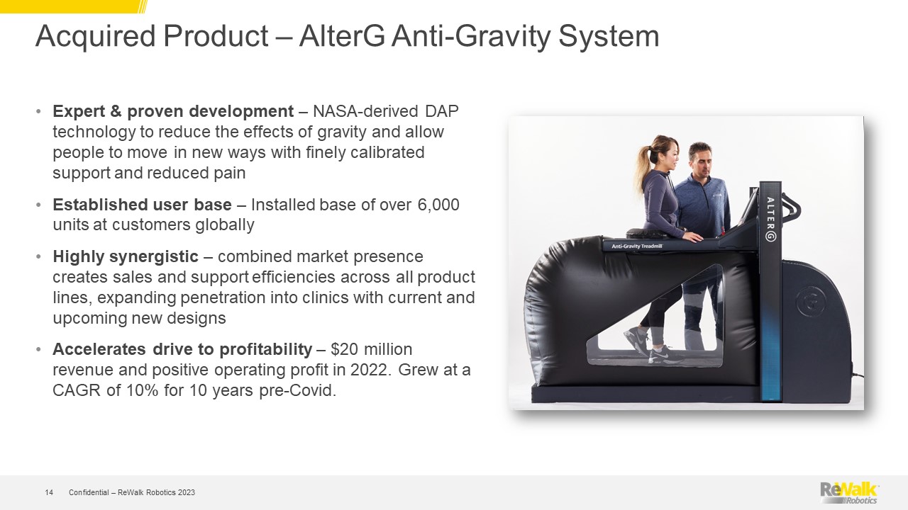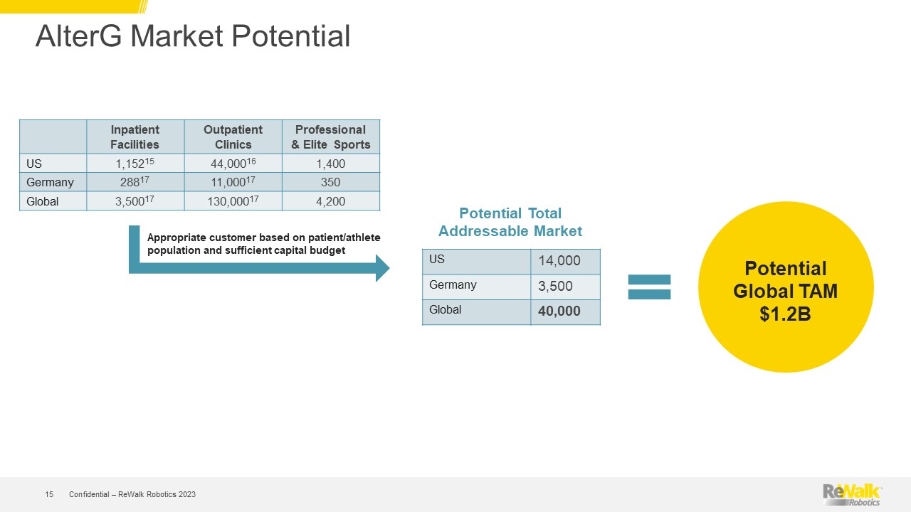AlterG Market Potential Confidential – ReWalk Robotics 2023 Potential Total Addressable Market US 14,000 Germany 3,500 Global 40,000 Potential Global TAM $ 1.2B Inpatient Facilities Outpatient Clinics Professional & Elite Sports US 1,1521544,000161,400 Germany 2881711,00017350 Global 3,50017130,00017 4,200 Appropriate customer based on patient/athlete population and sufficient cap