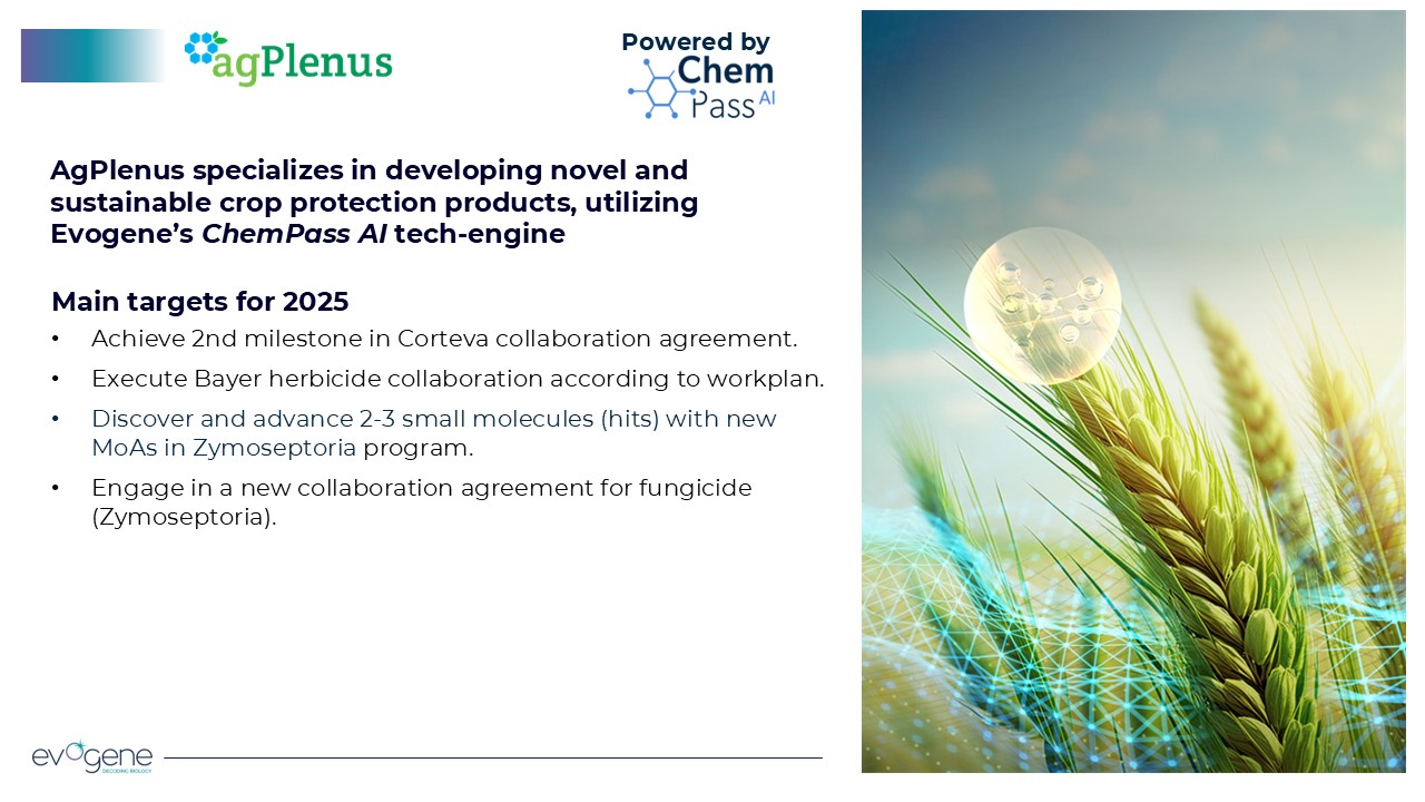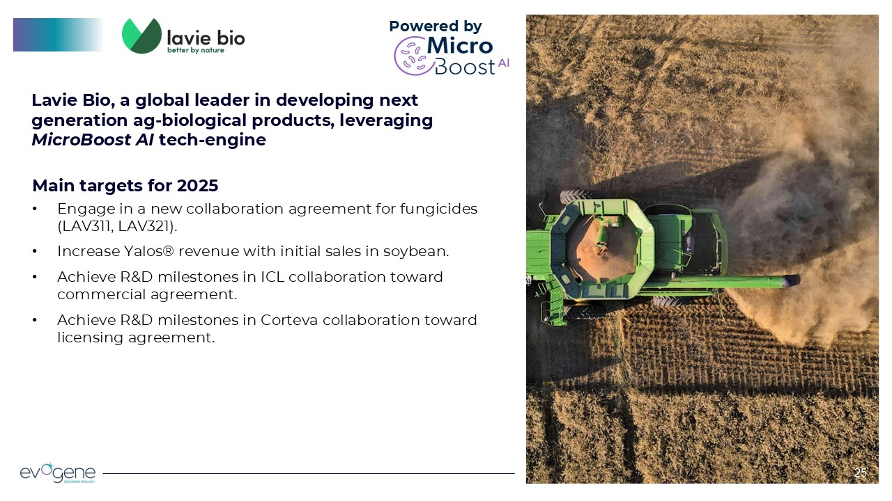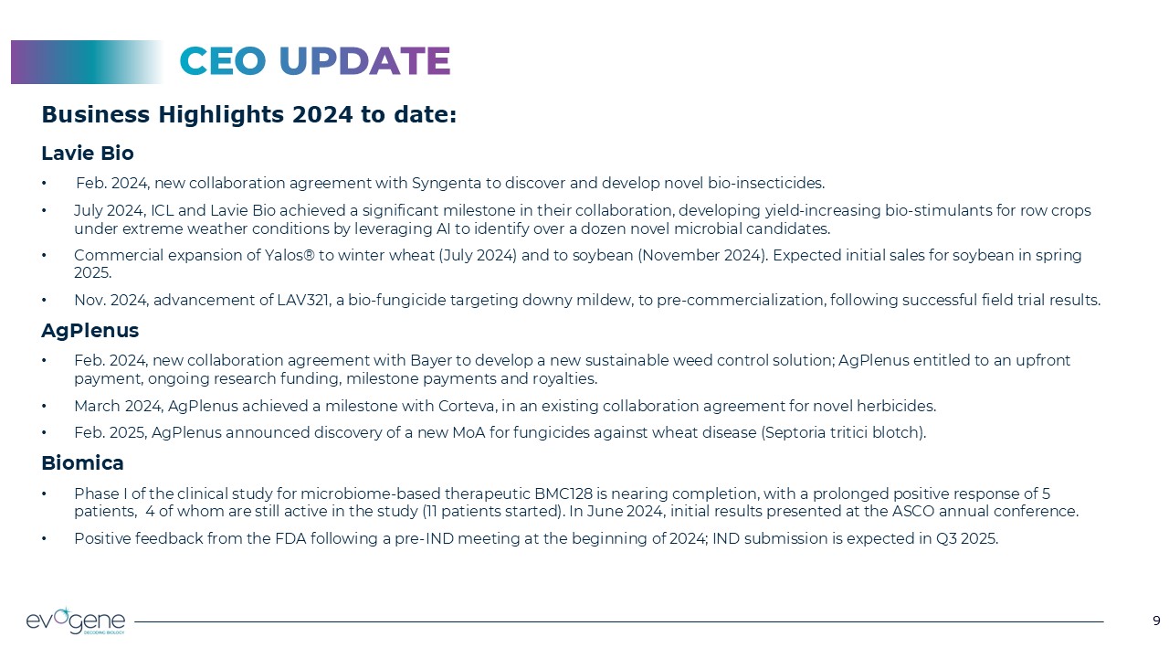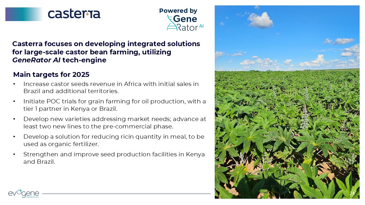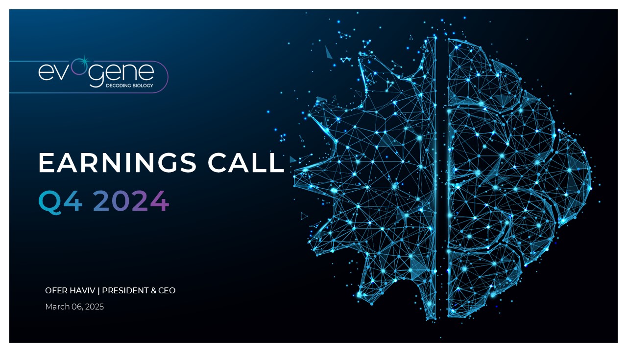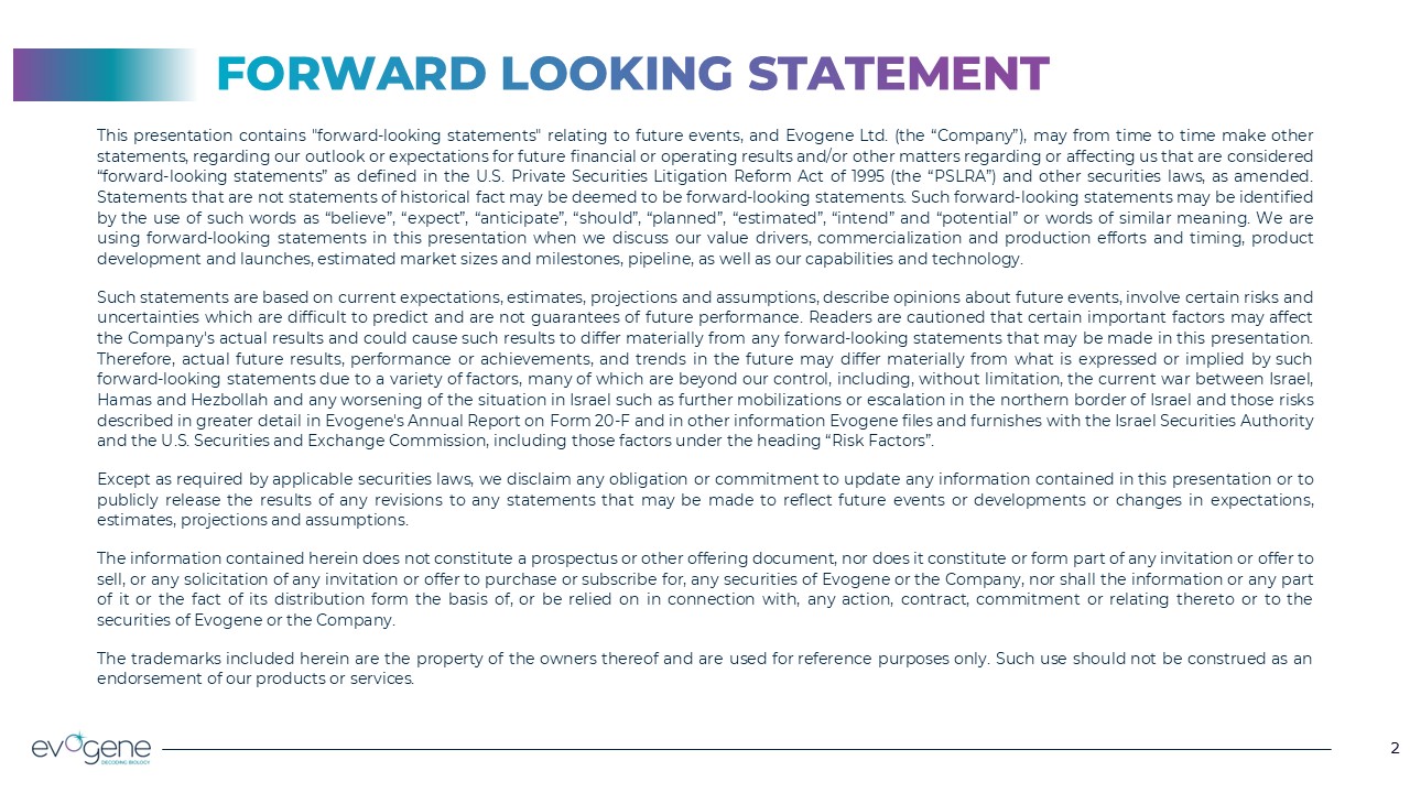本演示文稿包含与未来事件相关的“前瞻性陈述”,而Evogene Ltd.(“公司”)可能会不时做出其他陈述,涉及我们对未来财务或经营业绩的前景或预期和/或涉及或影响我们的其他事项,这些事项被视为1995年美国《私人证券诉讼改革法案》(“PSLRA”)和经修订的其他证券法中定义的“前瞻性陈述”。非历史事实陈述的陈述可被视为前瞻性陈述。此类前瞻性陈述可通过使用“相信”、“预期”、“预期”、“应该”、“计划”、“估计”、“打算”和“潜在”等词语或类似含义的词语来识别。当我们讨论我们的价值驱动因素、商业化和生产努力和时机、产品开发和发布、估计的市场规模和里程碑、管道以及我们的能力和技术时,我们在本演示文稿中使用了前瞻性陈述。此类陈述基于当前的预期、估计、预测和假设,描述对未来事件的看法,涉及某些难以预测的风险和不确定性,不能保证未来的业绩。请读者注意,某些重要因素可能会影响公司的实际业绩,并可能导致此类业绩与本演示文稿中可能做出的任何前瞻性陈述存在重大差异。因此,由于多种因素,未来的实际结果、业绩或成就以及未来的趋势可能与此类前瞻性陈述所表达或暗示的内容存在重大差异,其中许多因素超出了我们的控制范围,包括但不限于当前以色列之间的战争,哈马斯和真主党以及以色列局势的任何恶化,例如在以色列北部边境的进一步动员或升级,以及在Evogene的20-F表格年度报告中更详细描述的那些风险以及在Evogene向以色列证券管理局和美国证券交易委员会归档和提供的其他信息中更详细描述的那些风险,包括“风险因素”标题下的那些因素。除适用的证券法要求外,我们不承担更新本演示文稿中包含的任何信息或公开发布为反映未来事件或预期、估计、预测和假设的发展或变化而可能对任何陈述进行的任何修订的结果的任何义务或承诺。此处包含的信息并不构成招股说明书或其他发售文件,也不构成或构成任何出售Evogene或公司的任何证券的邀请或要约,或任何购买或认购任何证券的邀请或要约的招揽,信息或其任何部分或其分发的事实也不得构成任何行动、合同、承诺或与此有关的任何行动、合同、承诺或与此相关的任何行动、合同、承诺或与该等行动、合同、承诺或与该等行动、合同、承诺或与该等有关的任何行动、合同、承诺或与该等文件或与该等文件或与该等文件或与该等文件或与该等文件或与该公司的证券有关的任何邀请或要约的任何招揽或招揽此处包含的商标是其所有者的财产,仅用于参考目的。此类使用不应被解释为对我们的产品或服务的认可。22前瞻性陈述