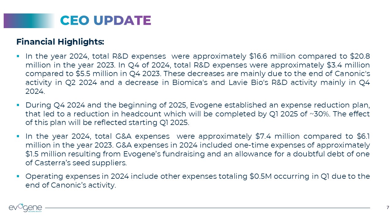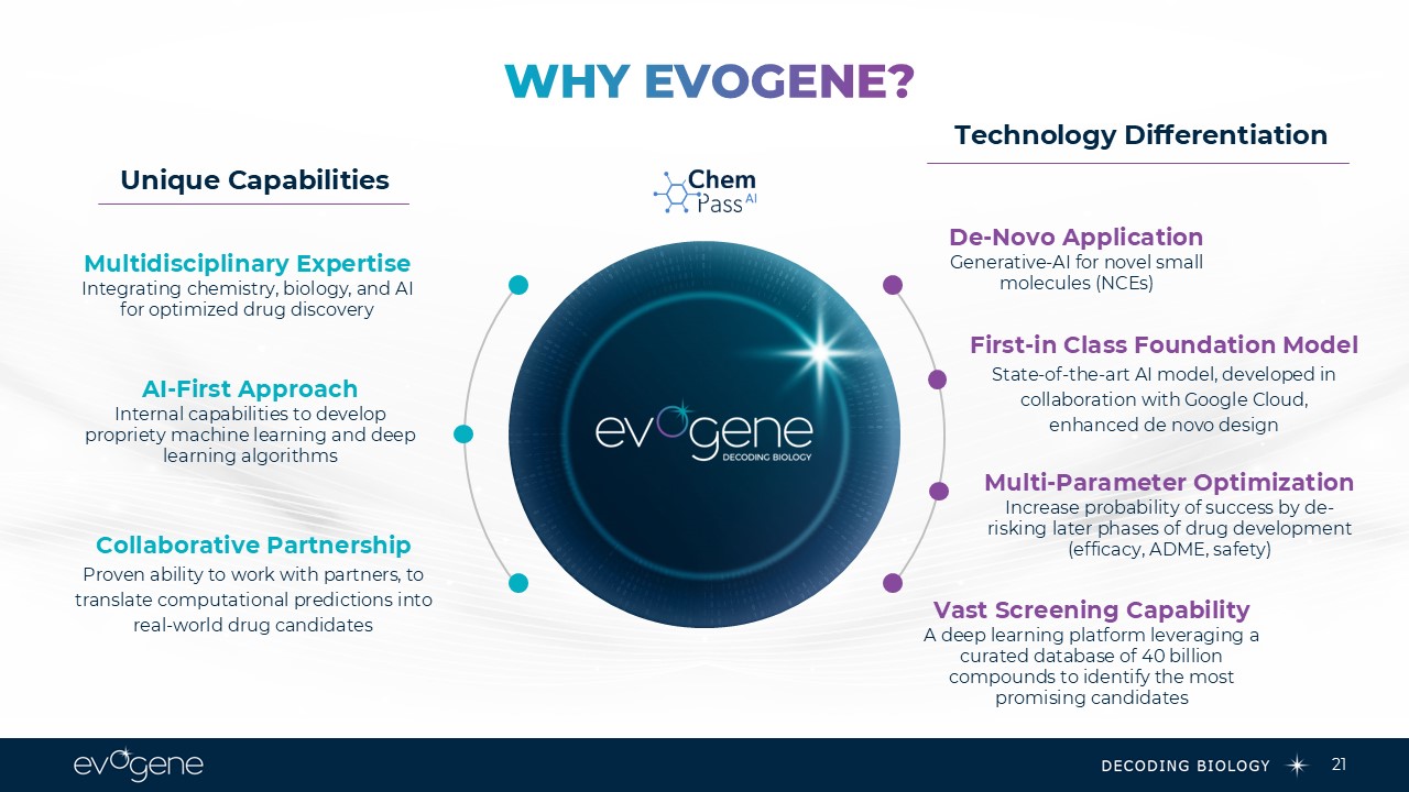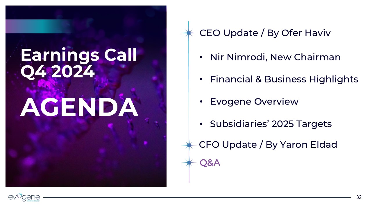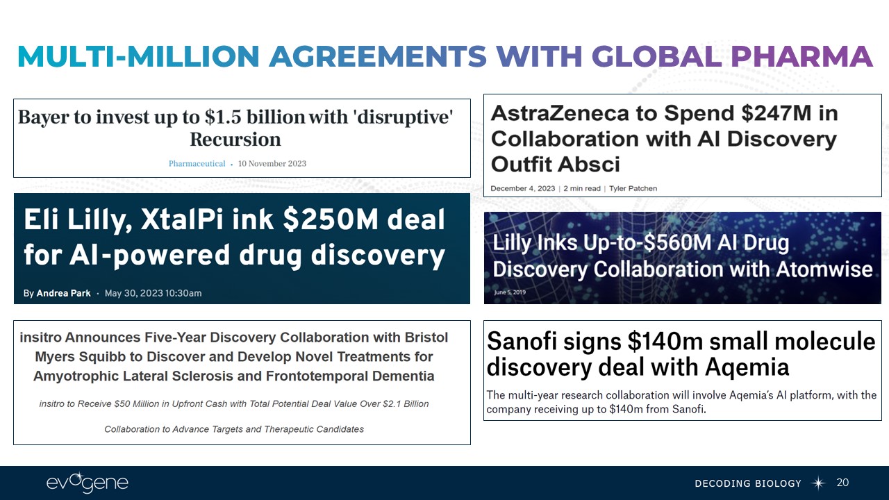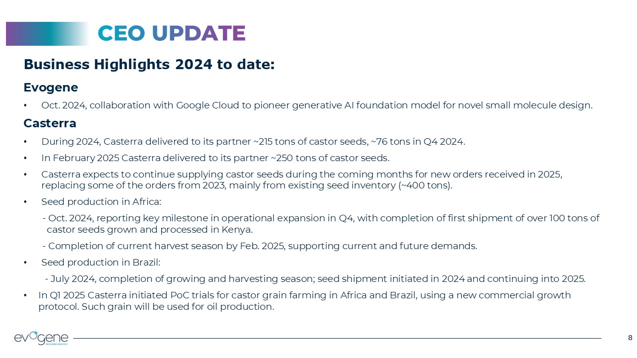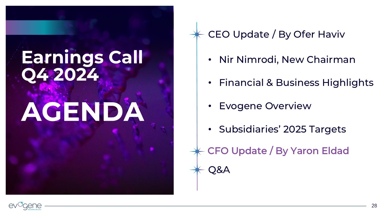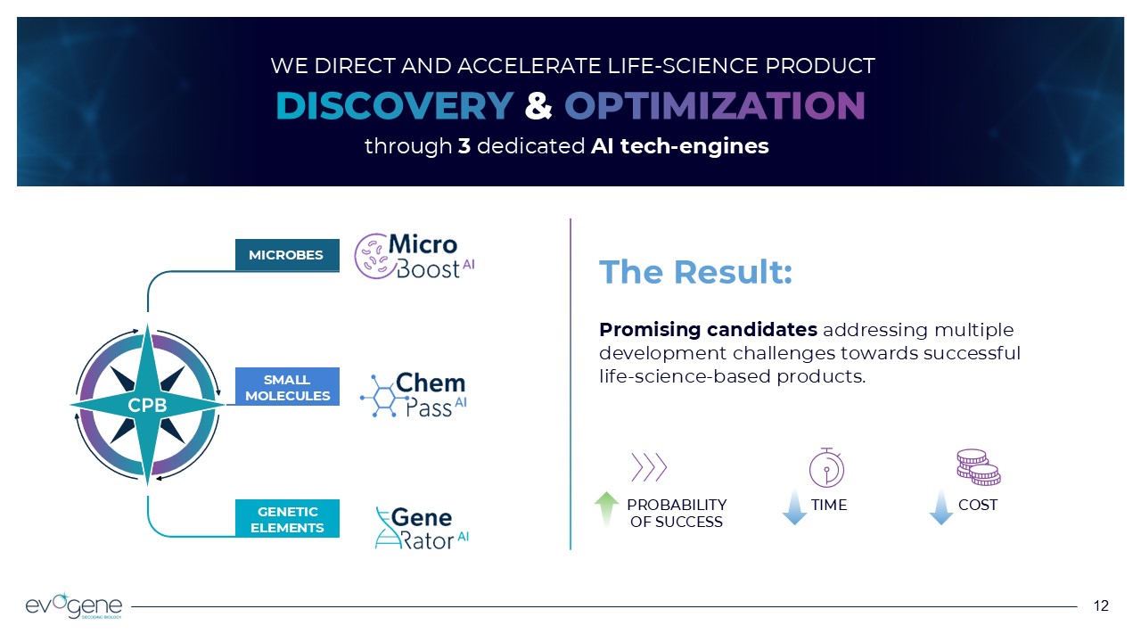 本演示文稿包含与未来事件相关的“前瞻性陈述”,而Evogene Ltd.(“公司”)可能会不时做出其他陈述,涉及我们对未来财务或经营业绩的前景或预期和/或涉及或影响我们的其他事项,这些事项被视为1995年美国《私人证券诉讼改革法案》(“PSLRA”)和经修订的其他证券法中定义的“前瞻性陈述”。非历史事实陈述的陈述可被视为前瞻性陈述。此类前瞻性陈述可通过使用“相信”、“预期”、“预期”、“应该”、“计划”、“估计”、“打算”和“潜在”等词语或类似含义的词语来识别。当我们讨论我们的价值驱动因素、商业化和生产努力和时机、产品开发和发布、估计的市场规模和里程碑、管道以及我们的能力和技术时,我们在本演示文稿中使用了前瞻性陈述。此类陈述基于当前的预期、估计、预测和假设,描述对未来事件的看法,涉及某些难以预测的风险和不确定性,不能保证未来的业绩。请读者注意,某些重要因素可能会影响公司的实际业绩,并可能导致此类业绩与本演示文稿中可能做出的任何前瞻性陈述存在重大差异。因此,由于多种因素,未来的实际结果、业绩或成就以及未来的趋势可能与此类前瞻性陈述所表达或暗示的内容存在重大差异,其中许多因素超出了我们的控制范围,包括但不限于当前以色列之间的战争,哈马斯和真主党以及以色列局势的任何恶化,例如在以色列北部边境的进一步动员或升级,以及在Evogene的20-F表格年度报告中更详细描述的那些风险以及在Evogene向以色列证券管理局和美国证券交易委员会归档和提供的其他信息中更详细描述的那些风险,包括“风险因素”标题下的那些因素。除适用的证券法要求外,我们不承担更新本演示文稿中包含的任何信息或公开发布为反映未来事件或预期、估计、预测和假设的发展或变化而可能对任何陈述进行的任何修订的结果的任何义务或承诺。此处包含的信息并不构成招股说明书或其他发售文件,也不构成或构成任何出售Evogene或公司的任何证券的邀请或要约,或任何购买或认购任何证券的邀请或要约的招揽,信息或其任何部分或其分发的事实也不得构成任何行动、合同、承诺或与此有关的任何行动、合同、承诺或与此相关的任何行动、合同、承诺或与该等行动、合同、承诺或与该等行动、合同、承诺或与该等有关的任何行动、合同、承诺或与该等文件或与该等文件或与该等文件或与该等文件或与该等文件或与该公司的证券有关的任何邀请或要约的任何招揽或招揽此处包含的商标是其所有者的财产,仅用于参考目的。此类使用不应被解释为对我们的产品或服务的认可。22前瞻性陈述