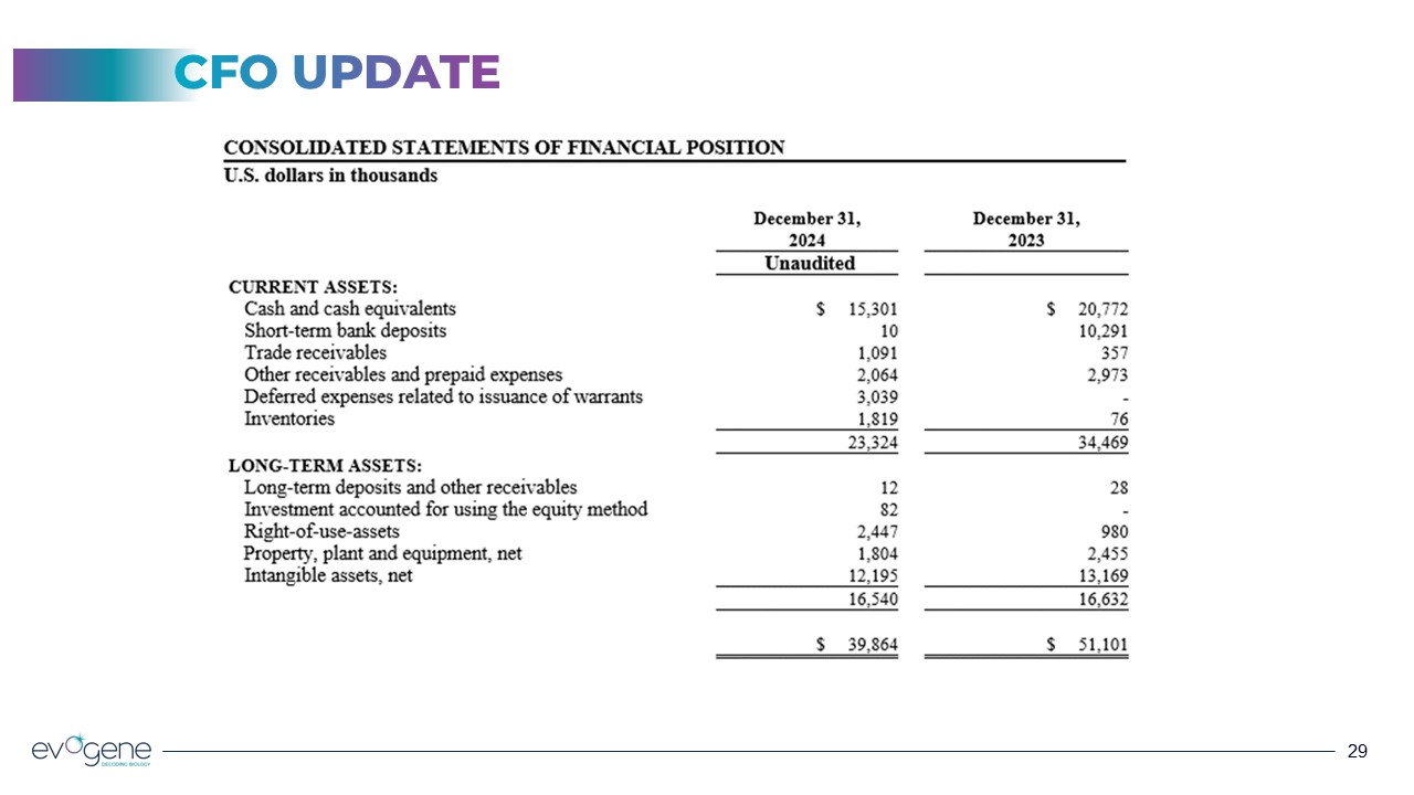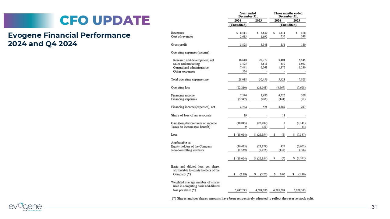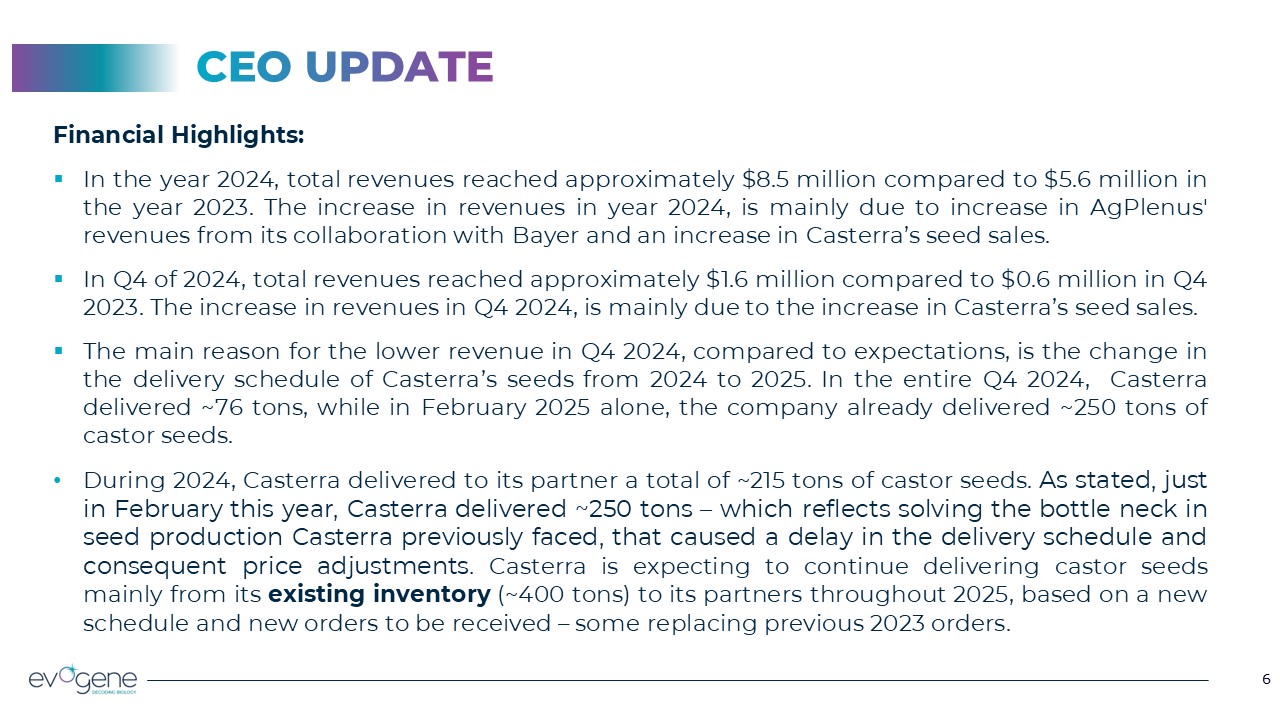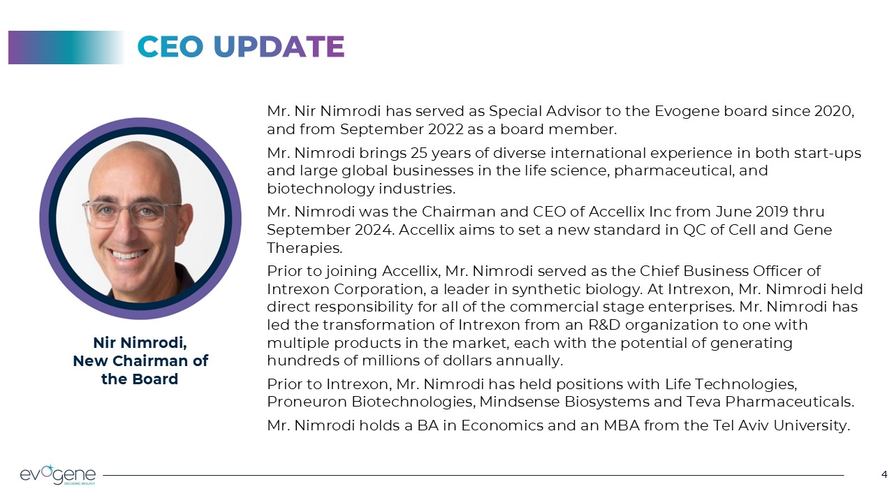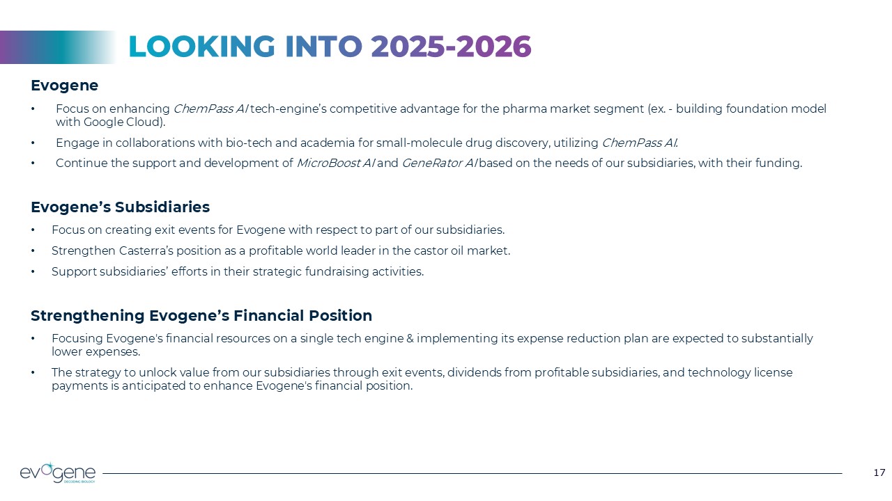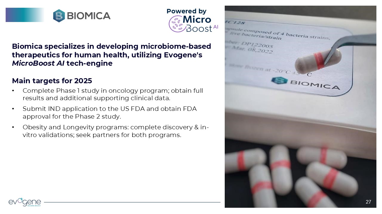 本演示文稿包含与未来事件相关的“前瞻性陈述”,而Evogene Ltd.(“公司”)可能会不时做出其他陈述,涉及我们对未来财务或经营业绩的前景或预期和/或涉及或影响我们的其他事项,这些事项被视为1995年美国《私人证券诉讼改革法案》(“PSLRA”)和经修订的其他证券法中定义的“前瞻性陈述”。非历史事实陈述的陈述可被视为前瞻性陈述。此类前瞻性陈述可通过使用“相信”、“预期”、“预期”、“应该”、“计划”、“估计”、“打算”和“潜在”等词语或类似含义的词语来识别。当我们讨论我们的价值驱动因素、商业化和生产努力和时机、产品开发和发布、估计的市场规模和里程碑、管道以及我们的能力和技术时,我们在本演示文稿中使用了前瞻性陈述。此类陈述基于当前的预期、估计、预测和假设,描述对未来事件的看法,涉及某些难以预测的风险和不确定性,不能保证未来的业绩。请读者注意,某些重要因素可能会影响公司的实际业绩,并可能导致此类业绩与本演示文稿中可能做出的任何前瞻性陈述存在重大差异。因此,由于多种因素,未来的实际结果、业绩或成就以及未来的趋势可能与此类前瞻性陈述所表达或暗示的内容存在重大差异,其中许多因素超出了我们的控制范围,包括但不限于当前以色列之间的战争,哈马斯和真主党以及以色列局势的任何恶化,例如在以色列北部边境的进一步动员或升级,以及在Evogene的20-F表格年度报告中更详细描述的那些风险以及在Evogene向以色列证券管理局和美国证券交易委员会归档和提供的其他信息中更详细描述的那些风险,包括“风险因素”标题下的那些因素。除适用的证券法要求外,我们不承担更新本演示文稿中包含的任何信息或公开发布为反映未来事件或预期、估计、预测和假设的发展或变化而可能对任何陈述进行的任何修订的结果的任何义务或承诺。此处包含的信息并不构成招股说明书或其他发售文件,也不构成或构成任何出售Evogene或公司的任何证券的邀请或要约,或任何购买或认购任何证券的邀请或要约的招揽,信息或其任何部分或其分发的事实也不得构成任何行动、合同、承诺或与此有关的任何行动、合同、承诺或与此相关的任何行动、合同、承诺或与该等行动、合同、承诺或与该等行动、合同、承诺或与该等有关的任何行动、合同、承诺或与该等文件或与该等文件或与该等文件或与该等文件或与该等文件或与该公司的证券有关的任何邀请或要约的任何招揽或招揽此处包含的商标是其所有者的财产,仅用于参考目的。此类使用不应被解释为对我们的产品或服务的认可。22前瞻性陈述