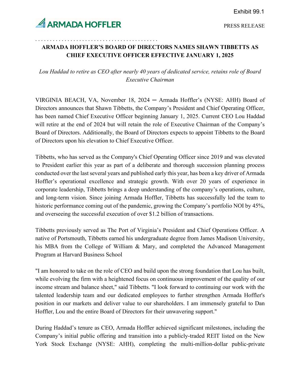 新闻稿.....。Armada Hoffler董事会任命Shawn Tibbetts为首席执行官2025年1月1日生效Lou Haddad在服务了近40年后退休,担任首席执行官,保留董事会执行主席的角色弗吉尼亚州弗吉尼亚海滩,2024年11月18日─ Armada Hoffler(纽约证券交易所代码:AHH)董事会宣布,公司总裁兼首席运营官Shawn Tibbetts自2025年1月1日起被任命为首席执行官。现任首席执行官Lou Haddad将于2024年底退休,但将保留公司董事会执行主席一职。此外,董事会预计将在Tibbetts升任首席执行官后任命他为董事会成员。Tibbetts自2019年起担任公司首席运营官,并在今年早些时候被提升为总裁,这是过去几年进行的深思熟虑和彻底的继任计划过程的一部分,并于今年年初发表。他一直是Armada Hoffler卓越运营和战略增长的关键驱动力。凭借20多年的企业领导经验,Tibbetts带来了对公司运营、文化和长期愿景的深刻理解。自加入Armada Hoffler以来,Tibbetts成功地带领团队取得了从疫情中走出的历史性业绩,公司的投资组合NOI增长了45%,并监督成功执行了超过12亿美元的交易。蒂贝茨此前曾担任弗吉尼亚港总裁兼首席运营官。蒂贝茨是朴茨茅斯人,在詹姆斯麦迪逊大学获得本科学位,在威廉玛丽学院获得MBA学位,并在哈佛商学院完成了高级管理课程。蒂贝茨说:“我很荣幸担任首席执行官一职,并在卢建立的坚实基础上再接再厉,同时发展公司,更加注重持续改善我们的收入流和资产负债表的质量。”"我期待着与才华横溢的领导团队和敬业的员工一起继续我们的工作,以进一步加强Armada Hoffler在我们市场中的地位,并为我们的股东创造价值。我非常感谢Dan Hoffler、Lou和整个董事会坚定不移的支持。”在Haddad担任首席执行官期间,Armada Hoffler取得了具有重要里程碑意义的成就,包括公司首次公开发行股票并转型为在纽约证券交易所上市的公开交易REIT(NYSE:AHH),完成了数百万美元的公私营附件 99.1