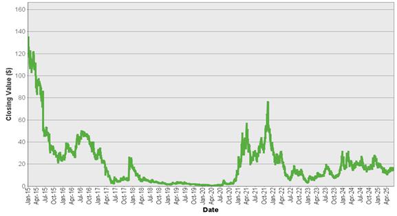 下图显示了Mara Holdings,Inc.在2015年1月2日至2025年6月17日期间每一天的收盘价。我们从Bloomberg L.P.获得了收盘数值,未经独立验证。如果某些公司交易发生在以下所示的历史期间,包括但不限于分拆或合并,那么以下所示的任何此类交易发生之前期间的收盘价已由Bloomberg L.P.进行调整,就好像任何此类交易发生在以下所示期间的第一天之前一样。你不应该把历史收盘数值作为未来表现的指标。