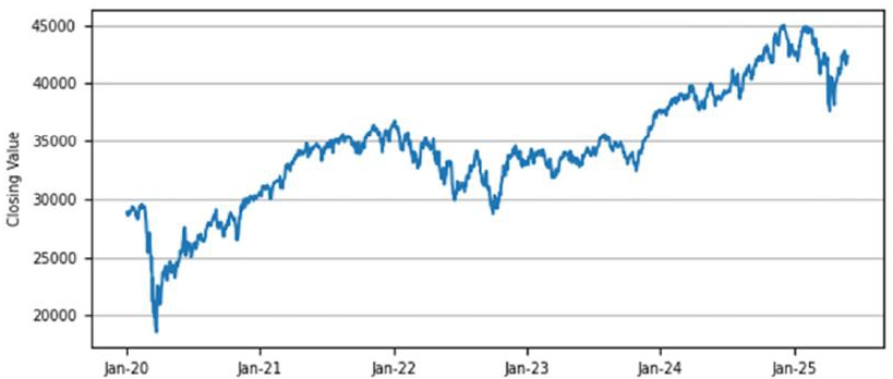 下图根据2020年1月1日至2025年5月28日的每日历史收盘水平,列出了INDU的历史表现。我们从彭博获得了以下收盘水平。我们没有对从彭博获得的信息进行任何独立审查或进行任何尽职调查。