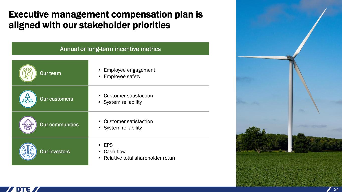 年度或长期激励指标我们的团队•员工敬业度•员工安全我们的客户•客户满意度•系统可靠性我们的社区•客户满意度•系统可靠性我们的投资者• EPS •现金流•相对总股东回报高管管理层薪酬计划与我们的利益相关者优先事项保持一致24
