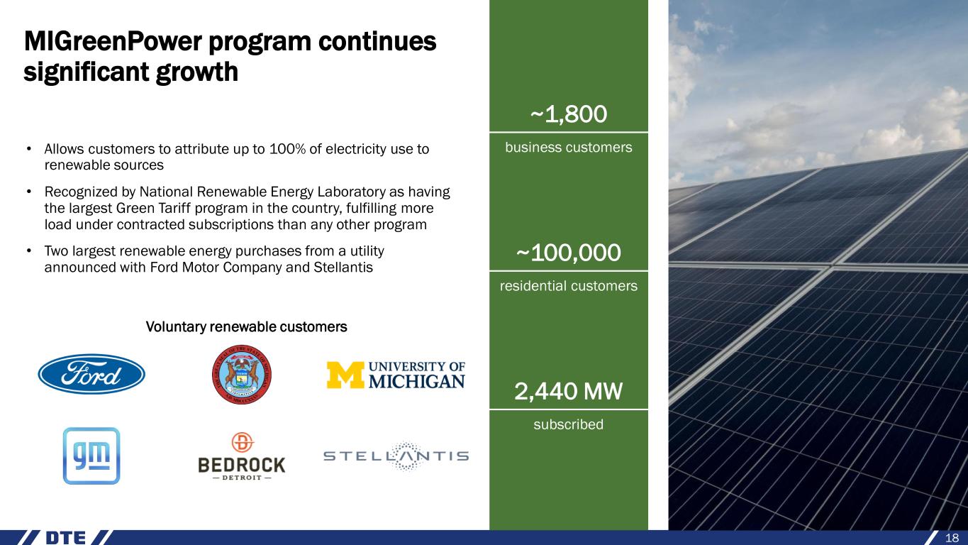 MIGreenPower计划继续显着增长~1,800个商业客户~100,000个住宅客户已订阅2,440兆瓦•允许客户将高达100%的电力使用归因于可再生能源•被国家Renewable能源实验室认定为拥有全国最大的绿色电价计划,在合同订阅下完成的负荷比任何其他计划都多•与福特汽车公司和Stellantis自愿可再生能源客户宣布的从公用事业公司购买的两个最大的可再生能源18