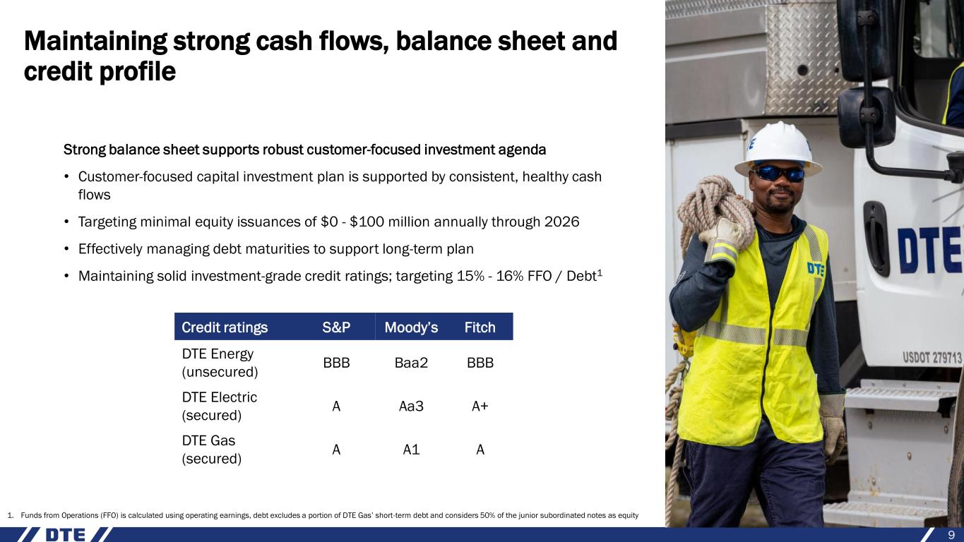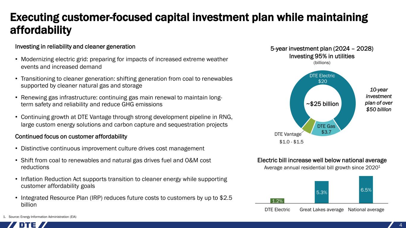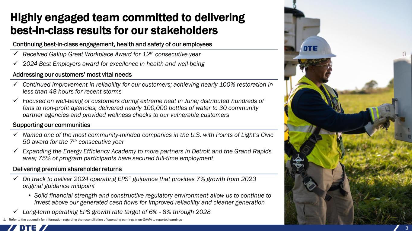 3持续保持员工一流的敬业度、健康和安全丨连续第12年获得盖洛普卓越工作场所奖丨2024年度最佳雇主奖,以表彰在健康和福祉方面的卓越表现,满足客户最重要的需求丨持续提高客户的可靠性;在最近的风暴中不到48小时内实现了近100%的恢复丨在6月的极端高温期间专注于客户的福祉;向非营利机构分发了数百个风扇,向30个社区合作机构提供了近100,000瓶水,并向我们的弱势客户提供健康检查支持我们的社区丨连续第7年获得Points of Light的Civic 50奖,被评为美国最具社区意识的公司之一丨将能效学院扩展到底特律和大急流城地区的更多合作伙伴;75%的项目参与者已获得全职工作,提供优质的股东回报丨有望实现2024年运营EPS1指导从2023年最初的指导中点提供7%的增长•坚实的财务实力和建设性的监管环境使我们能够继续在产生的现金流之上进行投资,以提高可靠性和更清洁的发电量丨到2028年,长期运营每股收益增长率目标为6%-8 %高度敬业的团队致力于为我们的利益相关者提供一流的结果1。有关运营收益(非GAAP)与报告收益的对账信息,请参阅附录