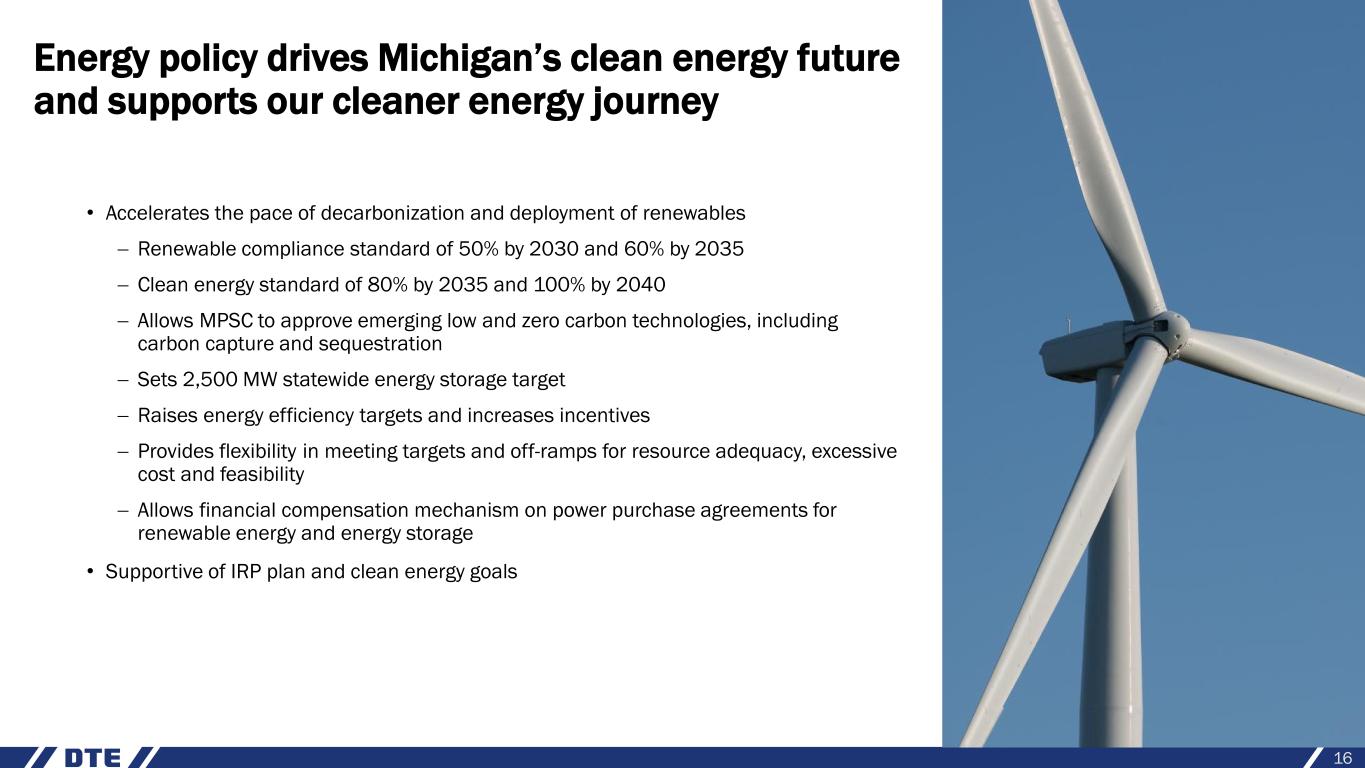 IRP支持向更清洁的能源未来过渡,同时关注可靠性和可负担性加速迈向更清洁的发电之路……同时继续关注客户的可负担性和经济发展•通过在2032年将碳排放量减少85%来实现发电转型,到2040年达到90%,到2050年实现净零• 2026年停止Belle River电厂的煤炭使用;转换为1300兆瓦天然气调峰资源• 2028年退出门罗电厂的两台燃煤机组;2035-2032年加速退出剩余的两台机组;研究一系列替代技术解决方案•加快发展储能,到2030年目标780兆瓦,到2042年目标1830兆瓦•到2042年开发6500兆瓦太阳能和8900兆瓦风能•在未来10年投资超过110亿美元用于清洁能源转型,支持超过32000个密歇根州工作岗位•到2042年开发超过15000兆瓦的密歇根州产生的可再生能源,相当于为大约400万户家庭供电•将额外的1.1亿美元用于支持最脆弱的客户•将客户未来的成本降低多达25亿美元15