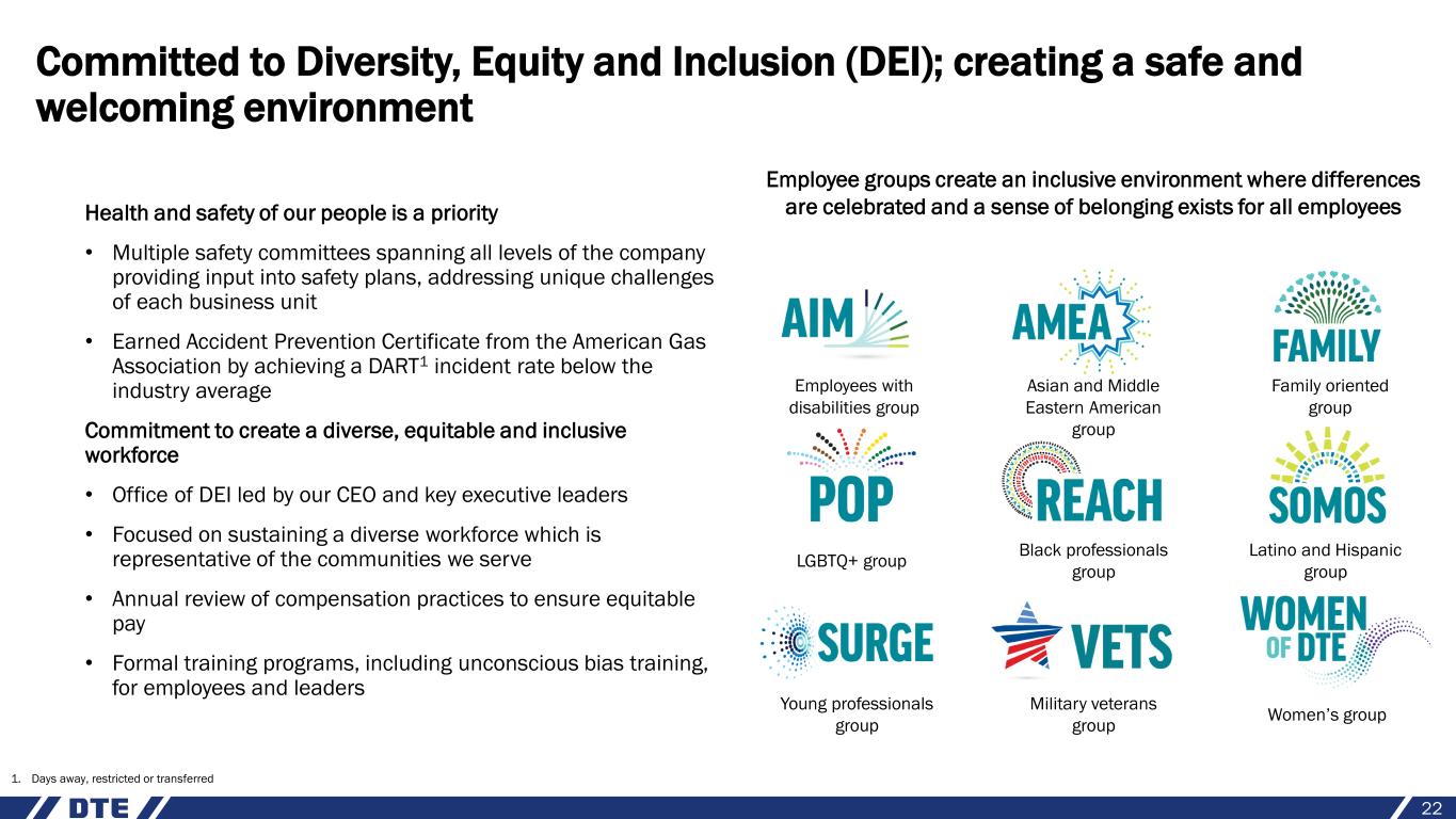 致力于多元化、公平和包容(DEI);创造一个安全和温馨的环境我们的员工的健康和安全是优先事项•跨越公司各级的多个安全委员会为安全计划提供投入,应对每个业务部门的独特挑战•通过实现低于行业平均水平的DART1事故率获得美国天然气协会的事故预防证书,承诺创造一个多元化的,公平和包容的员工队伍•由我们的首席执行官和主要行政领导领导的DEI办公室•专注于维持一支多元化的员工队伍,这支队伍能够代表我们所服务的社区•对薪酬做法进行年度审查,以确保公平薪酬•正式的培训计划,包括无意识的偏见培训,面向员工和领导者的残疾员工团体拉丁裔和西班牙裔团体年轻专业人士团体LGBTQ +团体黑人专业人士团体面向家庭的团体亚洲和中东美国团体退伍军人团体妇女团体员工团体创造一个包容的环境,庆祝差异并为所有员工建立归属感1。天数,限制或转让22