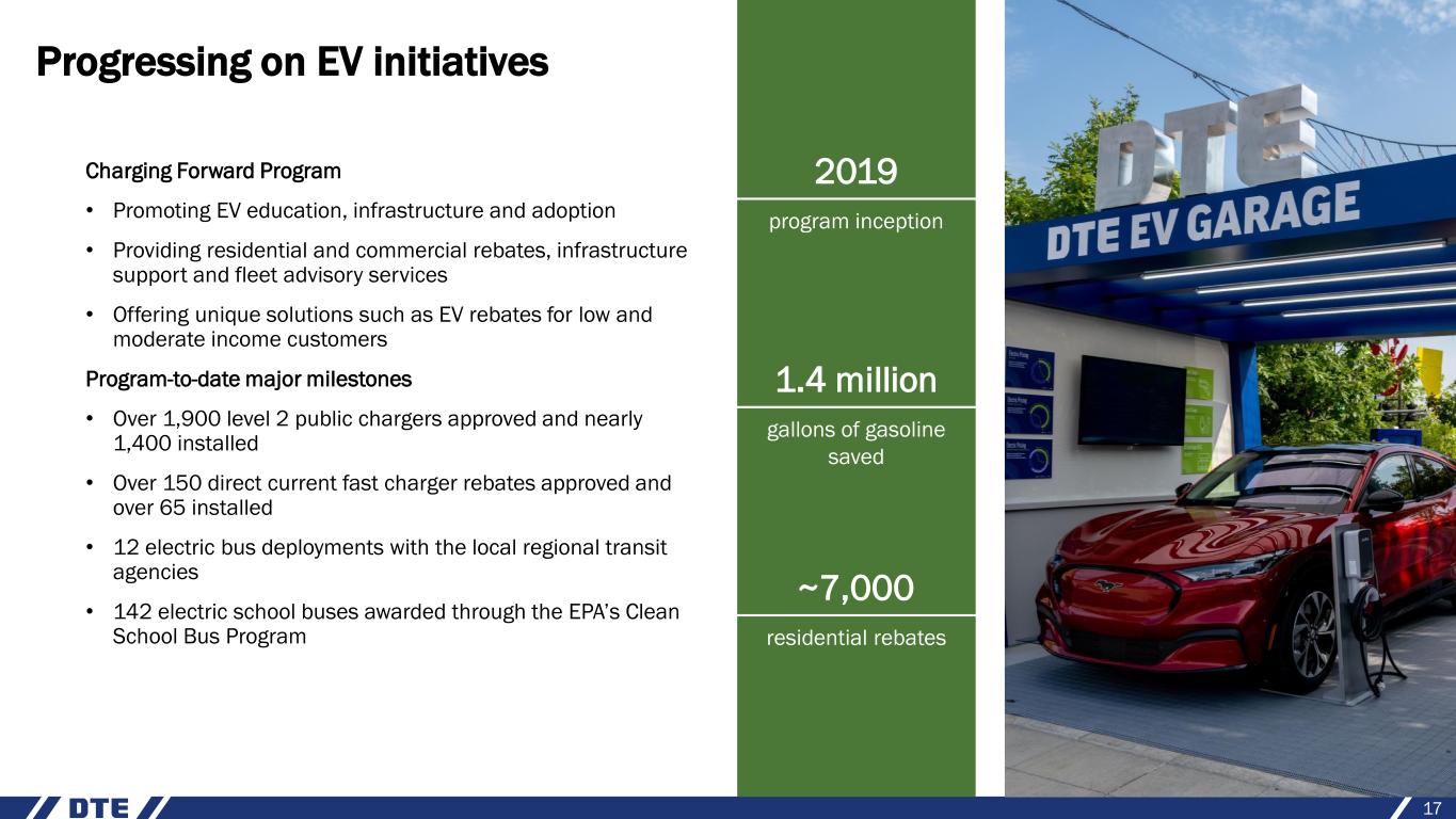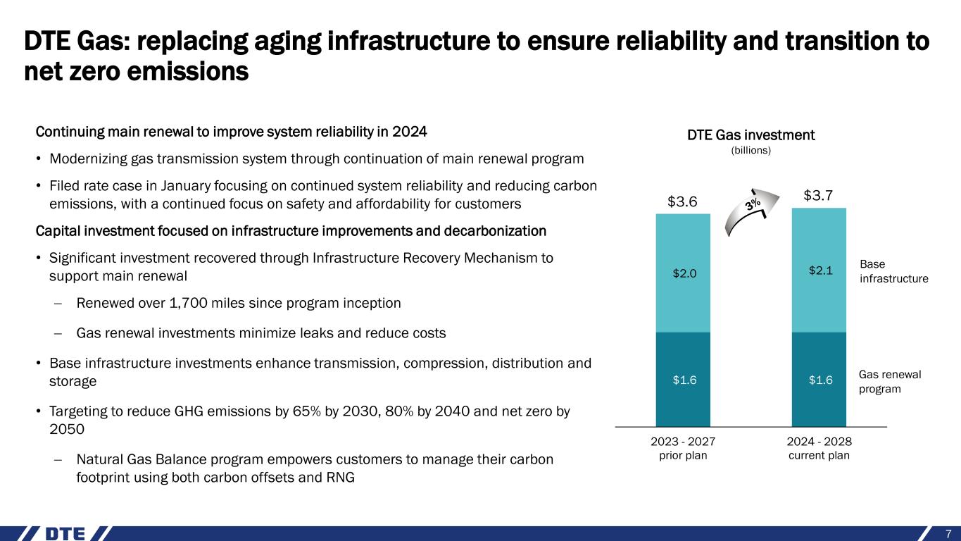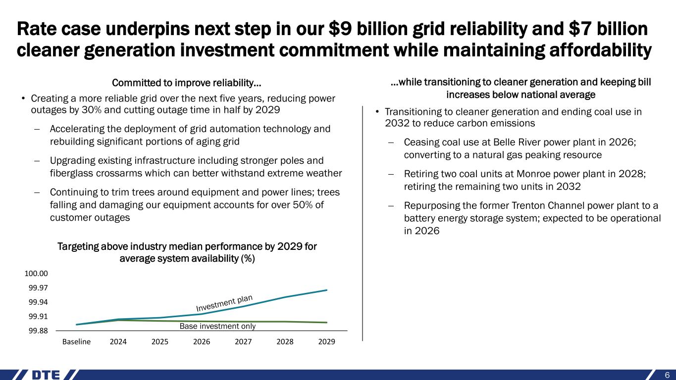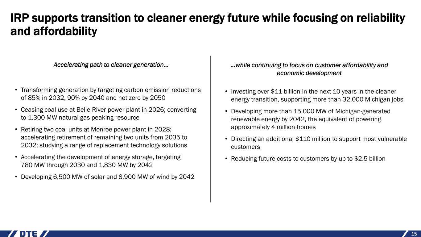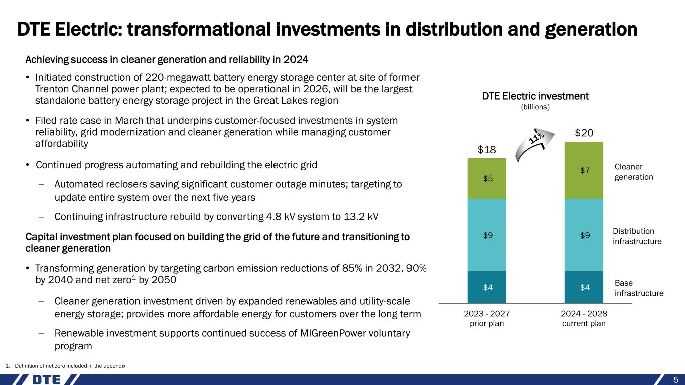 DTE电气:配电和发电领域的转型投资5美元4美元4美元9美元9美元5美元7 2023-2027年先前计划2024-2028年当前计划基础设施基础设施清洁发电18美元DTE电气投资(十亿)20美元配电基础设施1。附录中包含的净零的定义2024年在更清洁的发电和可靠性方面取得成功•在前特伦顿海峡发电厂现场开始建设220兆瓦电池储能中心;预计将于2026年投入运营,这将是Great Lakes地区最大的独立电池储能项目• 3月份的备案率案例,该案例为以客户为中心的系统可靠性投资提供了支持,电网现代化和清洁发电,同时管理客户负担能力•电网自动化和重建持续取得进展−自动化重合器可节省大量客户停电分钟;目标是在未来五年内更新整个系统−通过将4.8千伏系统转换为13.2千伏继续进行基础设施重建资本投资计划侧重于建设未来的电网并过渡到清洁发电•通过在2032年将碳排放量减少85%来改造发电,到2040年达到90%,到2050年达到净零-1 −由扩大的可再生能源和公用事业规模储能推动的清洁发电投资;长期为客户提供更多负担得起的能源−可再生投资支持MIGreenPower自愿计划的持续成功