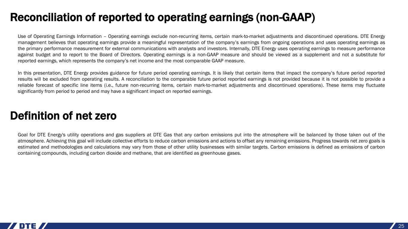 报告与营业收入(非公认会计准则)的对账25营业收入信息的使用–营业收入不包括非经常性项目、某些按市值调整和终止经营。DTE能源管理公司认为,经营收益可以有意义地代表公司来自持续经营的收益,并将经营收益作为与分析师和投资者进行外部沟通的主要业绩衡量标准。在内部,DTE能源使用营业收入来衡量与预算对比的业绩并向董事会报告。营业收入是一种非GAAP衡量标准,应被视为报告收益的补充而非替代,后者代表公司的净收入,也是最具可比性的GAAP衡量标准。在本演示文稿中,DTE能源为未来期间的经营收益提供指导。影响公司未来期间报告业绩的某些项目很可能将被排除在经营业绩之外。未提供与可比的未来期间报告收益的对账,因为无法提供对特定细列项目(即未来非经常性项目、某些按市值调整和终止经营)的可靠预测。这些项目可能会在不同时期大幅波动,并可能对报告的收益产生重大影响。对于DTE能源的公用事业运营和DTE燃气供应商的净零目标的定义是,任何排放到大气中的碳排放都将与那些从大气中排出的碳排放相平衡。实现这一目标将包括减少碳排放的集体努力和抵消任何剩余排放的行动。实现净零目标的进展是估计的,方法和计算可能与具有类似目标的其他公用事业企业的方法和计算有所不同。碳排放定义为被确定为温室气体的含碳化合物的排放,包括二氧化碳和甲烷。