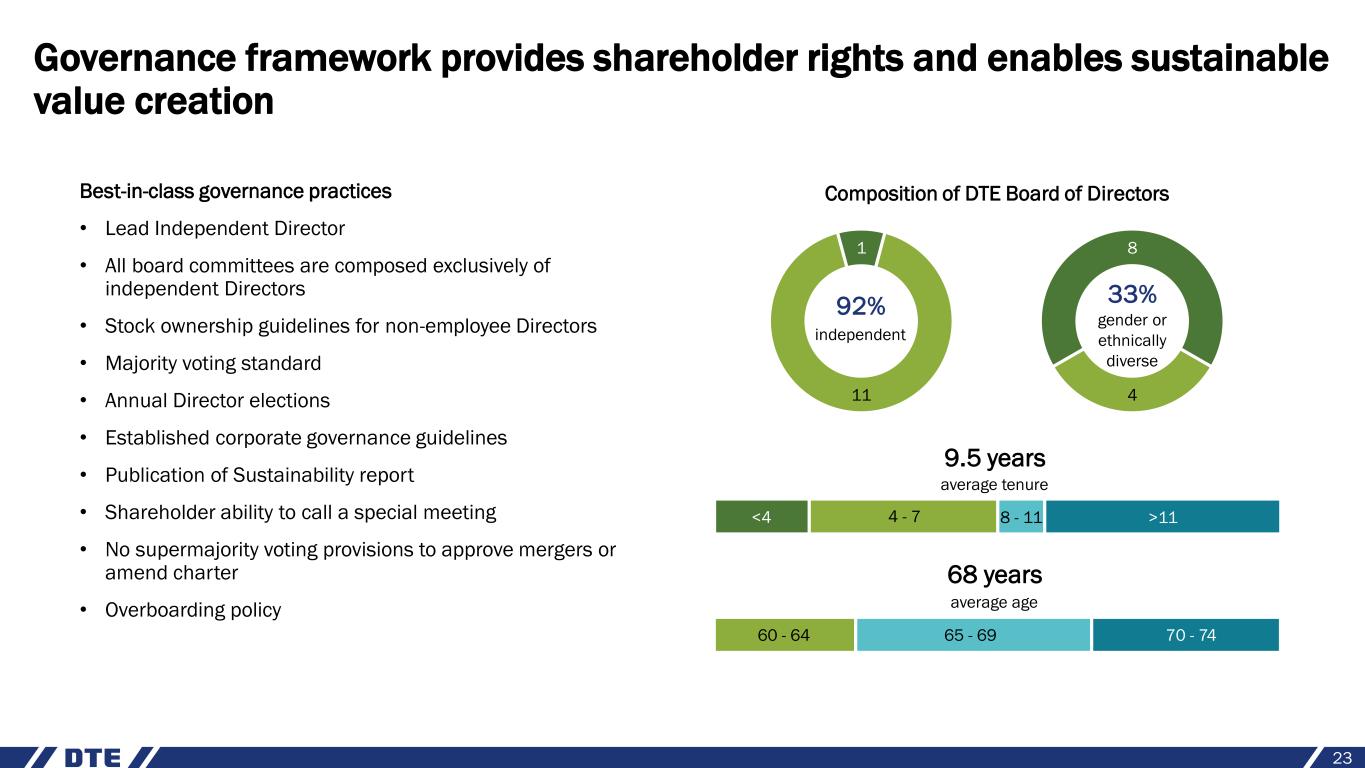 9.5年平均任期4-7 8-11 > 11治理框架提供股东权利并实现可持续价值创造一流治理实践•首席独立董事•所有董事会委员会完全由独立董事组成•股票所有权准则面向非雇员董事•多数投票标准•年度董事选举•确立公司治理准则•发布可持续发展报告•股东召集特别会议的能力•没有批准合并或修改章程的绝对多数投票规定•过度支配政策11192%独立4833%性别或种族多元化65-6970-7460-6468岁平均年龄< 423 DTE董事会组成