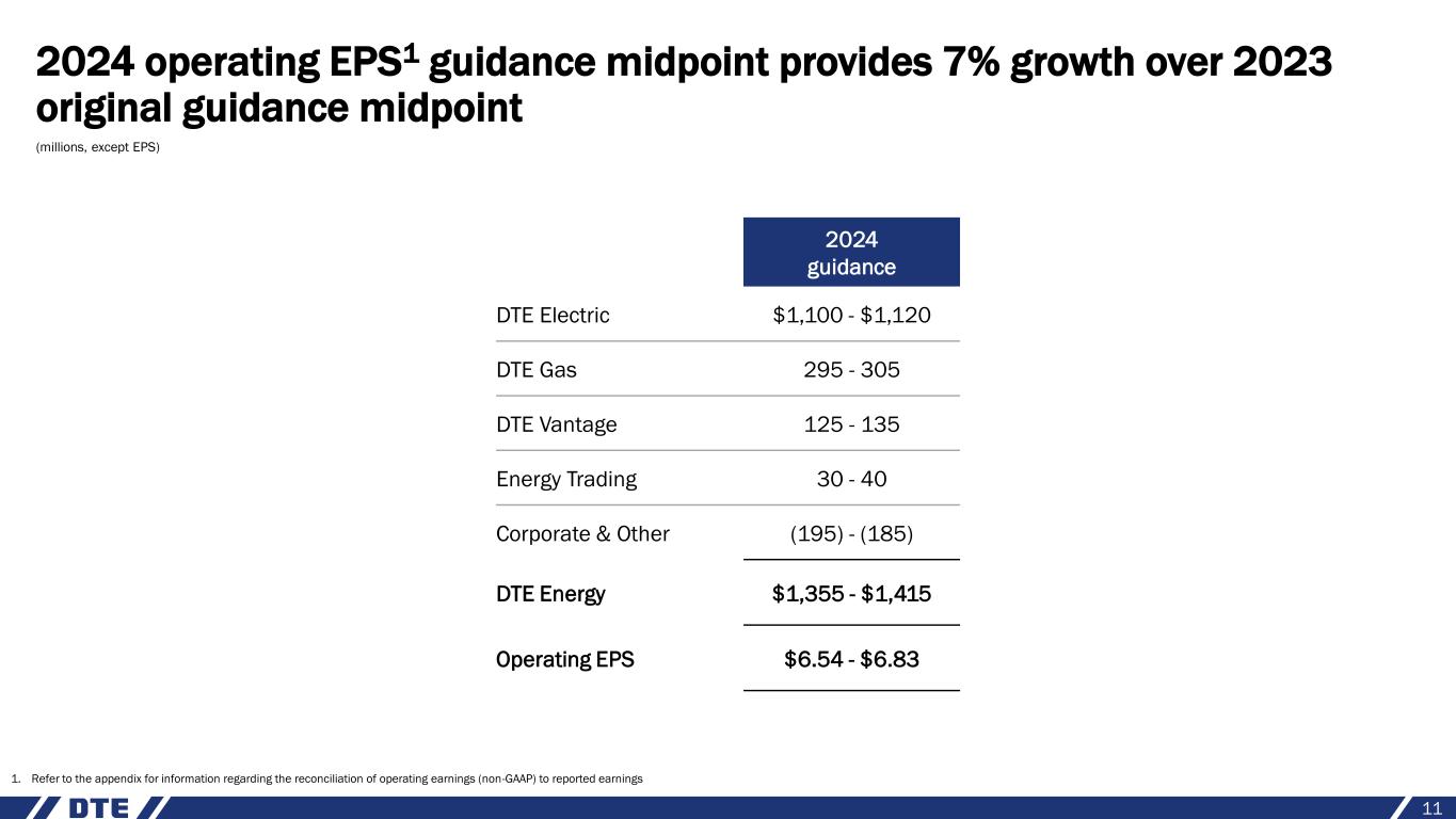 2024年营运每股收益1指引中点较2023年原指引中点11(百万,EPS除外)增长7% 2024年指引DTE电气1100美元至1120美元DTE天然气295-305 DTE Vantage 125-135 Energy Trading 30-40 Corporate & Other(195)-(185)DTE Energy 1,355美元至1,415美元营运每股收益6.54美元至6.83美元1。有关运营收益(非GAAP)与报告收益的对账信息,请参阅附录