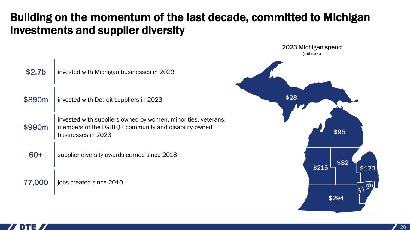 2023年向密歇根州企业投资2.7b美元2023年向底特律供应商投资8.9亿美元2023年向妇女、少数族裔、退伍军人、LGBTQ +社区成员和残疾人拥有的企业拥有的供应商投资9.9亿美元自2018年以来获得60 +供应商多样性奖自2010年以来创造了77,000个工作岗位基于过去十年的势头,致力于密歇根州投资和供应商多样性28美元95美元215美元82美元120美元294美元2023年密歇根州支出(百万)20