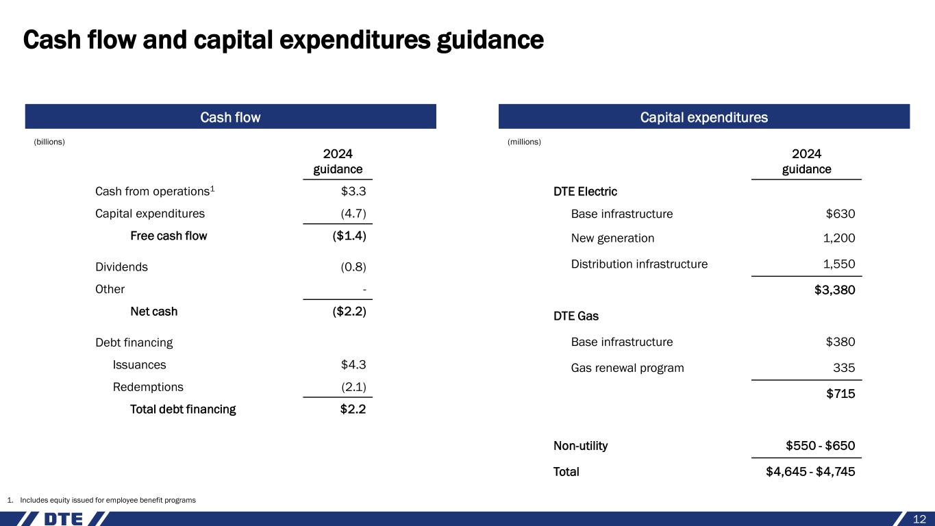 2024年指导DTE电气基础设施630美元新一代1200美元配电基础设施1550美元3380美元DTE燃气基础设施380美元天然气更新计划335美元715美元非公用事业550美元-650美元总计4,645美元-4,745美元2024年指导运营现金1美元3.3美元资本支出(4.7)自由现金流(1.4美元)股息(0.8美元)其他-净现金(2.2美元)债务融资发行4.3美元赎回(2.1)债务融资总额2.2美元现金流和资本支出指导12(百万)现金流资本支出(十亿)1。包括为员工福利计划发行的股权