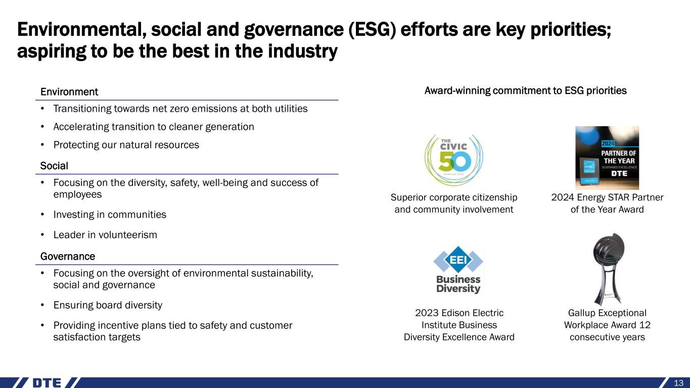 卓越的企业公民意识和社区参与2023爱迪生电气学院商业多样性卓越奖环境、社会和治理(ESG)努力是关键优先事项;渴望成为行业中的最佳环境•两家公用事业公司向净零排放过渡•加速向清洁发电过渡•保护我们的自然资源社会•关注员工的多样性、安全、福祉和成功•投资社区•志愿服务治理的领导者•关注环境可持续性的监督,社会和治理•确保董事会多样性•提供与安全和客户满意度目标相关的激励计划13项对ESG优先事项的获奖承诺盖洛普卓越工作场所奖连续12年2024年能源之星年度合作伙伴奖