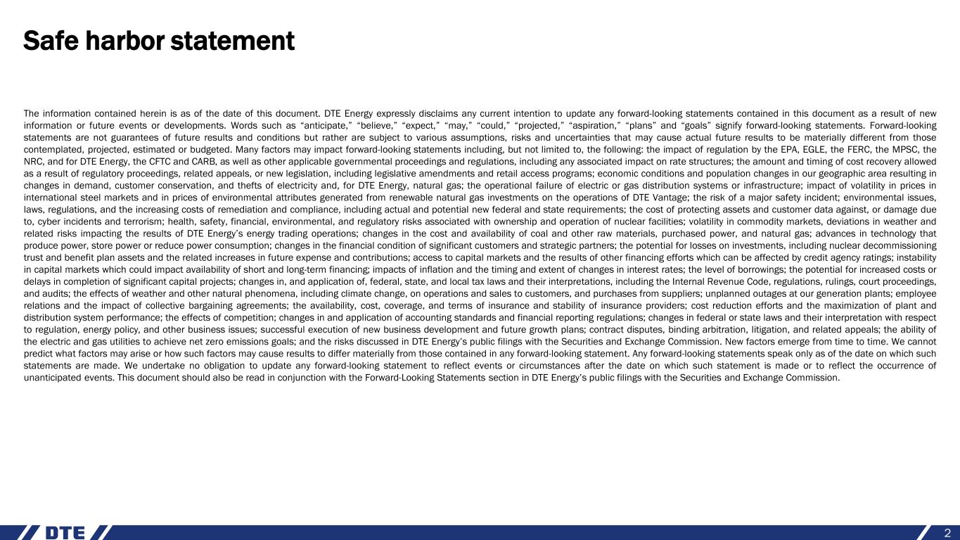 Safe Harbor Statement 2此处包含的信息截至本文件发布之日。DTE Energy明确表示,目前不打算因新信息或未来事件或发展而更新本文件中包含的任何前瞻性陈述。诸如“预期”、“相信”、“预期”、“可能”、“可能”、“预计”、“期望”、“计划”和“目标”等词表示前瞻性陈述。前瞻性陈述不是对未来结果和条件的保证,而是受到各种假设、风险和不确定性的影响,这些假设、风险和不确定性可能导致未来的实际结果与预期、预测、估计或预算中的结果存在重大差异。许多因素可能会影响前瞻性陈述,包括但不限于:EPA、EGLE、FERC、MPSC、NRC的监管影响,对于DTE能源、CFTC和CARB,以及其他适用的政府程序和法规,包括对费率结构的任何相关影响;由于监管程序、相关上诉或新立法(包括立法修订和零售准入计划)而允许的成本回收的金额和时间;我们所在地理区域的经济条件和人口变化导致需求变化、客户节约和电力被盗,以及,对于DTE能源、天然气;电力或燃气分配系统或基础设施的运行故障;国际钢铁市场价格波动以及可再生天然气投资产生的环境属性价格对DTE Vantage运营的影响;重大安全事故的风险;环境问题、法律、法规以及日益增加的补救和合规成本,包括实际和潜在的新的联邦和州要求;保护资产和客户数据免受网络事件和恐怖主义影响或由此造成损害的成本;健康、安全、财务、环境、与核设施的所有权和运营相关的监管风险;大宗商品市场波动、天气偏差以及影响DTE能源交易业务结果的相关风险;煤炭和其他原材料、采购的电力和天然气的成本和可用性的变化;生产电力、储存电力或减少电力消耗的技术进步;重要客户和战略合作伙伴的财务状况变化;投资可能出现的损失,包括核退役信托和福利计划资产以及未来费用和缴款的相关增加;进入资本市场以及可能受到信贷机构评级影响的其他融资努力的结果;可能影响短期和长期融资可用性的资本市场不稳定;通货膨胀的影响以及利率变化的时间和程度;借款水平;重大资本项目完成的成本增加或延迟的可能性;联邦、州和地方税法及其解释的变化和适用,包括《国内税收法》、法规、裁决、法庭诉讼和审计;天气和其他自然现象(包括气候变化)对运营和向客户销售以及从供应商处采购的影响;我们发电站的非计划停电;员工关系和集体谈判协议的影响;保险提供商的可用性、成本、覆盖范围、保险条款和稳定性;降低成本的努力以及工厂和分销系统性能的最大化;竞争的影响;会计准则和财务报告法规的变化和应用;联邦或州法律的变化及其对法规、能源政策的解释,和其他业务问题;成功执行新业务发展和未来增长计划;合同纠纷、具有约束力的仲裁、诉讼以及相关上诉;电力和燃气公用事业实现净零排放目标的能力;以及DTE Energy向美国证券交易委员会提交的公开文件中讨论的风险。新的因素不时出现。我们无法预测可能会出现哪些因素,或者这些因素如何可能导致结果与任何前瞻性陈述中包含的结果存在重大差异。任何前瞻性陈述仅在做出此类陈述之日起生效。我们不承担更新任何前瞻性陈述以反映作出此类陈述之日之后的事件或情况或反映意外事件发生的义务。本文件还应与DTE Energy向美国证券交易委员会提交的公开文件中的前瞻性陈述部分一起阅读。