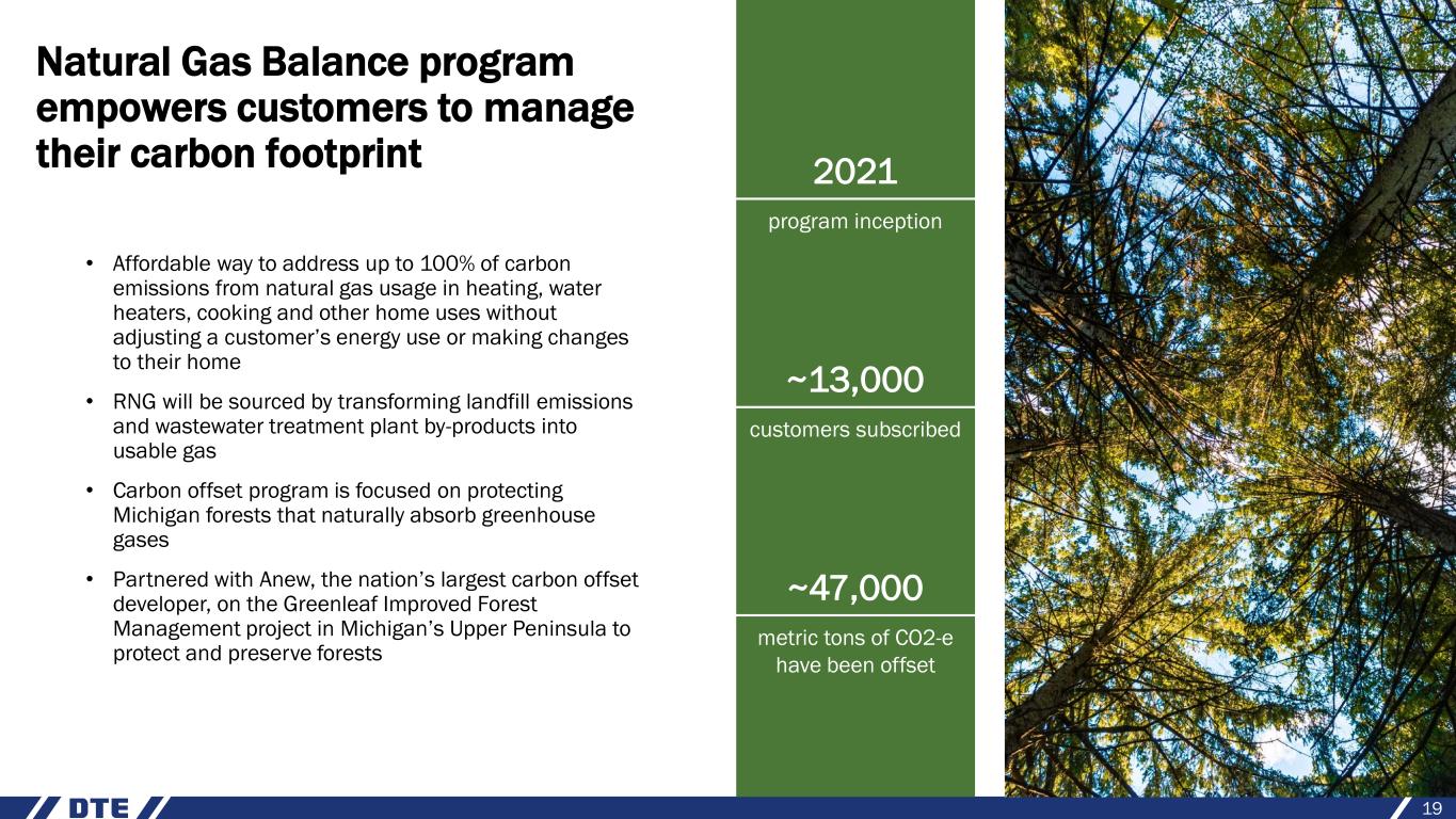 天然气平衡计划使客户能够管理他们的碳足迹•以经济实惠的方式解决供暖、热水器、烹饪和其他家庭用途中天然气使用产生的高达100%的碳排放,而无需调整客户的能源使用或对其家中进行更改• RNG的来源将通过将垃圾填埋场的排放物和废水处理厂的副产品转化为可用气体•碳补偿计划的重点是保护自然吸收温室气体的密歇根州森林•与美国最大的碳补偿开发商Anew合作,关于密歇根州上半岛的GreenLeaf改进森林管理项目,以保护和保护森林2021计划启动~13,000名客户订阅~47,000公吨CO2-e已被抵消19
