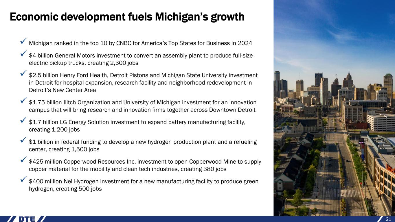 经济发展推动密歇根州增长丨密歇根州被CNBC评为2024年美国最佳商业州排名前10丨通用汽车投资40亿美元将一家装配厂改造成生产全尺寸电动皮卡,创造2300个就业岗位丨亨利福特健康公司、底特律活塞队和密歇根州立大学在底特律投资25亿美元用于医院扩建,底特律新中心区的研究设施和社区重建丨伊里奇组织和密歇根大学投资17.5亿美元建设创新园区,该园区将把底特律市中心的研究和创新公司聚集在一起丨LG能源解决方案投资17亿美元,用于扩大电池制造设施,创造1200个工作岗位丨10亿美元的联邦资金用于开发新的氢气生产厂和加油中心,创造1500个工作岗位丨4.25亿美元的Copperwood Resources Inc.投资开设Copperwood矿,为移动和清洁技术行业供应铜材料,创造380个工作岗位丨4亿美元Nel Hydrogen投资新制造设施生产绿色氢,创造500个工作岗位21