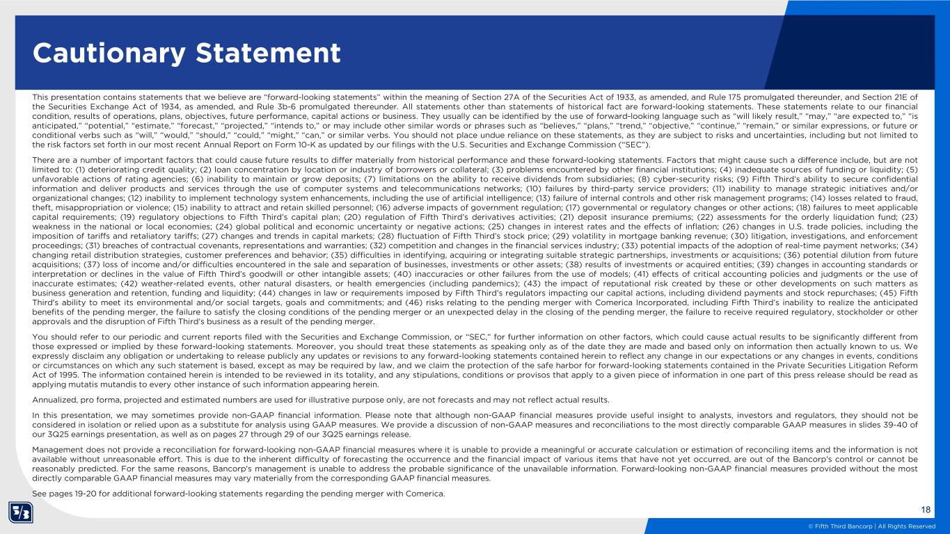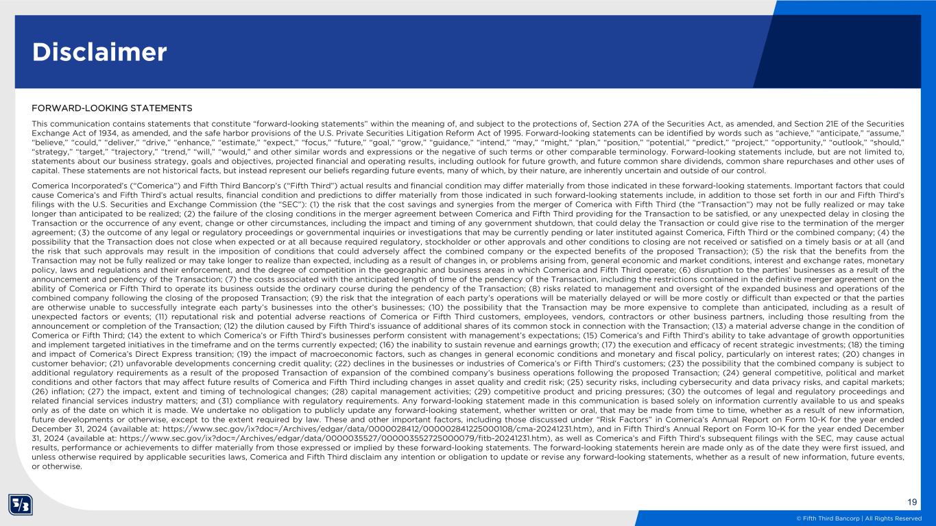 18©五三银行 |保留所有权利本演示文稿包含我们认为属于经修订的1933年证券法第27A条及其下颁布的规则175、经修订的1934年证券交易法第21E条及其下颁布的规则3b-6含义内的“前瞻性陈述”的陈述。除历史事实陈述外,所有陈述均为前瞻性陈述。这些报表涉及我们的财务状况、运营结果、计划、目标、未来业绩、资本行动或业务。它们通常可以通过使用前瞻性语言来识别,例如“will likely result”、“may”、“are expected to”、“is expected”、“potential”、“estimate”、“forecast”、“projected”、“intends to”,或者可能包括其他类似的词或短语,例如“believe”、“plans”、“trend”、“objective”、“continue”、“remain”或类似的表达方式,或未来或条件动词,例如“will”、“would”、“should”、“could”、“might”、“can”或类似的动词。您不应过分依赖这些声明,因为它们受到风险和不确定性的影响,包括但不限于我们最近提交给美国证券交易委员会(“SEC”)的文件更新的10-K表格年度报告中列出的风险因素。有许多重要因素可能导致未来的结果与历史业绩和这些前瞻性陈述存在重大差异。可能造成这种差异的因素包括,但不限于:(1)信用质量恶化;(2)借款人或抵押品按所在地或行业分类的贷款集中度;(3)其他金融机构遇到的问题;(4)资金或流动性来源不足;(5)评级机构的不利行为;(6)无法维持或增长存款;(7)子公司分红能力受限;(8)网络安全风险;(9)五三银行通过使用计算机系统保护机密信息和交付产品及服务的能力和电信网络;(10)第三方服务提供商出现故障;(11)无法管理战略举措和/或组织变革;(12)无法实施技术系统增强,包括使用人工智能;(13)内部控制和其他风险管理程序出现故障;(14)与欺诈、盗窃、挪用或暴力;(15)无法吸引和留住技术人才;(16)政府监管的不利影响;(17)政府或监管的变化或其他行为;(18)未能满足适用的资本要求;(19)监管机构对五三银行的资本计划提出异议;(20)监管五三银行的衍生品活动;(21)存款保险费;(22)对有序清算基金的评估;(23)国家或地方经济的疲软;(24)全球政治和经济的不确定性或负面行动;(25)利率变化和通货膨胀的影响;(26)美国贸易政策的变化,包括征收关税和报复性关税;(27)资本市场的变化和趋势;(28)五三银行股价的波动;(29)抵押银行业务收入的波动;(30)诉讼、调查和执行程序;(31)违反合同契约、陈述和保证;(32)金融服务业的竞争和变化;(33)采用实时支付网络的潜在影响;(34)改变零售分销策略、客户偏好和行为;(35)难以识别、获得或整合合适的战略合作伙伴关系,投资或收购;(36)未来收购的潜在稀释;(37)收入损失和/或在出售和分离业务、投资或其他资产时遇到的困难;(38)投资或被收购实体的结果;(39)会计准则变更或解释或五三银行的商誉或其他无形资产价值下降;(40)模型使用不准确或其他失败;(41)关键会计政策和判断的影响或使用不准确的估计;(42)与天气有关的事件、其他自然灾害、或突发卫生事件(包括流行病);(43)这些或其他发展造成的声誉风险对业务生成和保留、资金和流动性等事项的影响;(44)影响我们的资本行动的法律或由五三银行的监管机构施加的要求的变化,包括股息支付和股票回购;(45)五三银行实现其环境和/或社会目标、目标和承诺的能力;(46)与Comerica Incorporated的未决合并有关的风险,包括五三银行无法实现未决合并的预期收益, 未能满足未决合并的完成条件或未决合并的完成出现意外延迟,未能获得所需的监管、股东或其他批准,以及由于未决合并而扰乱了五三银行的业务。有关其他因素的进一步信息,您应该参考我们向美国证券交易委员会(SEC)提交的定期和当前报告,这些因素可能会导致实际结果与这些前瞻性陈述中明示或暗示的结果存在显着差异。此外,您应该将这些声明视为仅在做出这些声明之日发表,并且仅基于我们当时实际知道的信息。我们明确表示不承担任何义务或承诺公开发布对此处包含的任何前瞻性陈述的任何更新或修订,以反映我们预期的任何变化或任何此类陈述所依据的事件、条件或情况的任何变化,除非法律可能要求,我们主张保护1995年《私人证券诉讼改革法案》中包含的前瞻性陈述的安全港。此处包含的信息旨在进行整体审查,适用于本新闻稿某一部分中给定信息的任何规定、条件或但书应理解为比照适用于此处出现的此类信息的所有其他实例。年化、备考、预测和估计数字仅用于说明目的,并非预测,可能无法反映实际结果。在这个演示文稿中,我们有时可能会提供非GAAP财务信息。请注意,尽管非GAAP财务指标为分析师、投资者和监管机构提供了有用的见解,但不应孤立地考虑或依赖它们来替代使用GAAP指标进行的分析。我们在25年第三季度收益报告的幻灯片39-40以及25年第三季度收益报告的第27至29页中提供了关于非GAAP措施以及与最直接可比的GAAP措施的对账的讨论。如果管理层无法提供对账项目的有意义或准确的计算或估计,并且没有不合理的努力就无法获得信息,则管理层不会为前瞻性的非GAAP财务指标提供对账。这是由于预测发生的固有困难以及尚未发生、不在Bancorp控制范围内或无法合理预测的各种项目的财务影响。出于同样的原因,Bancorp的管理层无法解决无法获得的信息的可能意义。在没有最直接可比的GAAP财务指标的情况下提供的前瞻性非GAAP财务指标可能与相应的GA
