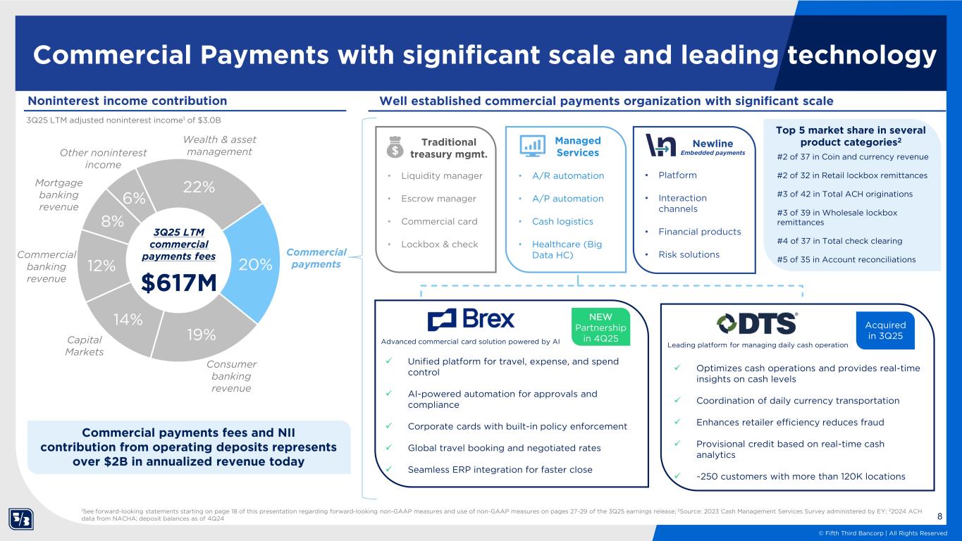 7©五三银行 |保留所有权利从头扩张带来强劲的存款增长和盈利能力随着从头网络的成熟,东南部在零售存款总额中的份额继续增长占零售存款总额的百分比东南投资以有吸引力的利率推动强劲的颗粒状零售存款增长有纪律的存款定价3Q25东南零售存款总成本84% 82% 77% 16% 18% 23% $ 0 $ 20 $ 40 $ 60 $ 80 $ 100201920222025中西部东南1.93% 4.46% x Avg。FF Rate 48296149 Peer Median Trillionaire Median x National Among Leaders in de novos built nationwide and in footprint 1096149 Peer Median Trillionaire Median x Total retail footprint2资料来源:标普 Capital IQ,内部管理层报告;注:截至2025年9月22日的分支机构数据,管理层报告反映截至2025年9月30日的数据;12025 FDIC数据上限为250mm美元,并针对2018年以来开设的de novos进行了过滤。并非所有de novos都已开业5年;2零售足迹包括MSA和截至2025年9月22日五三银行有活跃分支机构的县;3参看本演示文稿第18页的前瞻性陈述,这些陈述涉及2025年第三季度收益发布第27-29页的前瞻性非公认会计原则措施和非公认会计原则措施的使用。自2018年以来建立的De novos排名第4位第2位$ 0 $ 10 $ 20 $ 30 $ 40 $ 50年1年2年3年4年5 五三银行同行平均每年每个分行的从头存款1百万美元相对于竞争对手5年存款CAGR1 0.5% 1.8% 5.5%其他竞争对手万亿美元x总零售足迹21.0% 2.1% 12.1%其他竞争对手万亿美元x东南零售足迹2