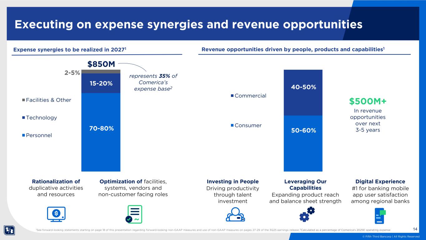 19©五三银行 |保留所有权利前瞻性陈述本通讯包含的陈述构成经修订的《证券法》第27A条、经修订的《1934年证券交易法》第21E条以及1995年美国《私人证券诉讼改革法案》的安全港条款含义内并受其保护的“前瞻性陈述”。前瞻性陈述可以通过“实现”、“预期”、“假设”、“相信”、“可以”、“交付”、“驱动”、“增强”、“估计”、“预期”、“专注”、“未来”、“目标”、“成长”、“指导”、“打算”、“可能”、“可能”、“计划”、“立场”、“潜力”、“预测”、“项目”、“机会”、“展望”、“应该”、“战略”、“目标”、“轨迹”、“趋势”、“将”、“将”等类似词语和表达方式或此类术语或其他类似术语的否定。前瞻性陈述包括但不限于关于我们的业务战略、目标和目的、预计财务和经营业绩的陈述,包括对未来增长的展望,以及未来的普通股股息、普通股回购和其他资本用途。这些陈述不是历史事实,而是代表我们对未来事件的信念,其中许多事件,就其性质而言,本质上是不确定的,不在我们的控制范围内。Comerica Incorporated(“联信银行”)和五三银行(“五三银行”)的实际结果和财务状况可能与这些前瞻性陈述中所示的存在重大差异。可能导致联信银行和五三银行的实际结果、财务状况和预测与此类前瞻性陈述中所示的存在重大差异的重要因素包括,除了我们和五三银行向美国证券交易委员会(“SEC”)提交的文件中所述的内容外:(1)联信银行与五三银行的合并(“交易”)产生的成本节约和协同效应可能无法完全实现或可能需要比预期更长的时间才能实现的风险;(2)联信银行与五三银行之间的合并协议中规定满足交易的成交条件未能满足,或完成交易的任何意外延迟或任何事件、变化或其他情况的发生,包括任何政府关闭的影响和时间,这可能会延迟交易或可能导致合并协议的终止;(3)目前未决或以后可能针对联信银行、五三银行或合并后公司提起的任何法律或监管程序或政府调查或调查的结果;(4)由于需要监管,交易没有按预期完成或根本没有完成的可能性,未及时或根本未收到或满足股东或其他批准及其他交割条件(以及此类批准可能导致施加可能对合并后公司或拟议交易的预期收益产生不利影响的条件的风险);(5)交易产生的收益可能无法完全实现或可能需要比预期更长的时间才能实现的风险,包括由于一般经济和市场条件、利率和汇率、货币政策、法律法规及其执行情况的变化或由此产生的问题,以及联信银行和五三银行经营所在的地理和业务领域的竞争程度;(6)由于交易的公告和未决而对各方的业务造成干扰;(7)与交易未决的预计时间长度相关的成本,包括最终合并协议中包含的关于在交易未决期间联信银行或五三银行在正常过程之外经营其业务的能力的限制;(8)在拟议交易完成后对合并后公司扩大后的业务和运营进行管理和监督的相关风险;(9)各方经营的整合将出现重大延迟或成本或难度高于预期的风险,或各方无法以其他方式成功地将各方的业务整合到对方的业务中;(10)可能性交易的完成成本可能高于预期,包括由于意外因素或事件造成的;(11)联信银行或五三银行的客户、员工、供应商、承包商或其他业务合作伙伴的声誉风险和潜在不良反应, 包括因该交易已公告或完成而导致的;(12)五三银行就该交易增发其普通股股份导致的稀释;(13)联信银行或五三银行的状况发生重大不利变化;(14)联信银行或五三银行的业务表现与管理层预期一致的程度;(15)联信银行和TERM5五三银行利用增长机会并在时间范围内和按照目前预期的条款实施有针对性举措的能力;(16)无法持续实现收入和盈利增长;(17)执行以及近期战略投资的成效;(18)联信银行直通快递转型的时机和影响;(19)宏观经济因素的影响,例如总体经济状况以及货币和财政政策的变化,特别是对利率的影响;(20)客户行为的变化;(21)有关信用质量的不利发展;(22)联信银行或五三银行客户的业务或行业下降;(23)合并后公司因拟议交易后扩大合并后公司业务运营的拟议交易而受到额外监管要求的可能性;(24)一般竞争性,可能影响联信银行和五三银行未来业绩的政治和市场条件以及其他因素,包括资产质量和信用风险的变化;(25)安全风险,包括网络安全和数据隐私风险,以及资本市场;(26)通货膨胀;(27)技术变革的影响、程度和时机;(28)资本管理活动;(29)竞争性产品和定价压力;(30)法律和监管程序以及相关金融服务业事项的结果;以及(31)是否符合监管要求。本通讯中所作的任何前瞻性陈述完全基于我们目前可获得的信息,并且仅在其发表之日发表。我们不承担公开更新可能不时作出的任何前瞻性陈述的义务,无论是书面的还是口头的,无论是由于新信息、未来发展或其他原因,除非在法律要求的范围内。这些及其他重要因素,包括联信银行截至2024年12月31日止年度的10-K表格年度报告(可在以下网址查阅:https://www.sec.gov/ix?doc=/archives/edgar/data/0000028412/000002841225000108/cma-20241231.htm)中“风险因素”项下所讨论的因素,以及五三银行截至2024年12月31日止年度的10-K表格年度报告(可在以下网址查阅:https://www.sec.gov/ix?doc=/archives/edgar/data/0000035527/000003552725000079/fitb-20241231.htm)中所讨论的因素,以及联信银行和五三银行随后的filfilfilfilfilfilfilfilfilfilfilfilfilfilf此处的前瞻性陈述