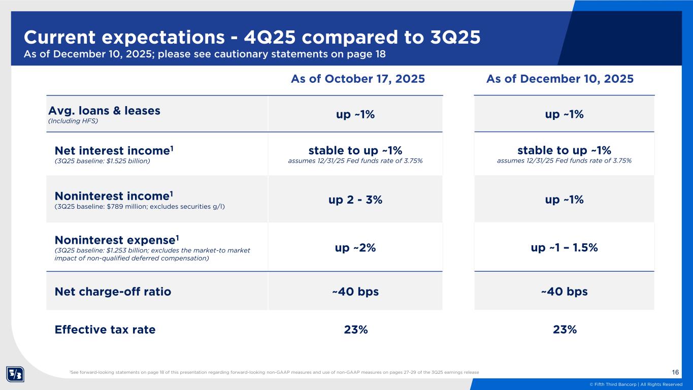 16©五三银行 |保留所有权利当前预期-截至2025年12月10日,25年第4季度与25年第3季度相比;请参阅第18页的警示性声明平均。贷款和租赁(包括HFS)上升~1%净利息收入1(25年第3季度基线:15.25亿美元)稳定至上升~1%假设12/31/25联邦基金利率为3.75%非利息收入1(25年第3季度基线:7.89亿美元;不包括证券g/l)上升2-3%非利息支出1(25年第3季度基线:12.53亿美元;不包括不合格递延补偿的市场对市场的影响)上升~2%净冲销比率~40个基点截至10月17日有效税率为23%,2025年上升~1%稳定至上升~1%假设12/31/25联邦基金利率为3.75%上升~1%上升~1 – 1.5%~40个基点23%截至2025年12月10日1见本演示文稿第18页有关前瞻性非公认会计原则措施和非公认会计原则措施使用的前瞻性陈述,见2015年第三季度收益发布第27-29页