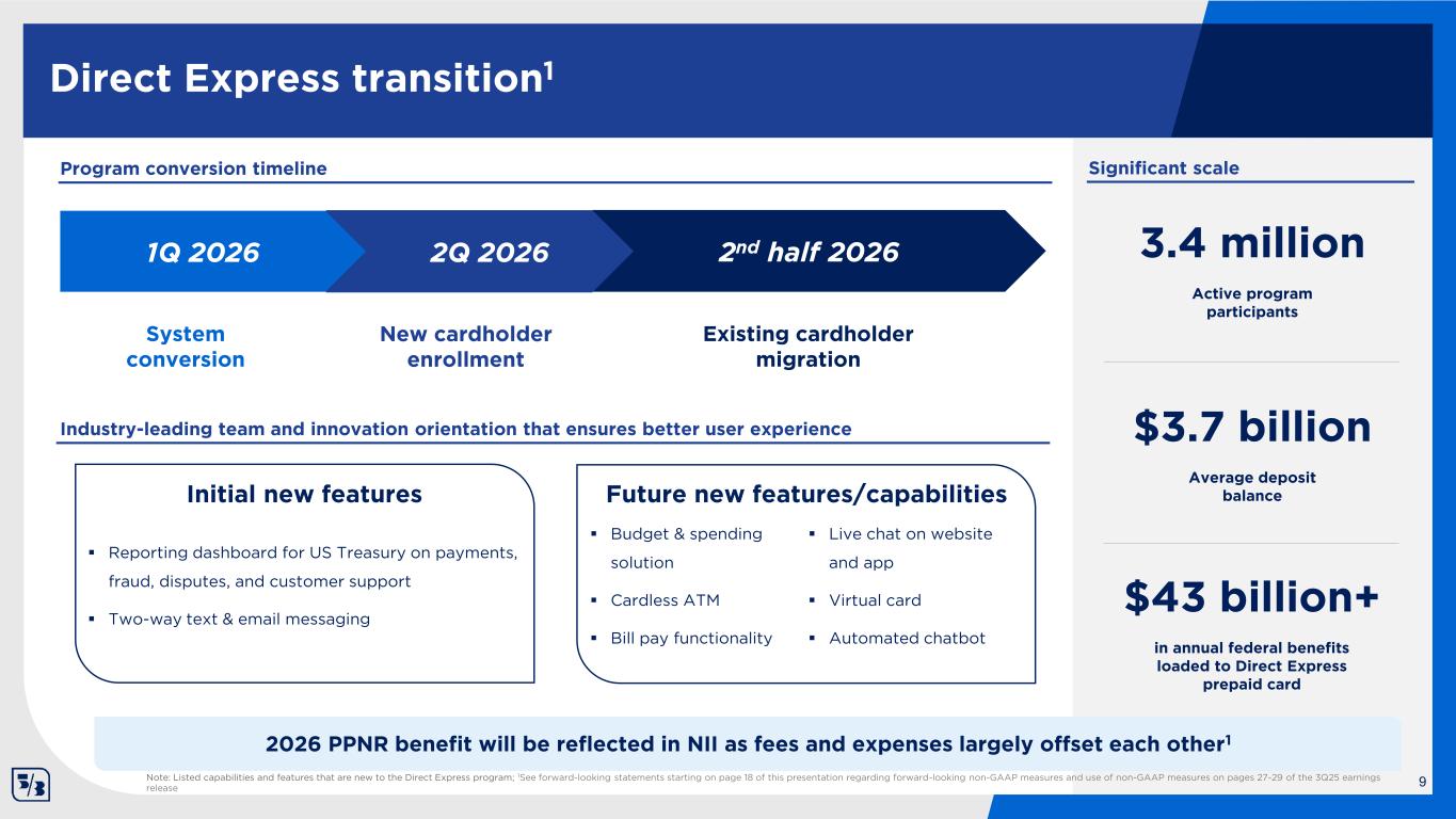 9直接快递转场1程序转换时间线340万活跃程序参与者行业领先的团队和创新导向,确保更好的用户体验未来新特性/能力▪预算和支出解决方案▪无卡ATM▪账单支付功能▪网站及app直播聊天▪虚拟卡▪自动聊天机器人2nd half 20262Q 20261Q 2026系统转换新持卡人注册现有持卡人迁移37亿美元平均存款余额430亿美元+年度联邦福利加载到Direct Express预付卡显着规模初始新功能▪美国财政部关于支付、欺诈、争端的报告仪表板,和客户支持▪双向文本和电子邮件消息2026 PPNR收益将反映在NII中,因为费用和支出在很大程度上相互抵消1注:列出的功能和特性是Direct Express计划的新功能;1请参阅本演示文稿第18页开始的前瞻性陈述,这些陈述涉及前瞻性的非GAAP措施和非GAAP措施的使用,请参见2015年第三季度收益发布的第27-29页