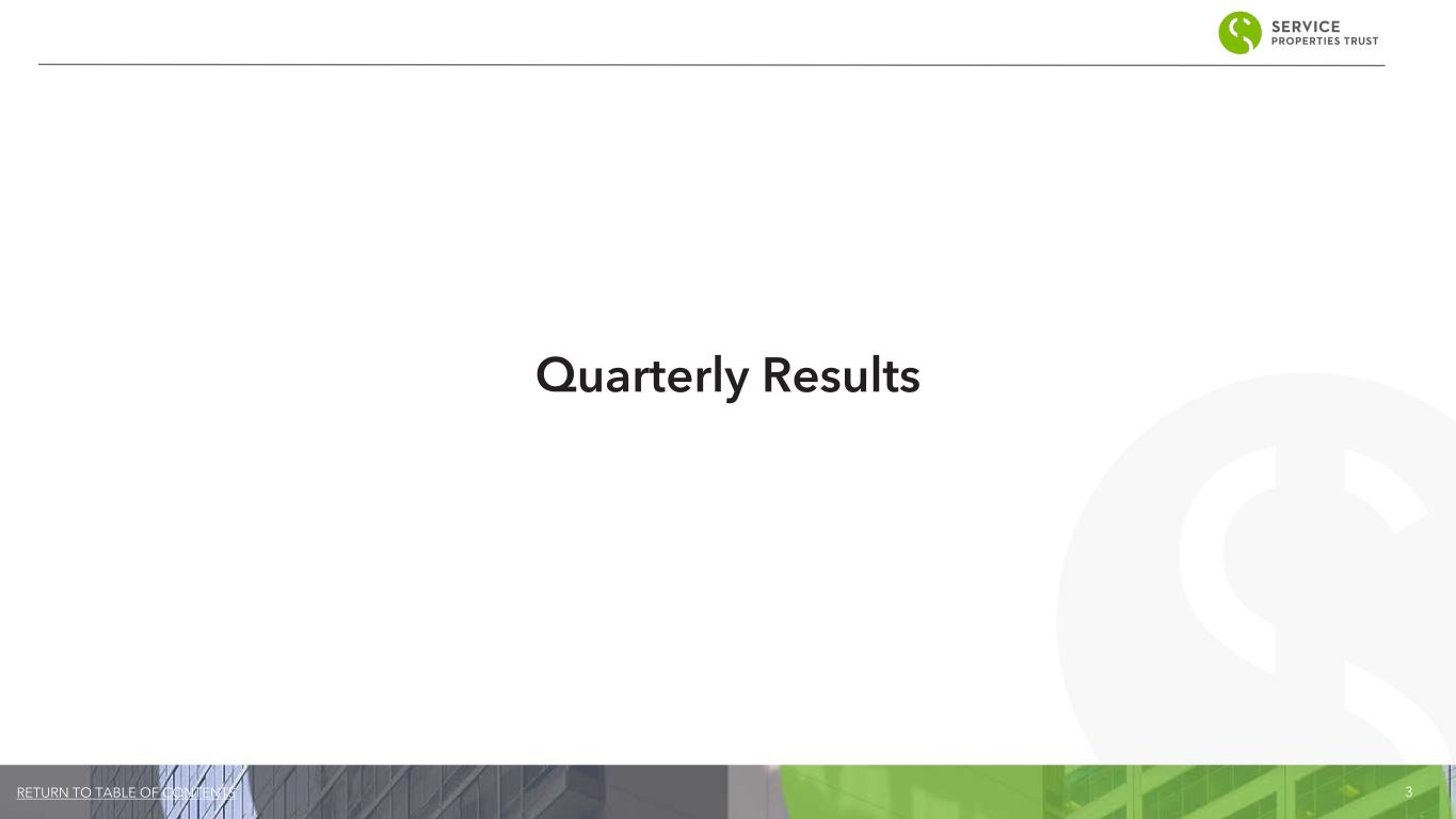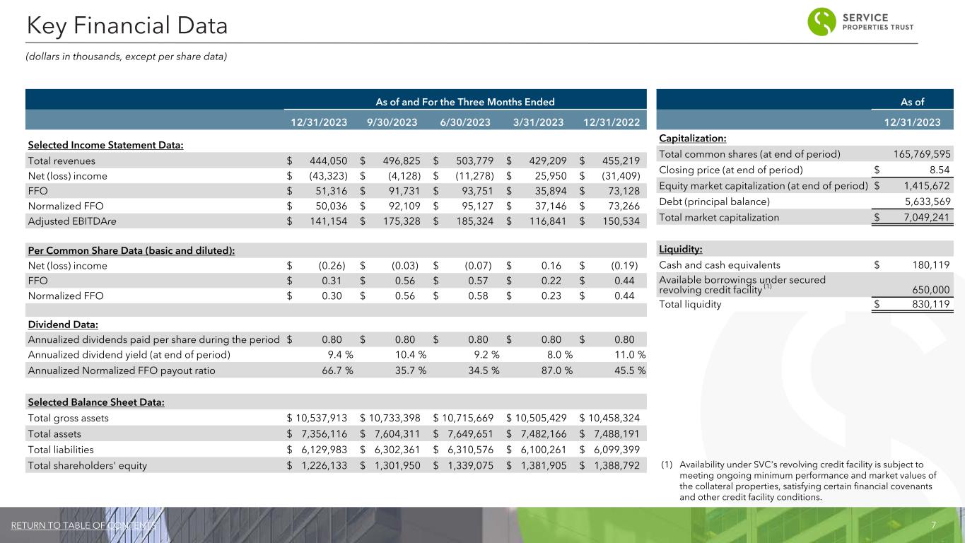 4重回目录马萨诸塞州牛顿市(2024年2月28日):Service Properties Trust(纳斯达克:SVC)今天公布了截至2023年12月31日的季度财务业绩。股息:SVC宣布向截至2024年1月22日收盘时登记在册的股东进行每股0.20美元的普通股季度分配。这笔分配于2024年2月15日支付。电话会议:将于美国东部时间2024年2月29日(星期四)上午10:00召开电话会议,讨论SVC第四季度业绩。电话会议可拨打(877)329-3720或(412)317-5434(如果从美国和加拿大境外拨打);不需要密码。可拨打(412)317-0088重播一周;重播密码6475223。SVC网站www.svcreit.com上还将以仅收听模式提供电话会议的现场音频网络广播。电话会议结束后,存档的网络广播将可在SVC的网站上重播。未经SVC事先书面同意,严禁以任何方式对SVC第四季度电话会议进行转录、录音和转播。关于Service Properties Trust:Service Properties Trust(纳斯达克:SVC)是一家房地产投资信托基金,简称REIT,拥有超过110亿美元的投资于两个资产类别:酒店和以服务为重点的零售净租赁物业。截至2023年12月31日,SVC在美国各地以及波多黎各和加拿大拥有221家酒店,客房数量超过3.7万间,其中大部分为长期住宿和精选服务。截至2023年12月31日,SVC还在全美拥有752处以服务为重点的零售净租赁物业,总面积约为1330万平方英尺。SVC由The RMR Group(纳斯达克:RMR)管理,该公司是一家另类资产管理公司,截至2023年12月31日,其管理的资产超过410亿美元,在购买、销售、融资和运营商业房地产方面拥有超过35年的机构经验。SVC总部位于马萨诸塞州牛顿市。欲了解更多信息,请访问www.svcreit.com。Service Properties Trust公布2023年第四季度财务业绩“SVC本季度的RevPAR表现符合我们的预期,并受到各种酒店装修活动的影响。我们预计,整个2024年投资组合的翻新活动将增加,我们认为,随着时间的推移,这将带来持续的运营改善。我们的净租赁投资组合继续提供由我们的TA租赁引领的可靠现金流,TA租赁由BP的投资级评级公司提供担保。在本季度为所有2024年到期债务进行再融资,同时保持强劲的流动性头寸后,我们已准备好通过战略资本项目执行我们对酒店进行再投资的计划。”Todd Hargreaves,总裁兼首席投资官