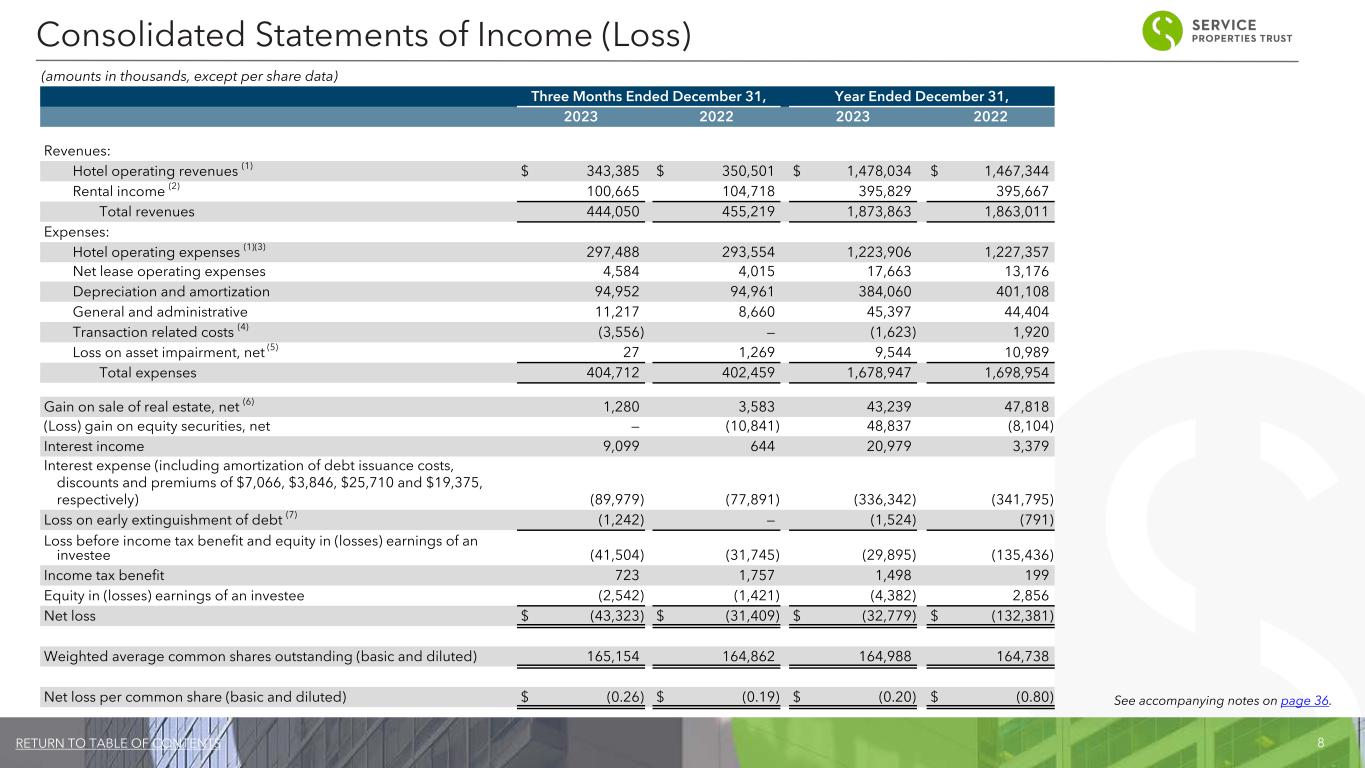 8返回目录截至12月31日的三个月、截至2023年12月31日的年度202220232022收入:酒店运营收入(1)343,385美元350,501美元1,478,034美元1,467,344租金收入(2)100,665104,718395,829395,667总收入444,050455,2191,873,8631,863,011费用:酒店运营费用(1)(3)297,488293,5541,223,9061,227,357净租赁运营费用4,5844,01517,66313,176折旧和摊销94,95294,961384,060401,108一般和行政11,2178,66045,39744,404交易相关成本(4)(3,净额(5)271,2699,54410,989费用总额404,712402,4591,678,9471,698,954出售房地产收益净额(6)1,2803,58343,23947,818(亏损)股本证券收益净额——(10,841)48,837(8,104)利息收入9,09964420,9793,379利息费用(包括债务发行成本摊销、折溢价7,066美元、3,846美元、25,710美元和19,375美元,分别)(89,979)(77,891)(336,342)(341,795)债务提前清偿损失(7)(1,242)—(1,524)(791)所得税前收益损失和被投资方收益(损失)中的权益(41,504)(31,745)(29,895)(135,436)所得税收益7231,7571,498 199被投资方收益(损失)中的权益(2,542)(1,421)(4,382)2,856净亏损$(43,323)$(31,409)$(32,779)$(132,381)加权平均已发行普通股(基本和稀释)165,154164,862164,988164,738每普通股净亏损(基本和稀释每股数据除外)合并损益表(亏损)见第36页附注。