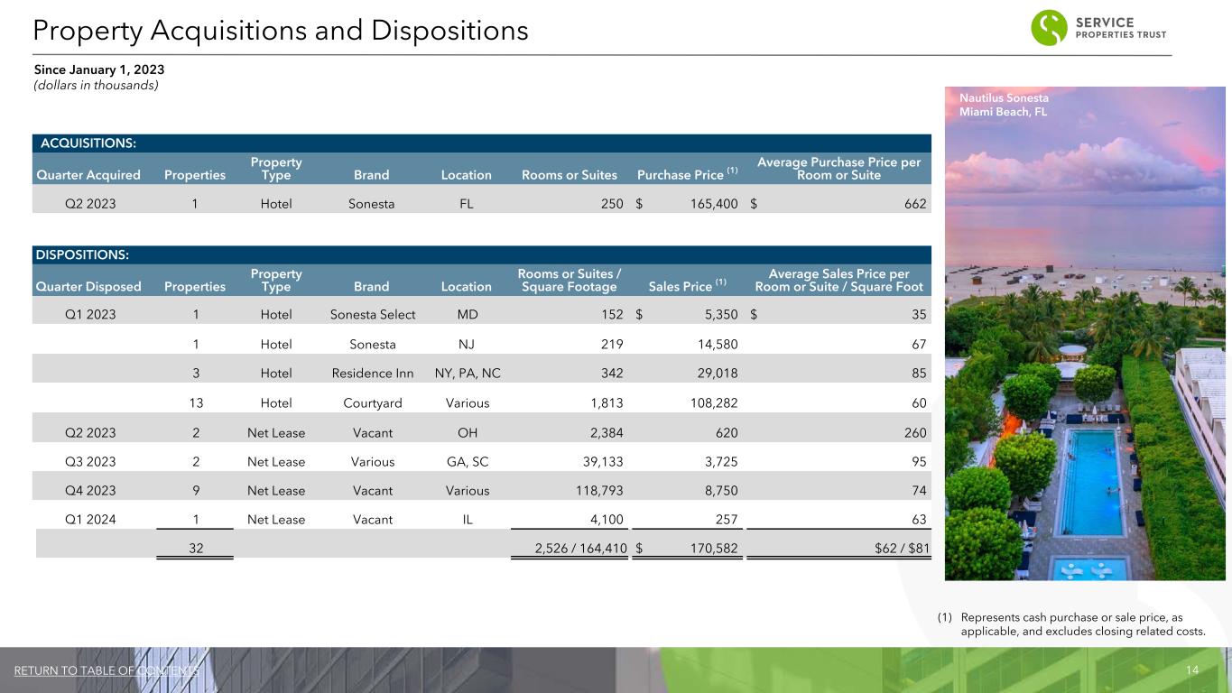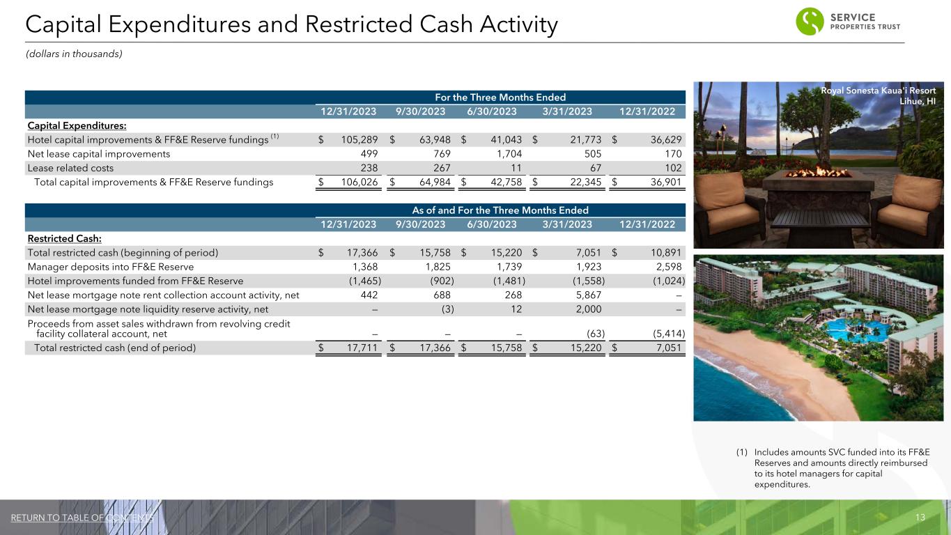 13截至12/31/20239/30/20236/30/20233/31/202312/31/2022资本支出:酒店资本改善和FF & E储备资金(1)105,289美元63,948美元41,043美元21,773美元36,629净租赁资本改善4997691,704505170租赁相关成本2382671167102资本改善和FF & E储备资金总额106,026美元64,984美元42,758美元22,345美元36,901美元截至截至12/31/2023/9/30/20236/30/20233/31/202312/31/2022受限制现金:受限制现金总额(期初)$ 17,366 $ 15,758 $ 15,220 $ 7,051 $ 10,891管理人存入FF & E Reserve的存款1,3681,8251,7391,9232,598由FF & E Reserve(1,465)(902)(1,481)(1,558)(1,024)净租赁抵押票据租金收取账户活动,净额4426882685,867 —净租赁抵押票据流动性储备活动,净额——(3)122,000 —从循环信贷融资抵押账户提取的资产出售收益,净额————(63)(5414)受限制现金总额(期末)17711美元17366美元15758美元15220美元7051美元(1)包括SVC资助到其FF & E准备金的金额以及直接偿还给其酒店管理人员的资本支出金额。(单位:千美元)资本支出和受限现金活动Royal Sonesta Kaua'i Resort Lihue,HI