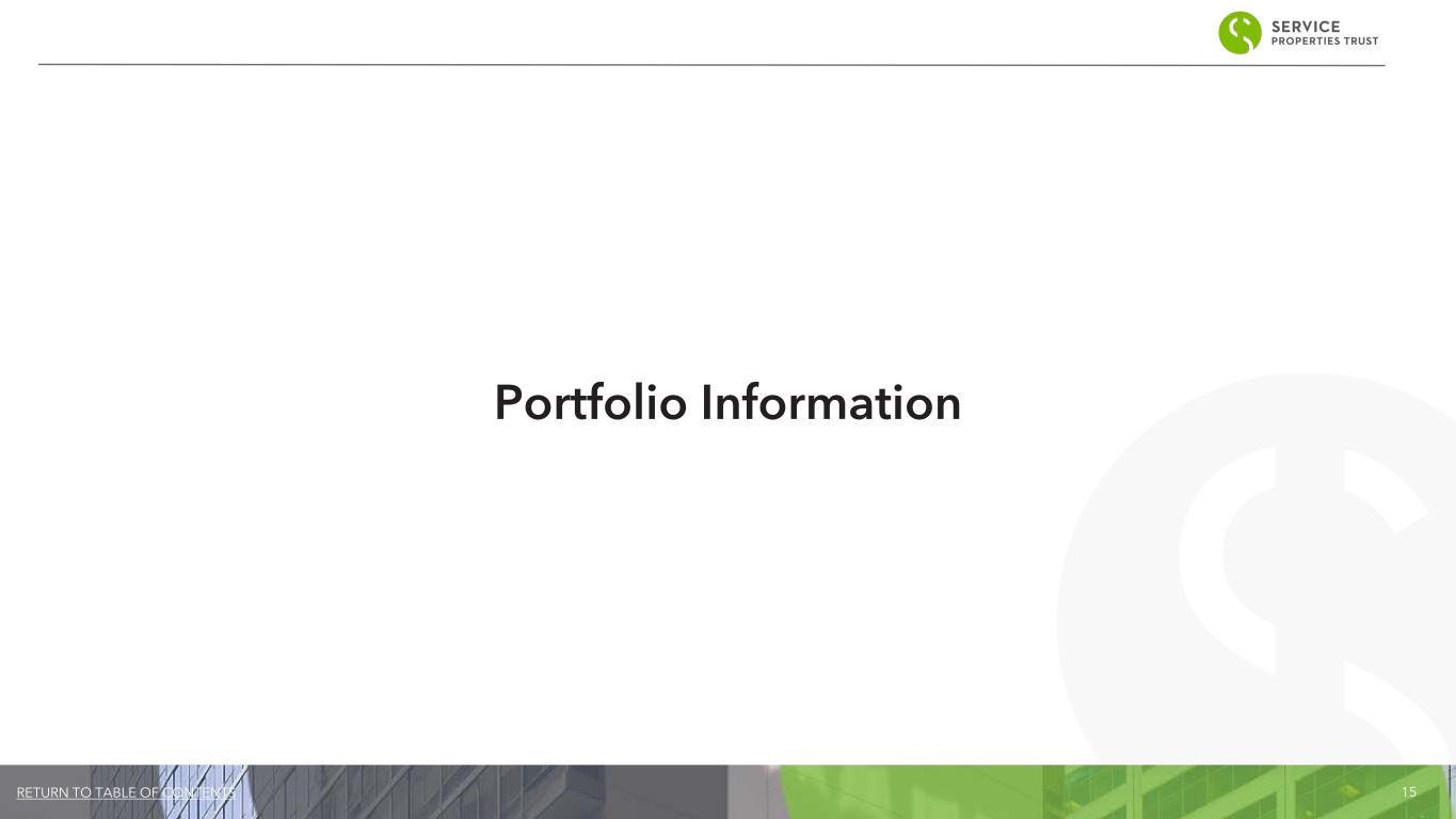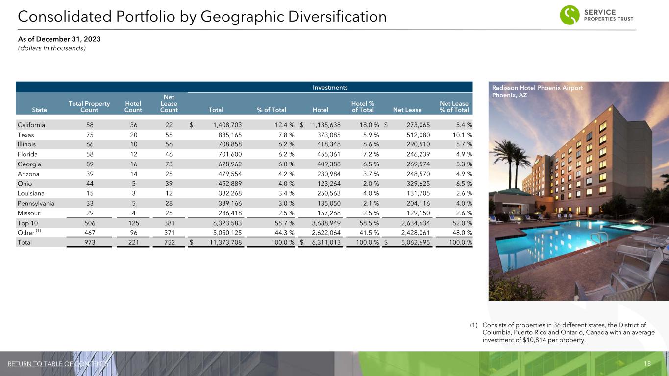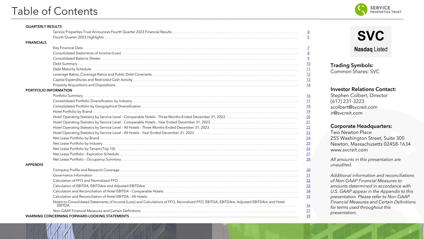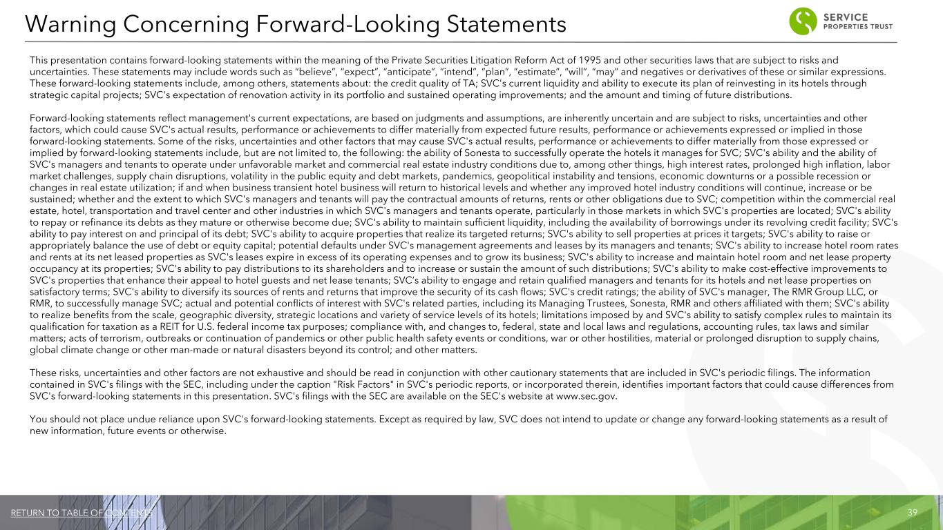 39返回目录本演示文稿包含1995年《私人证券诉讼改革法案》和其他受风险和不确定性影响的证券法含义内的前瞻性陈述。这些陈述可能包括“相信”、“预期”、“预期”、“打算”、“计划”、“估计”、“将”、“可能”等词语,以及这些或类似表述的否定或衍生。除其他外,这些前瞻性陈述包括以下方面的陈述:TA的信用质量;SVC目前的流动性和通过战略资本项目执行其酒店再投资计划的能力;SVC对其投资组合中的翻新活动和持续运营改善的预期;以及未来分配的数量和时间。前瞻性陈述反映了管理层当前的预期,基于判断和假设,具有内在的不确定性,并受到风险、不确定性和其他因素的影响,这可能导致SVC的实际结果、业绩或成就与这些前瞻性陈述中明示或暗示的预期未来结果、业绩或成就存在重大差异。可能导致SVC的实际结果、业绩或成就与前瞻性陈述明示或暗示的存在重大差异的一些风险、不确定性和其他因素包括但不限于:Sonesta成功运营其为SVC管理的酒店的能力;SVC的能力以及SVC的管理人员和租户在不利的市场和商业房地产行业条件下运营的能力,这些条件主要是由于高利率、长期高通胀、劳动力市场挑战、供应链中断、公共股权和债务市场波动、流行病等原因,地缘政治不稳定和紧张局势、经济衰退或房地产利用率可能出现衰退或变化;商业短暂酒店业务是否以及何时将恢复到历史水平,以及任何改善的酒店行业状况是否将继续、增加或持续;SVC的经理和租户是否以及在多大程度上将支付SVC应承担的回报、租金或其他义务的合同金额;SVC的经理和租户经营所在的商业房地产、酒店、交通和旅行中心以及其他行业内的竞争,特别是在SVC物业所在的市场;SVC在债务到期或以其他方式到期时偿还或再融资的能力;SVC保持充足流动性的能力,包括其循环信贷额度下借款的可用性;SVC支付其债务利息和本金的能力;SVC收购物业的能力实现其目标回报;SVC以其目标价格出售物业的能力;SVC筹集或适当平衡债务或股权资本使用的能力;SVC的管理协议和其经理和租户的租约下的潜在违约;SVC在SVC的租约到期时增加酒店房价和其净租赁物业租金的能力超过其运营费用并发展其业务;SVC增加和维持其物业的酒店房间和净租赁物业入住率的能力;SVC向其股东支付分配的能力以及增加或维持该等分配的金额;SVC对SVC的物业进行具有成本效益的改善以增强其对酒店客人和净租赁租户的吸引力的能力;SVC以令人满意的条款为其酒店和净租赁物业聘用和留住合格的经理和租户的能力;SVC使其租金和回报来源多样化以提高其现金流安全性的能力;SVC的信用评级;SVC的管理人、The RMR Group LLC或RMR成功管理SVC的能力;与SVC关联方的实际和潜在利益冲突,包括其管理受托人、Sonesta、RMR和其他与其有关联的机构;SVC从其酒店的规模、地理多样性、战略位置和多样的服务水平中实现收益的能力;受复杂规则施加的限制以及SVC满足复杂规则以维持其作为REIT就美国联邦所得税目的征税资格的能力;遵守和更改联邦、州和地方法律法规、会计规则、税法和类似事项;恐怖主义行为、流行病的爆发或持续或其他公共卫生安全事件或条件、战争或其他敌对行动,对供应链的实质性或长期中断、全球气候变化或其他超出其控制范围的人为或自然灾害;以及其他事项。这些风险, 不确定性和其他因素并非详尽无遗,应与SVC定期提交的文件中包含的其他警示性声明一起阅读。SVC向SEC提交的文件中包含的信息,包括SVC定期报告中“风险因素”标题下的信息,或纳入其中的信息,确定了可能导致与SVC在本演示文稿中的前瞻性陈述不同的重要因素。SVC向SEC提交的文件可在SEC网站www.sec.gov上查阅。你不应该过分依赖SVC的前瞻性陈述。除法律要求外,SVC不打算因新信息、未来事件或其他原因而更新或更改任何前瞻性陈述。有关前瞻性陈述的警告