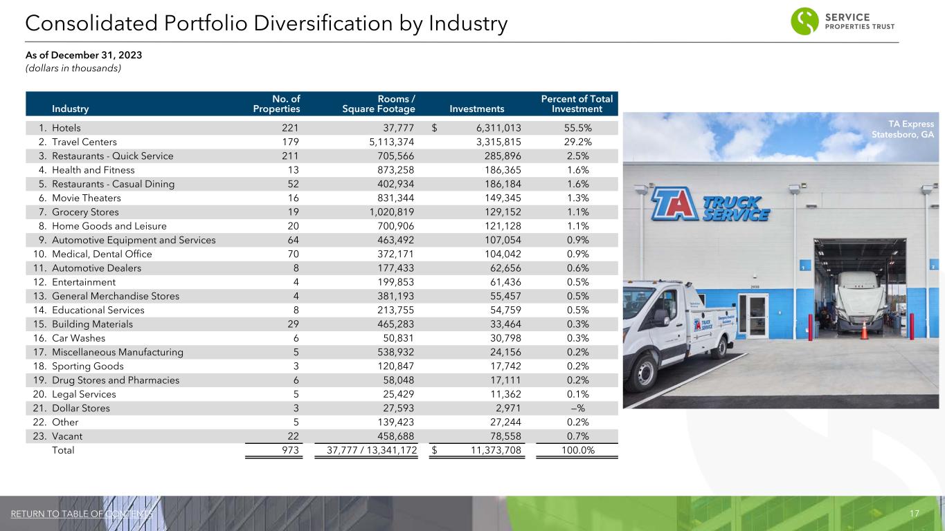17返回目录行业物业数量房间/平方英尺投资占总投资百分比1。酒店22137,777 $ 6,311,01355.5% 2。旅游中心1795,113,3743,315,81529.2% 3。餐厅-快速服务211705,566285,8962.5% 4。健康和健身13873,258186,3651.6% 5。餐厅-休闲餐饮52402,934186,1841.6% 6。电影院16831,344149,3451.3% 7。杂货店191,020,819129,1521.1% 8。家居用品及休闲20700,906121,1281.1% 9。汽车设备及服务64463,492107,0540.9% 10。医疗、牙科诊所70372,171104,0420.9% 11。汽车经销商8177,43362,656 0.6% 12。娱乐4199,85361,4360.5% 13。日用百货4381,19355,4570.5% 14。教育服务8213,75554,7590.5% 15。建筑材料29465,28333,4640.3% 16。洗车650,83130,7980.3% 17。杂项制造业5538,93224,1560.2% 18。体育用品3120,84717,7420.2% 19。药店药店658,04817,1110.2% 20。法律服务525,42911,3620.1% 21。一元店327,5932,971—% 22。其他5139,42327,2440.2% 23。空缺22458,68878,5580.7%总计97337,777/13,341,172 $ 11,373,708100.0%截至2023年12月31日按行业分类的综合投资组合多样化(千美元)TA Express Statesboro,GA