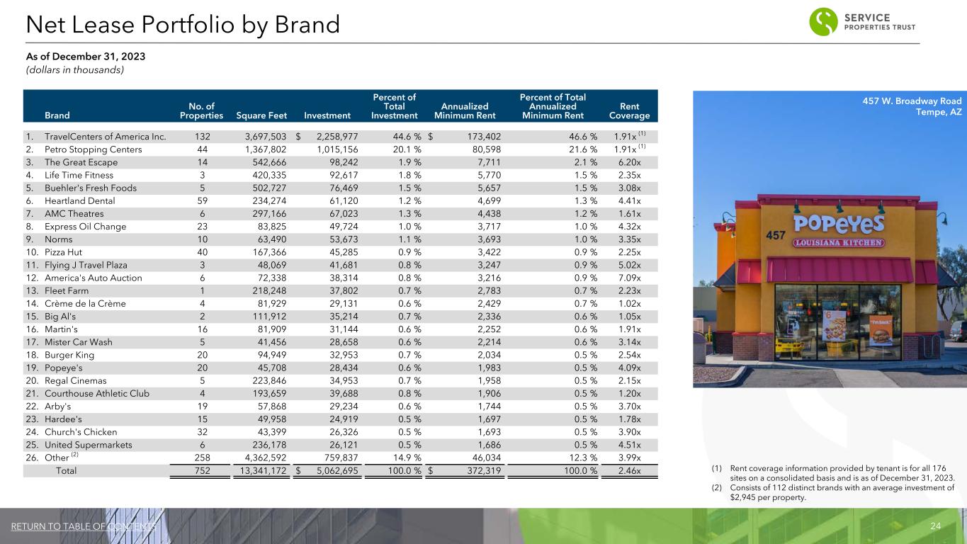 24RETURN to Table of Contents品牌号物业面积平方英尺投资占总投资的百分比年化最低租金占总年化最低租金覆盖率的百分比1。TravelCenters of America Inc. 1323,697,503 $ 2,258,97744.6% $ 173,40246.6% 1.91x(1)2。石油停车中心441,367,8021,015,15620.1% 80,59821.6% 1.91x(1)3。大逃亡14542,66698,2421.9% 7,7112.1% 6.20x4。生活时间健身 3420,33592,6171.8% 5,7701.5% 2.35x5。Buehler's Fresh Foods 5502,72776,4691.5% 5,6571.5% 3.08x6。Heartland Dental 59234,27461,1201.2% 4,6991.3% 4.41x7。AMC影院6297,16667,0231.3% 4,4381.2% 1.61x8。快机油变动2383,82549,7241.0% 3,7171.0% 4.32x9。规范1063,49053,6731.1% 3,6931.0% 3.35x10。必胜客40167,36645,2850.9% 3,4220.9% 2.25x11。飞J旅广场348,06941,68 10.8% 3,2470.9% 5.02x12。美国汽车拍卖672,33838,3140.8% 3,2160.9% 7.09x13。车队农场1218,24837,8020.7% 2,7830.7% 2.23x14。Cr è me de la Cr è me 481,92929,1310.6% 2,4290.7% 1.02x 15。大铝2111,91235,2140.7% 2,3360.6% 1.05x16。马丁1681,90931,1440.6% 2,2520.6% 1.91x17。Mister Car Wash 541,45628,6580.6% 2,2140.6% 3.14x18。Burger King 2094,94932,9530.7% 2,0340.5% 2.54x19。大力水手2045,70828,4340.6% 1,9830.5% 4.09x20。富豪院线5223,84634,9530.7% 1,9580.5% 2.15x21。Courthouse Athletic Club 4193,65939,688 0.8% 1,9060.5% 1.20x22。Arby's 1957,86829,2340.6% 1,7440.5% 3.70x23。哈迪1549,95824,9190.5% 1,6970.5% 1.78x24。Church's Chicken 3243,39926,3260.5% 1,693 0.5% 3.90x25。联合超市6236,17826,1210.5% 1,6860.5% 4.51x26。其他(2)2584,362,592759,83714.9% 46,03412.3% 3.99x总计75213,341,172 $ 5,062,695100.0% $ 372,319100.0% 2.46x(1)租户提供的租金覆盖信息是针对所有176个站点的综合基础,截至2023年12月31日。(2)由112个不同品牌组成,平均每个物业投资2945美元。截至2023年12月31日按品牌划分的净租赁组合(单位:千美元)457 W. Broadway Road Tempe,AZ