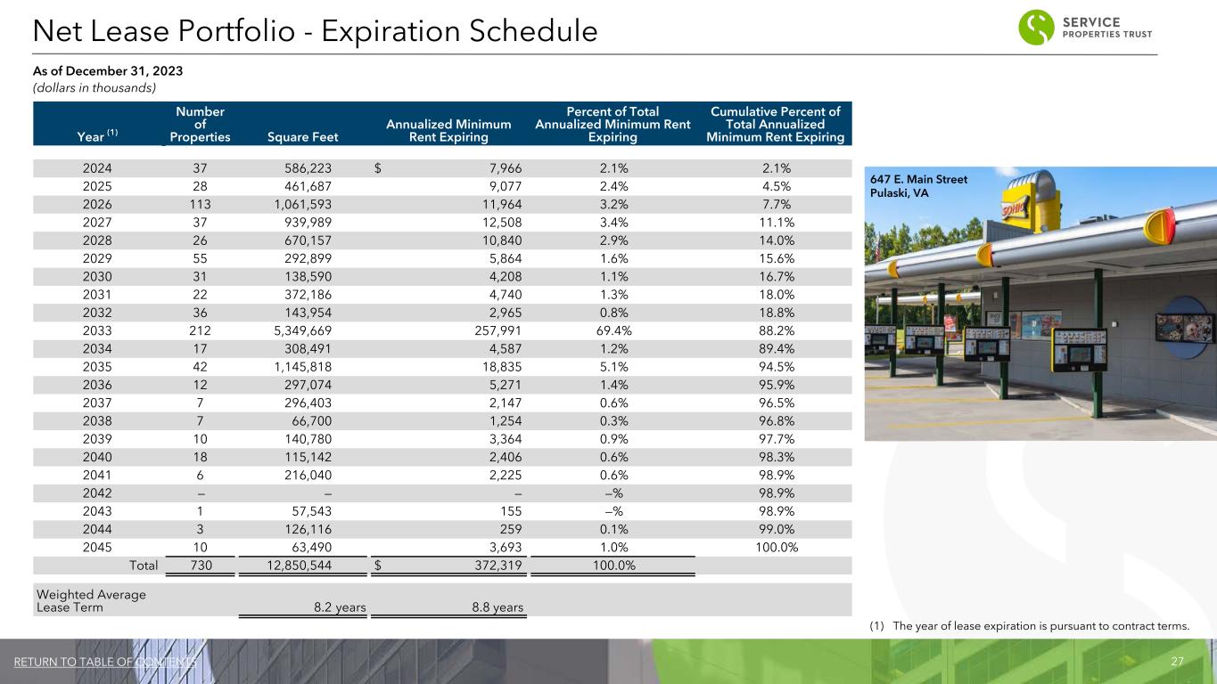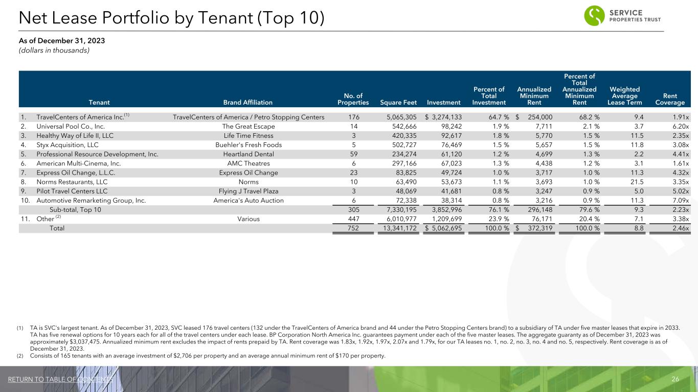26RETURN to TABLE CONTENTS租户品牌加盟物业数量平方英尺投资占总投资百分比年化最低租金占总年化最低租金加权平均租赁期限租金覆盖率1。TravelCenters of America Inc.(1)TravelCenters of America/Petro Stopping Centers 1765,065,305 $ 3,274,13364.7% $ 254,00068.2% 9.4 1.91x2。Universal Pool Co.,Inc. The Great Escape 14542,66698,2421.9% 7,7112.1% 3.7 6.20x3。Healthy Way of Life II,LLC 生活时间健身 3420,33592,6171.8% 5,7701.5% 11.5 2.35x4。Styx Acquisition,LLC Buehler's Fresh Foods 5502,72776,4691.5% 5,6571.5% 11.8 3.08x5。Professional Resource Development,Inc. Heartland Dental 59234,27461,1201.2% 4,6991.3% 2.2 4.41x6。American Multi-Cinema,Inc. AMC影院6297,16667,0231.3% 4,4381.2% 3.1 1.61x7。快机油变动,有限责任公司快机油变动2383,82549,7241.0% 3,7171.0% 11.3 4.32x8。Norms Restaurants,LLC Norms 1063,49053,6731.1% 3,6931.0% 21.5 3.35x9。Pilot Travel Centers LLC Flying J Travel Plaza 348,06941,68 10.8% 3,2470.9% 5.0 5.02x10。Automotive Remarketing Group,Inc. America's Auto Auction 672,33838,3140.8% 3,2160.9% 11.3 7.09x小计,top 10 3057,330,1953,852,99676.1% 296,14879.6% 9.3 2.23x 11。其他(2)各种4476,010,9771,209,69923.9% 76,17120.4% 7.1 3.38x合计75213,341,172 $ 5,062,695100.0% $ 372,319100.0% 8.8 2.46x(1)TA是SVC的最大租户。截至2023年12月31日,SVC根据五份于2033年到期的主租约向TA的一家子公司租赁了176个旅行中心(美国TravelCenters品牌132个,Petro Stopping Centers品牌44个)。TA对每个租约下的所有旅行中心都有5个10年的续订选项。BP Corporation North America Inc.保证根据五份主租赁中的每一份进行付款。截至2023年12月31日,担保总额约为3037475美元。年化最低租金剔除TA预付租金影响。我们TA租赁1号、2号、3号、4号和5号的租金覆盖率分别为1.83倍、1.92倍、1.97倍、2.07倍和1.79倍。租金覆盖范围截至2023年12月31日。(2)由165名租户组成,平均每间物业投资2706美元,平均每年最低租金为每间物业170美元。截至2023年12月31日按租户划分的净租赁组合(前10名)(单位:千美元)