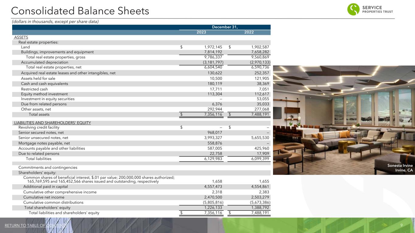 9返回目录合并资产负债表2023年12月31日2022资产不动产:土地$ 1,972,145 $ 1,902,587建筑物、装修和设备7,814,1927,658,282不动产总额,毛额9,786,3379,560,869累计折旧(3,181,797)(2,970,133)不动产总额,净额6,604,5406,590,736取得的不动产租赁和其他无形资产净额130,622252,357持有待售资产10,500121,905现金及现金等价物180,11938,369受限制现金17,7117,051权益法投资113,304112,617权益证券投资— 53,055应收关联人款6,37635,033其他资产,净额292,944277,068总资产$ 7,356,116 $ 7,488,191负债和股东权益循环信贷额度$ — $ —优先有担保票据,净额968,017 —优先无担保票据,净额3,993,3275,655,530应付抵押票据,净额558,876 —应付账款和其他负债587,005425,960应付关联人款22,75817,909负债总额6,129,9836,099,399承诺和或有事项股东权益:实益权益普通股,面值0.01美元;授权200,000,000股;已发行和流通股165,769,595和165,452,566股,分别为1,6581,655追加实收资本4,557,4734,554,861累计其他综合收益2,3182,383累计净收益2,470,5002,503,279累计共同分配(5,805,816)(5,673,386)股东权益总额1,226,1331,388,792总负债和股东权益$ 7,356,116 $ 7,488,191(单位:千美元,每股数据除外)Sonesta Irvine Irvine,加利福尼亚州
